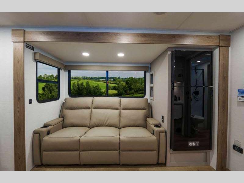Sleeps 4 Slides 2 Length 33 ft 11 in Ext Height 11 ft 3 in Hitch Weight 802 lbs GVWR 9450 lbs Dry Weight 7486 lbs Fresh Water Capacity 45 gals Grey Water Capacity 90 gals Black Water Capacity 45 gals Available Beds Queen Refrigerator Type 12V Refrigerator Size 10 cu ft Cooktop Burners 3 Shower Size 30" x 36" Number of Awnings 2 TV Info LR 50" TV Awning Info 10' and 21' Axle Count 2 Shower Type Standard Electrical Service 50 amp Solar Wattage 400 watts Similar Floorplans