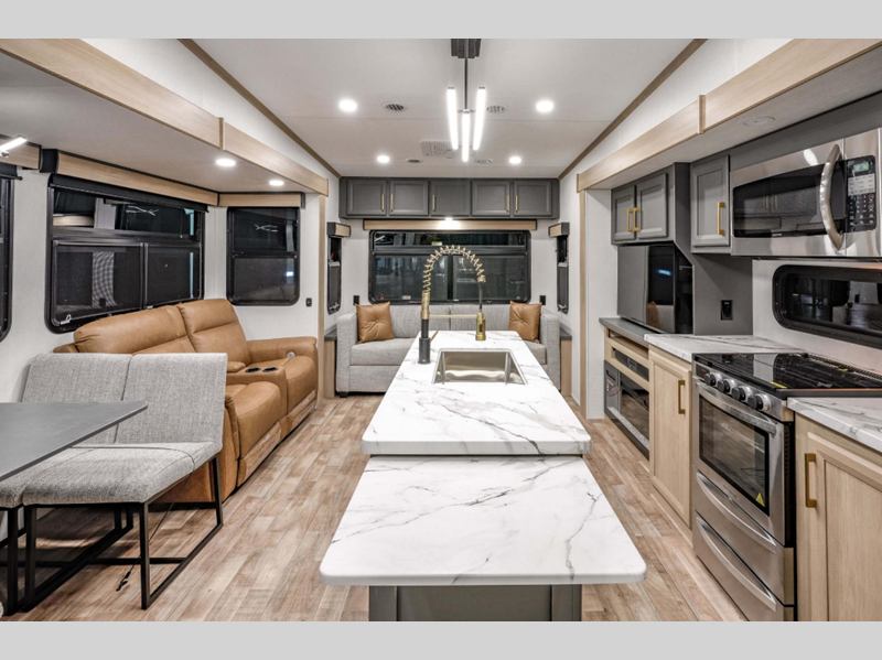 Sleeps 4 Slides 3 Length 35 ft 4 in Ext Width 8 ft Ext Height 12 ft 11 in Interior Color Mink Fresh Water Capacity 76 gals Grey Water Capacity 50 gals Black Water Capacity 50 gals Tire Size 16" Furnace BTU 35000 btu Available Beds King Refrigerator Type French Door 12V Refrigerator Size 12 cu ft Cooktop Burners 3 Shower Size 42" x 30" Number of Awnings 2 LP Tank Capacity 30 lbs Water Heater Type On Demand Tankless AC BTU 27000 btu TV Info LR 43" Smart LED TV Awning Info 16" and 11" Power w/LED Light Strip Axle Count 2 Washer/Dryer Available Yes Number of LP Tanks 2 Shower Type Standard Electrical Service 50 amp Similar Floorplans