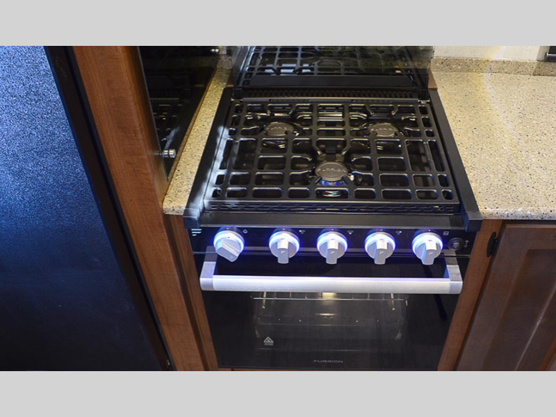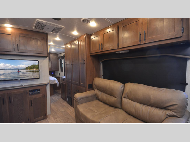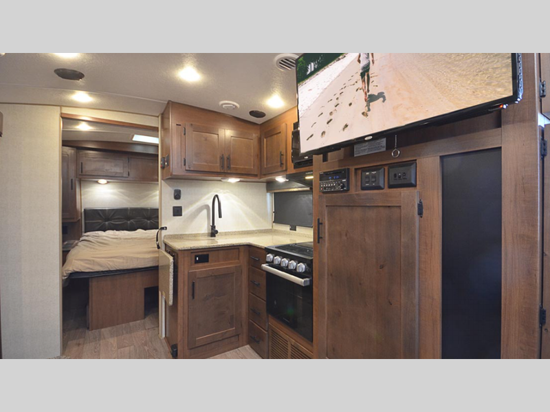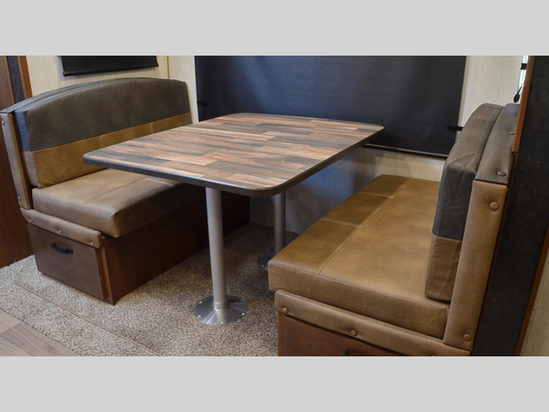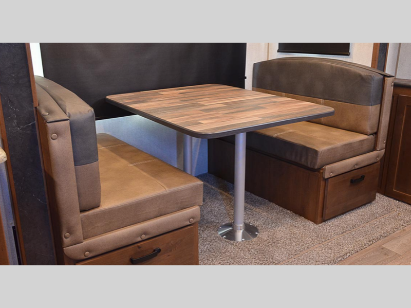 You will be able to camp all year long in all climates thanks to the triple layered four seasons roof insulation, the XL furnace, and the unique heated and insulated holding tank design. The rugged 2" bonded aluminum frame walls and custom built off road chassis will provide durability, and you'll appreciate the rugged Goodyear E range tires when heading up to the mountains. Each model includes ultra leather furniture inside, as well as residential height countertops, XL panoramic slide out windows, and a mountain comfort mattress.