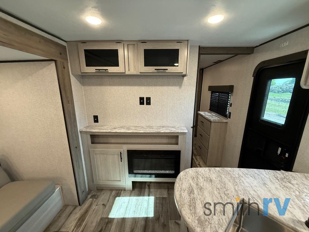 Camp like royalty in this travel trailer! The front private bedroom features a king bed across from a dresser and next to a large wardrobe with overhead cabinets, plus there is a closet with washer and dryer prep. The living area has a 60" jackknife sofa that can be pulled out for a comfortable place to lie down and watch a movie on the HDTV while a fire is roaring in the electric fireplace. The rear private bunkhouse is big enough to house all of the kiddos with the 38" x 74" flip-up bunk above the 72" jackknife sofa and the 38" x 74" bunk above the wardrobe/entertainment center. You can even cook dinner while breathing in fresh air at the outdoor kitchen!
