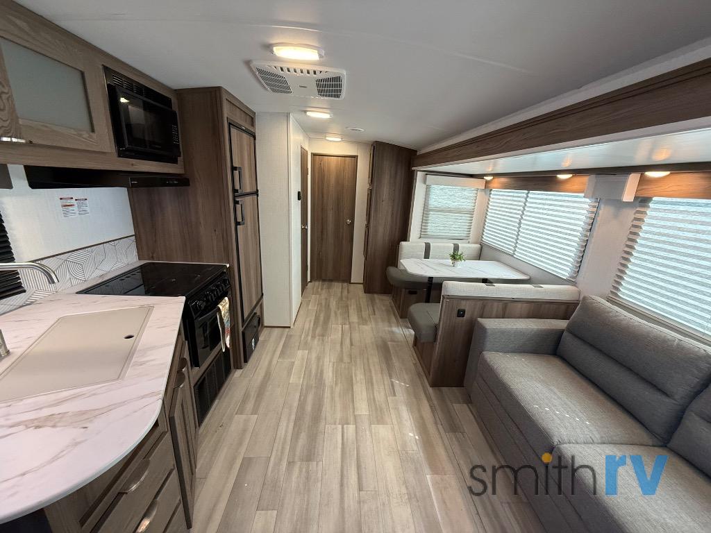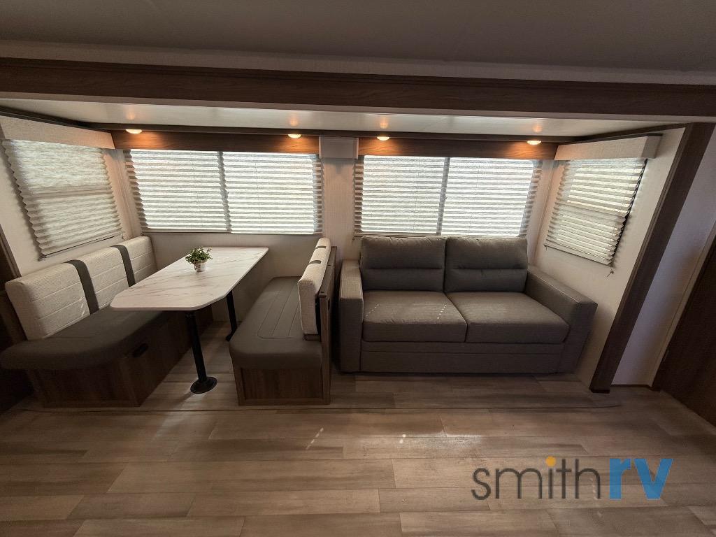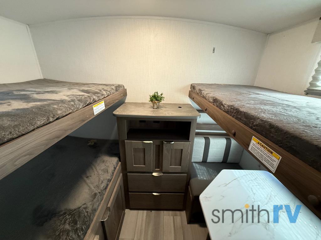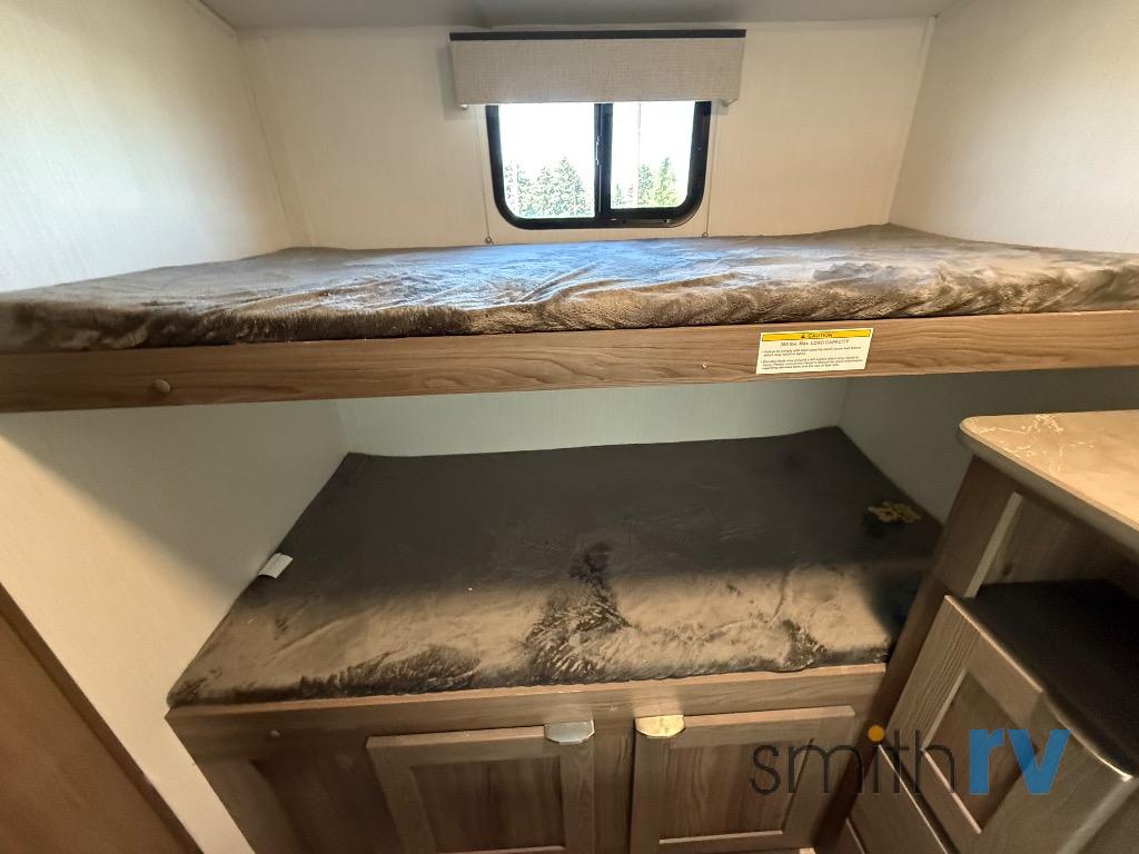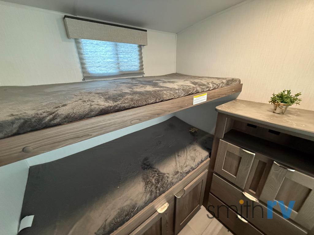 Everyone is going to love this travel trailer with a private bunkhouse! There are triple bunk beds, plus a dinette under one bunk for the kids or your friends to enjoy their own privacy, sleeping space and sitting area. You'll appreciate having your own front private bedroom with a king bed sliding system, and there is a booth dinette and sofa within the large slide out for more seating and sleeping space. Meals can be prepared on the three burner cooktop indoors, or outdoors on the outside griddle. This model also includes a full belly storage system to bring along hiking and fishing gear, and a patio awning for protection from the elements.