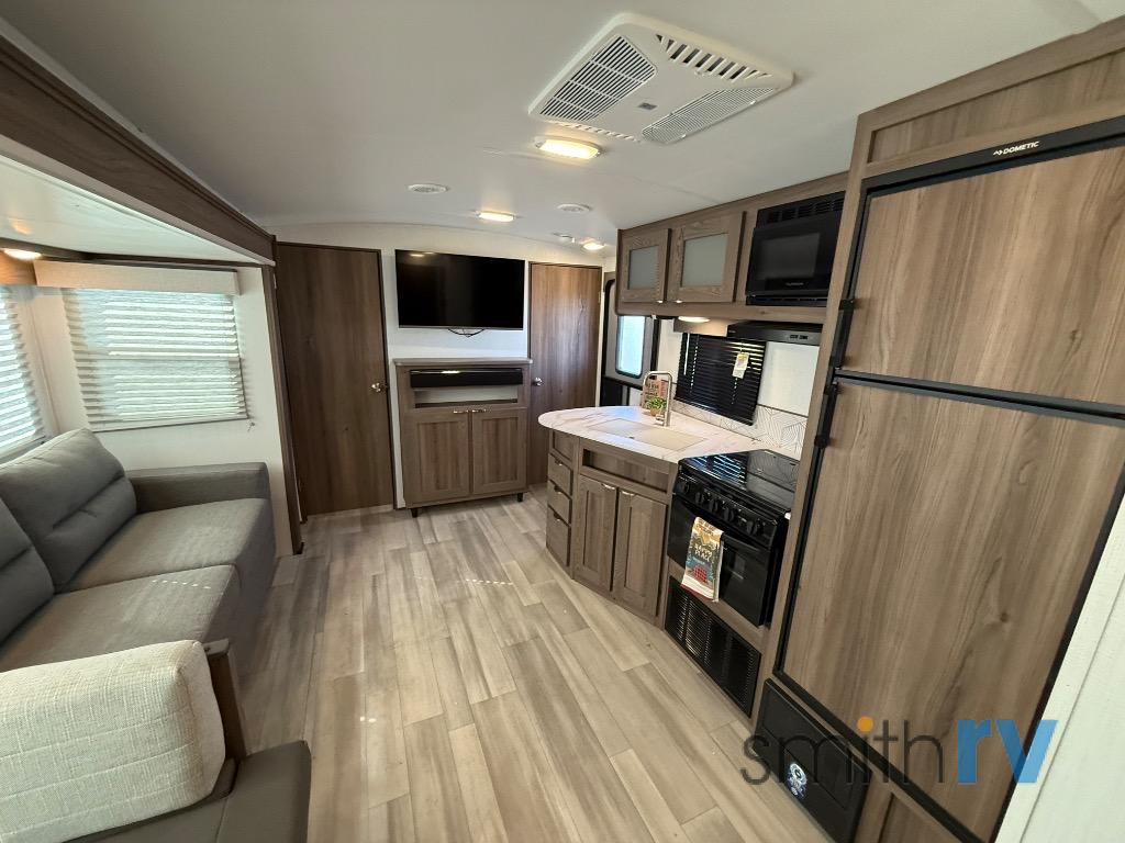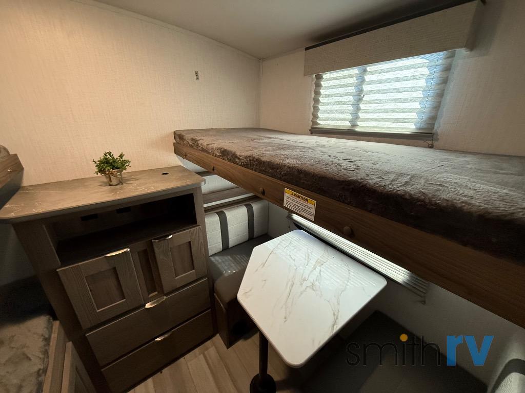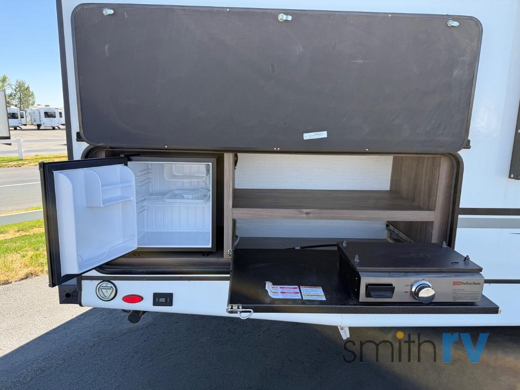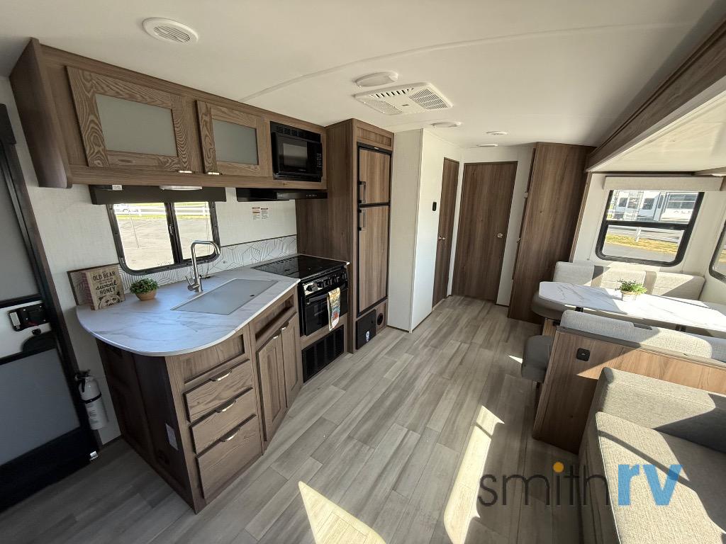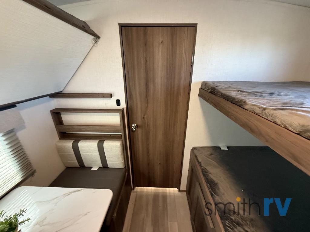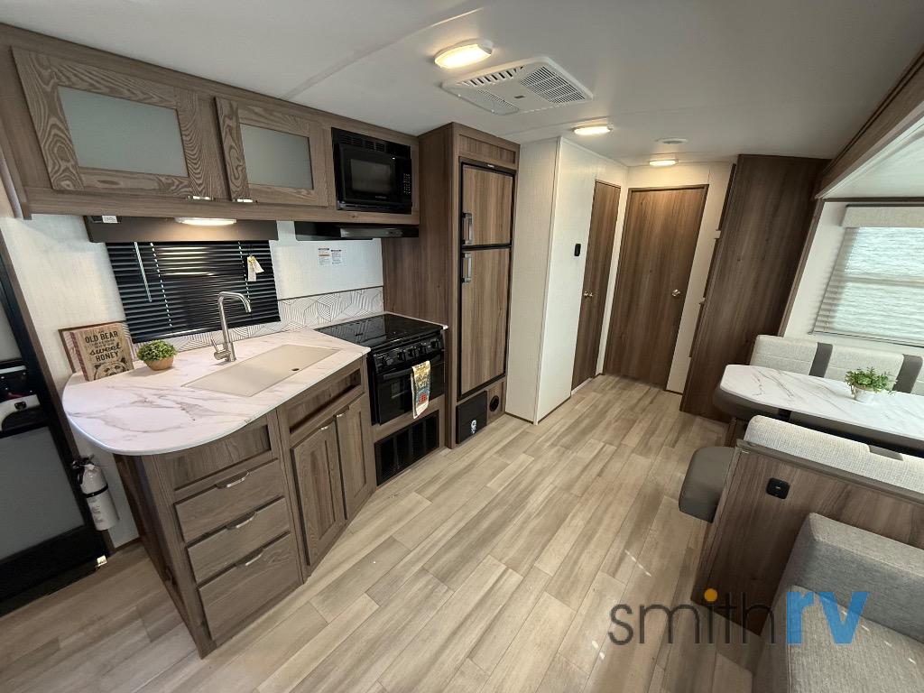 Everyone is going to love this travel trailer with a private bunkhouse! There are triple bunk beds, plus a dinette under one bunk for the kids or your friends to enjoy their own privacy, sleeping space and sitting area. You'll appreciate having your own front private bedroom with a king bed sliding system, and there is a booth dinette and sofa within the large slide out for more seating and sleeping space. Meals can be prepared on the three burner cooktop indoors, or outdoors on the outside griddle. This model also includes a full belly storage system to bring along hiking and fishing gear, and a patio awning for protection from the elements.