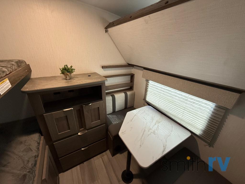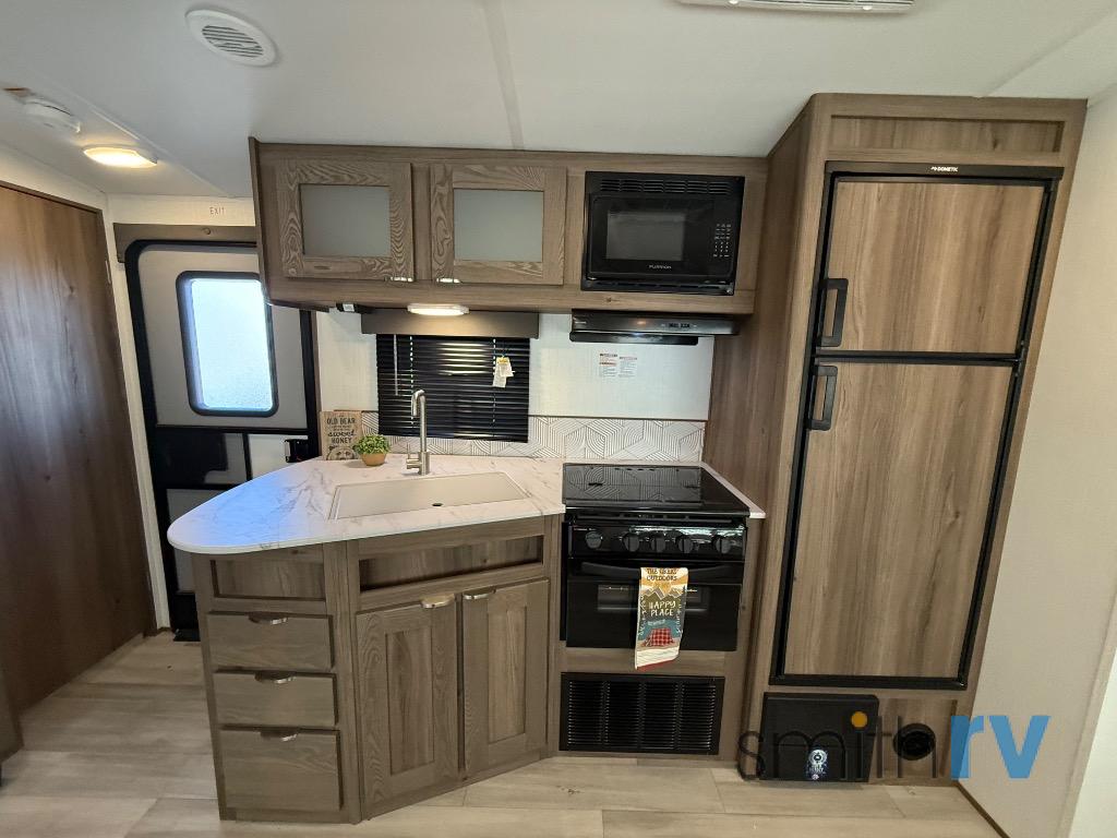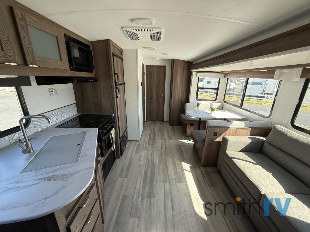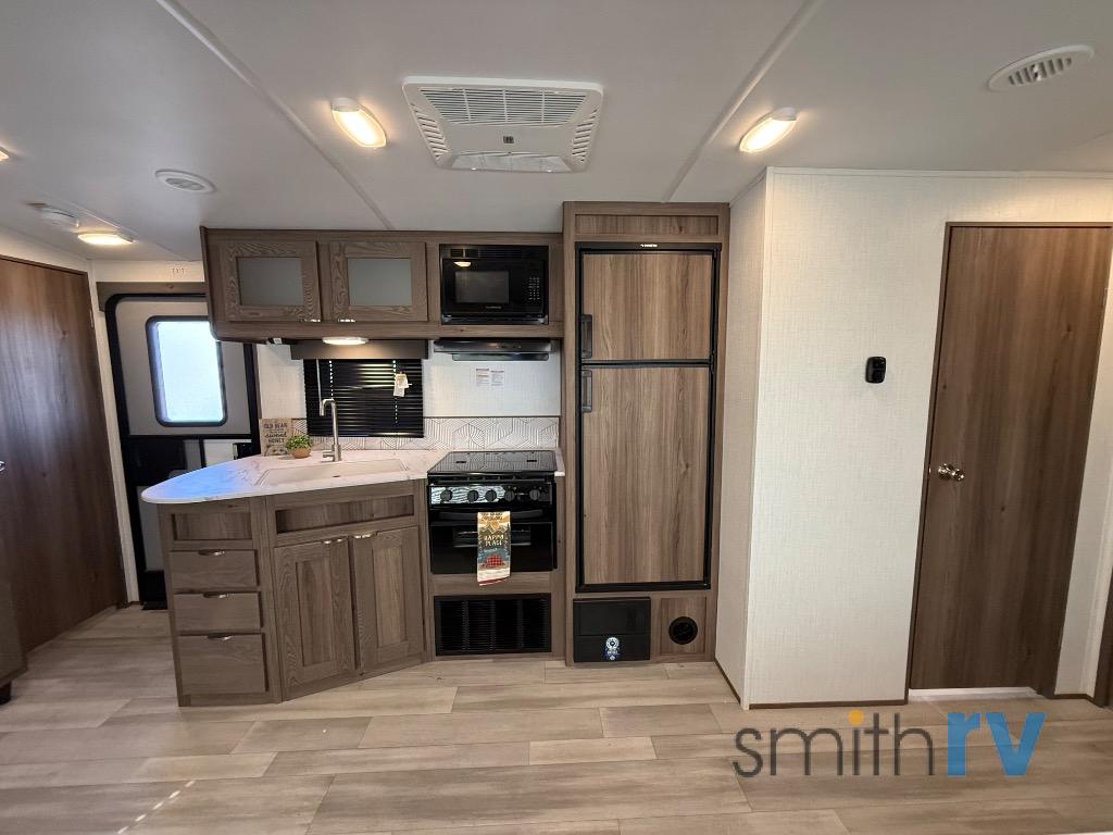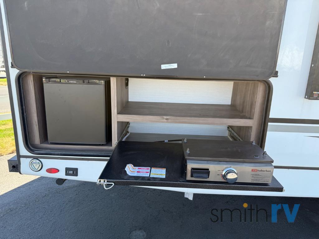 Everyone is going to love this travel trailer with a private bunkhouse! There are triple bunk beds, plus a dinette under one bunk for the kids or your friends to enjoy their own privacy, sleeping space and sitting area. You'll appreciate having your own front private bedroom with a king bed sliding system, and there is a booth dinette and sofa within the large slide out for more seating and sleeping space. Meals can be prepared on the three burner cooktop indoors, or outdoors on the outside griddle. This model also includes a full belly storage system to bring along hiking and fishing gear, and a patio awning for protection from the elements.