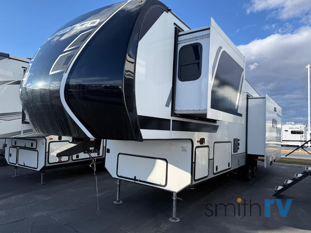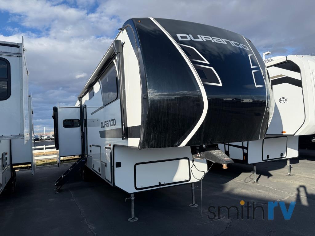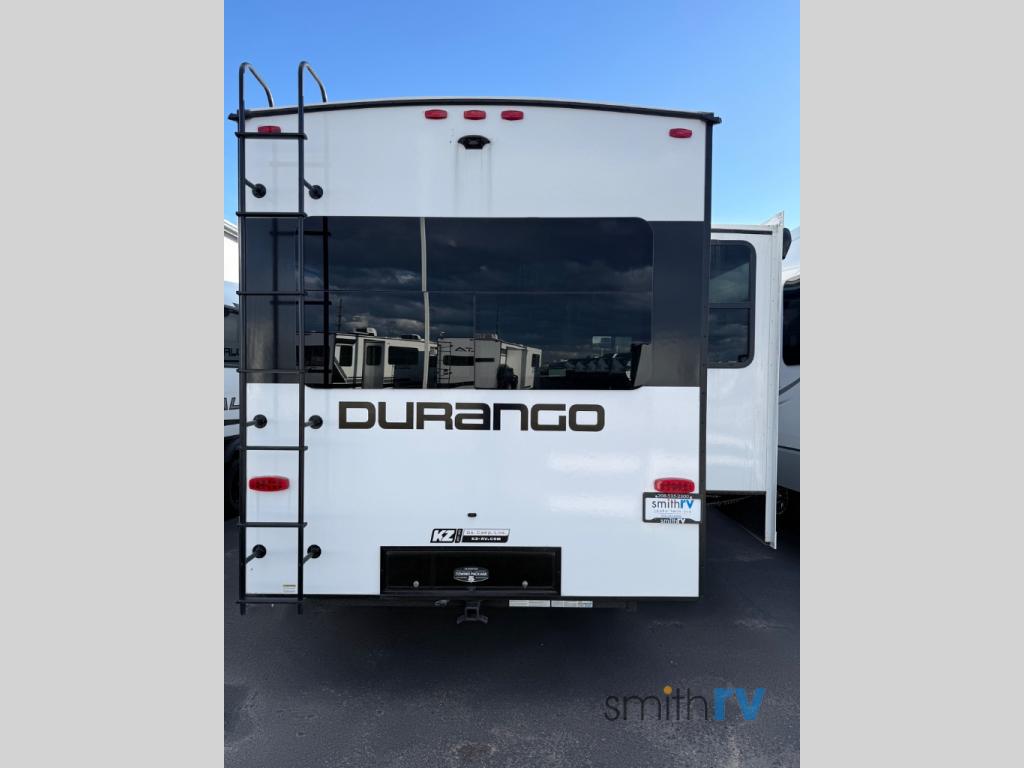 Enjoy full time living, an affordable price, and a wide body construction for more living space with every one of these KZ Durango light high-profile fifth wheels! These luxury units can be used all year round with the all-weather insulation package, the 3" x 14" foam-core in-floor straight-line heating system with a 35,000 BTU furnace, and the 15,000 BTU ducted roof A/C which optimizes the airflow by an average of 40% for better performance, cooling time, and reduction of noise. A few other construction features you will appreciate include a one piece, seamless walk-on Tufflex roofing material, Pex® in-floor heated waterlines, a Lamilux® gelcoat fiberglass exterior, and Dexter® axles with self adjusting brakes and height adjusting hangers. Inside, blancher cherry cabinetry, a king size bed, and smart TVs will have you feeling like you never left home!