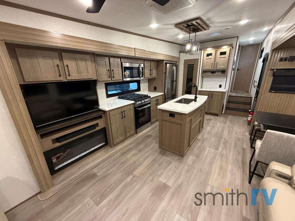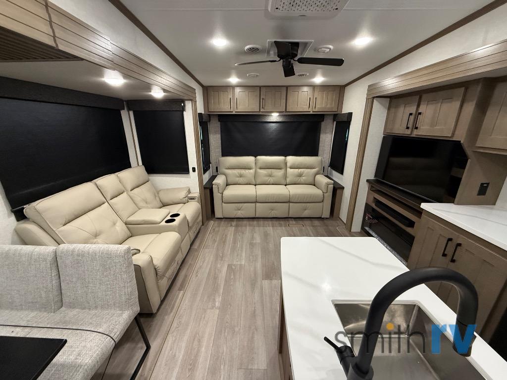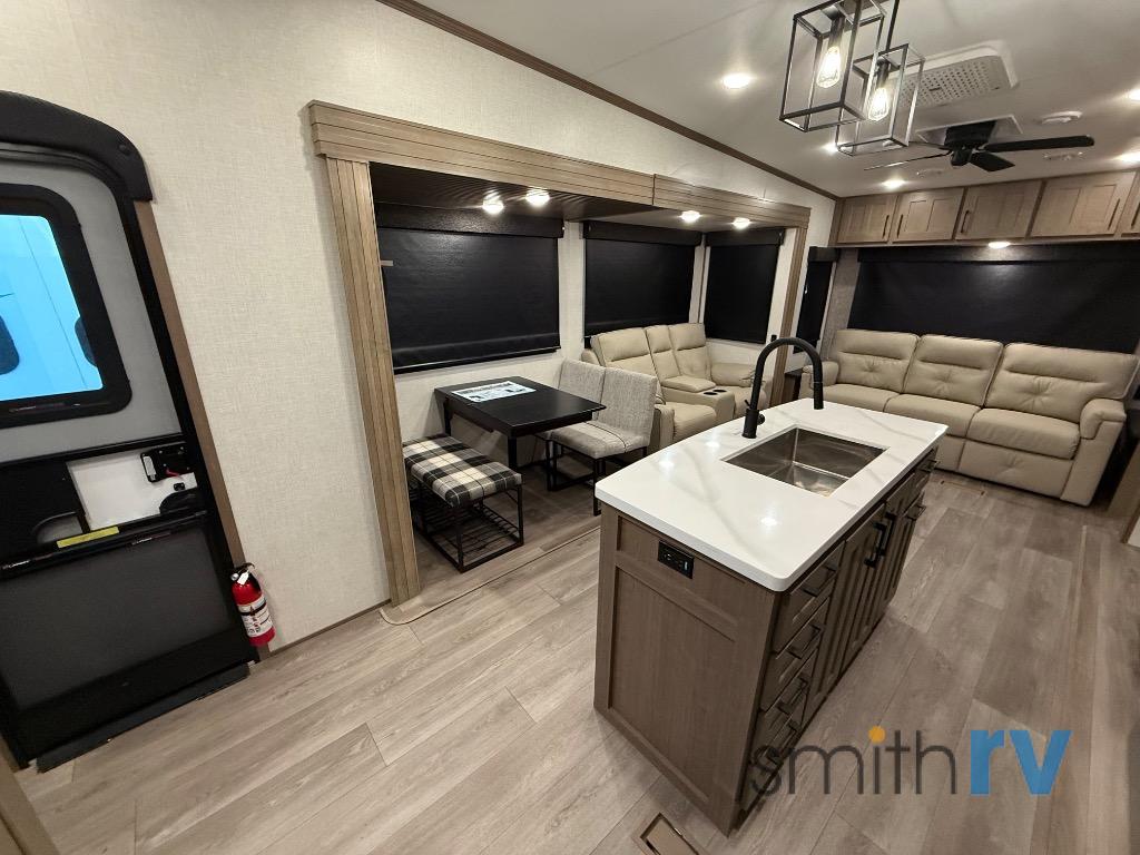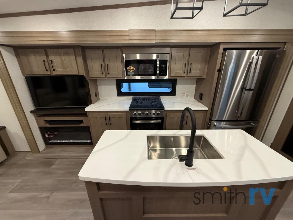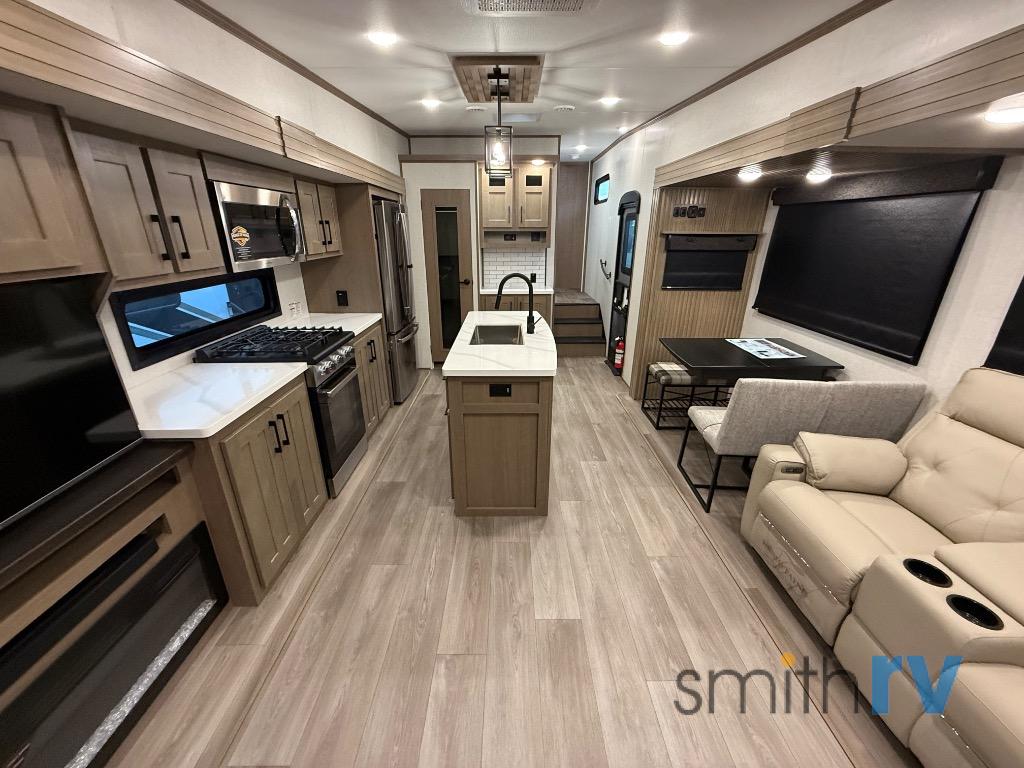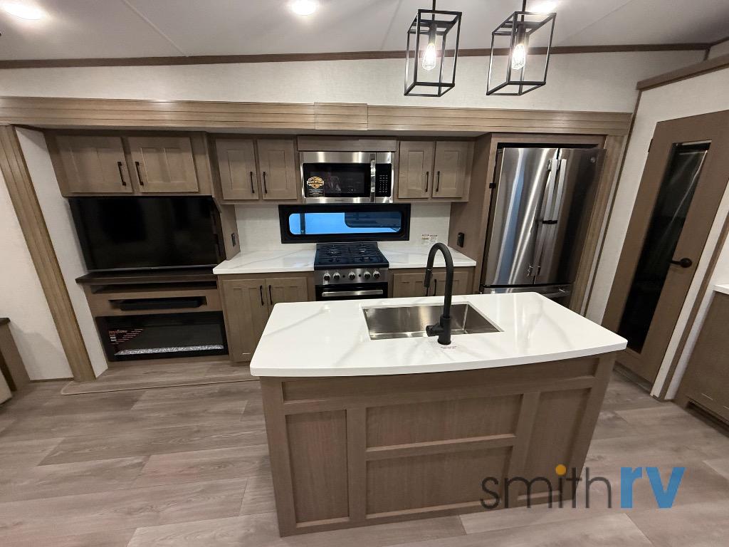 Don't pass up your chance to camp in true luxury with this fifth wheel! There is a kitchen island for others to help prepare dinner which can be either cooked on the four burner range or inside the 24" oven. The hutch can store your dishes and the large pantry can store your favorite snacks/canned goods. After a fun day at the beach, rinse the sand out in the 48" x 30" residential shower with a seat in the full bathroom, plus it has a dual sink vanity for two to get ready at once in the morning. When it's time to relax either lay down on the king bed slide in the front private bedroom or head to the rear living area where you can lay on the hide-a-bed sofa or sit in the theater seating with USB charging. There is also an entertainment center with a 40" fireplace and 43" smart LED TV to watch a movie!