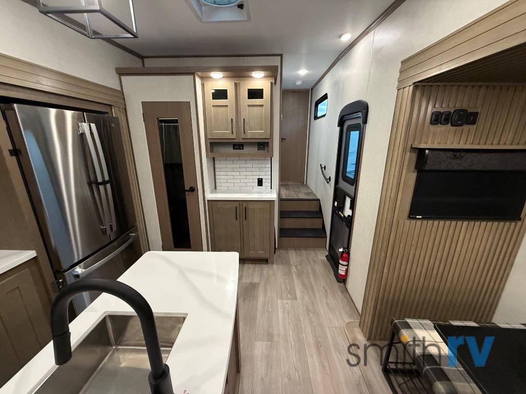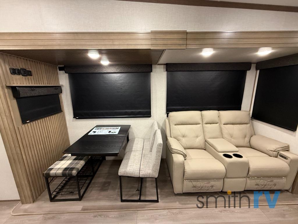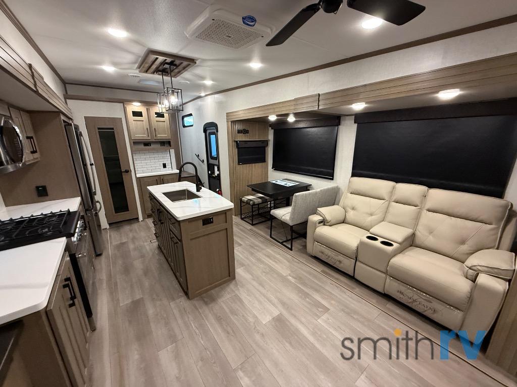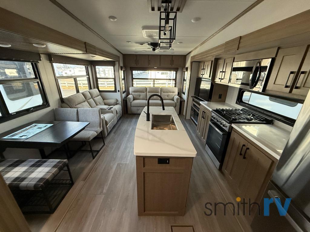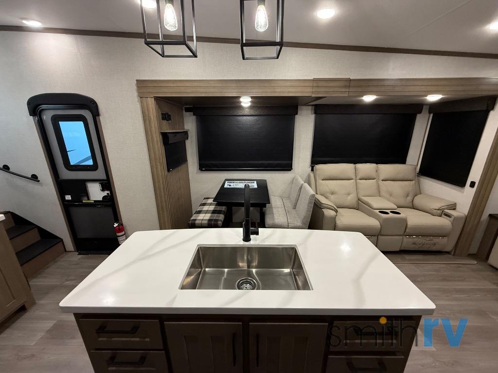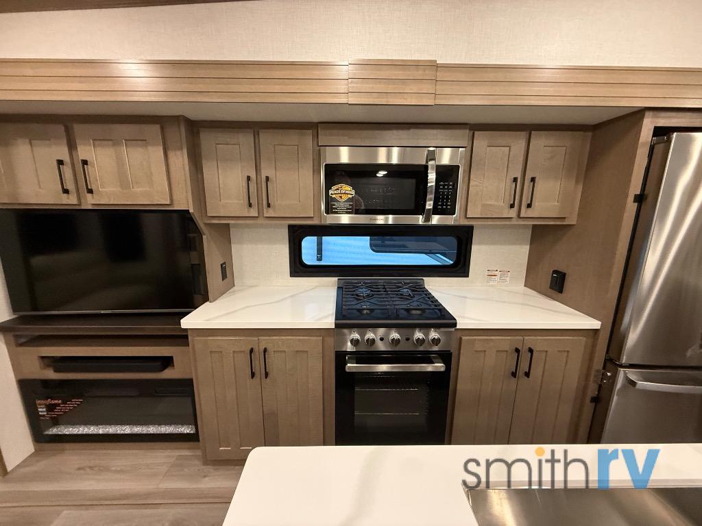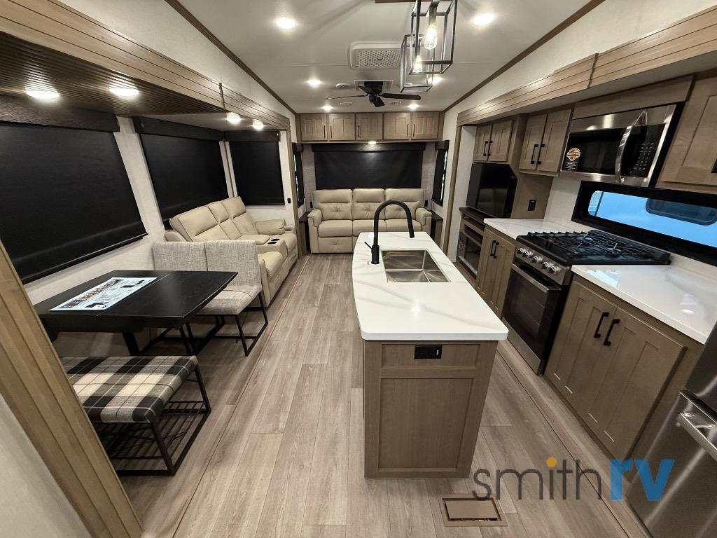 Don't pass up your chance to camp in true luxury with this fifth wheel! There is a kitchen island for others to help prepare dinner which can be either cooked on the four burner range or inside the 24" oven. The hutch can store your dishes and the large pantry can store your favorite snacks/canned goods. After a fun day at the beach, rinse the sand out in the 48" x 30" residential shower with a seat in the full bathroom, plus it has a dual sink vanity for two to get ready at once in the morning. When it's time to relax either lay down on the king bed slide in the front private bedroom or head to the rear living area where you can lay on the hide-a-bed sofa or sit in the theater seating with USB charging. There is also an entertainment center with a 40" fireplace and 43" smart LED TV to watch a movie!
