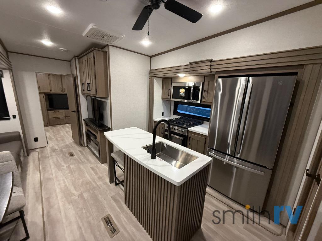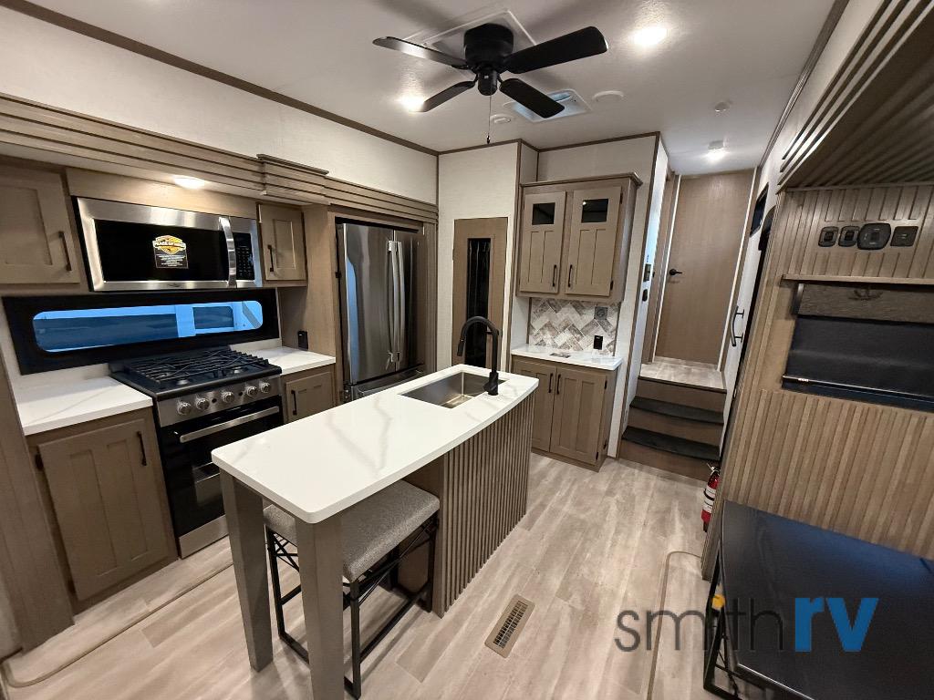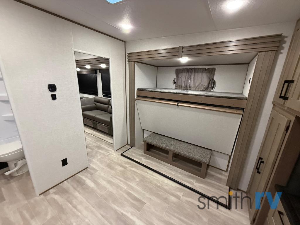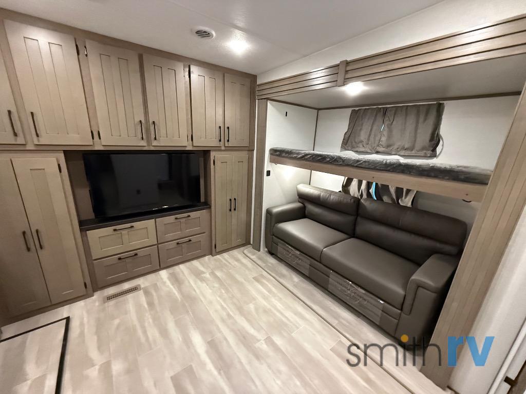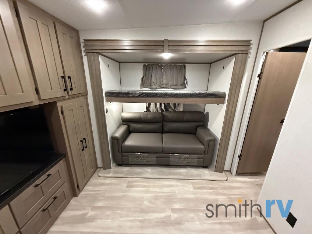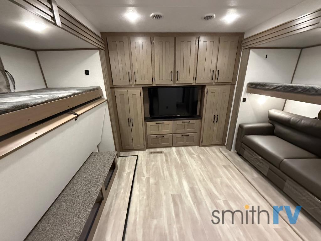 All of your friends and family can camp together in this fifth wheel! It features a rear private bunkhouse with a bunk above a hide-a-bed sofa, a full bathroom with a 30" x 36" shower, and an entertainment center with wardrobes on either side. There is also a folding bunk and a bunk over the outside kitchen. Across from the hide-a-bed sofa is an entertainment center with a 40" fireplace and a 43" smart TV to watch your favorite movies at night. The kitchen island will allow you to cook with ease and you can prepare your best meals with the four burner range with a 24" oven. The second bathroom has a 48" x 30" residential shower with a seat and a linen closet to keep your towel close. Enjoy a good night's rest on the king bed slide in the front private bedroom which also has a dresser and a front wardrobe with washer and dryer prep!