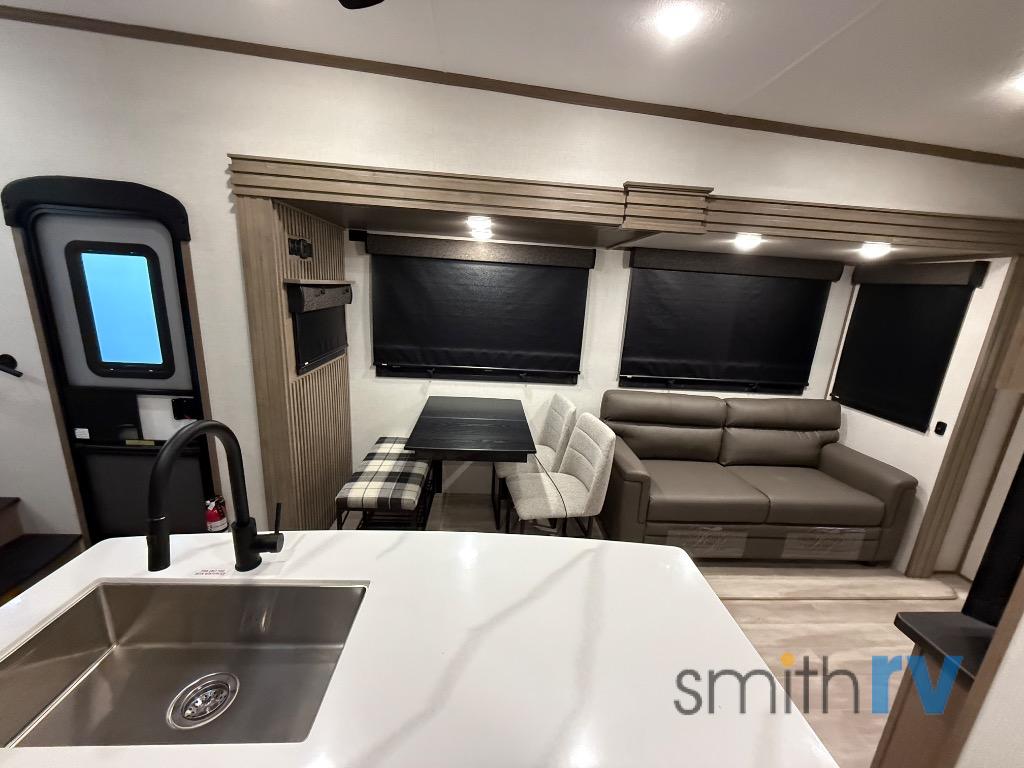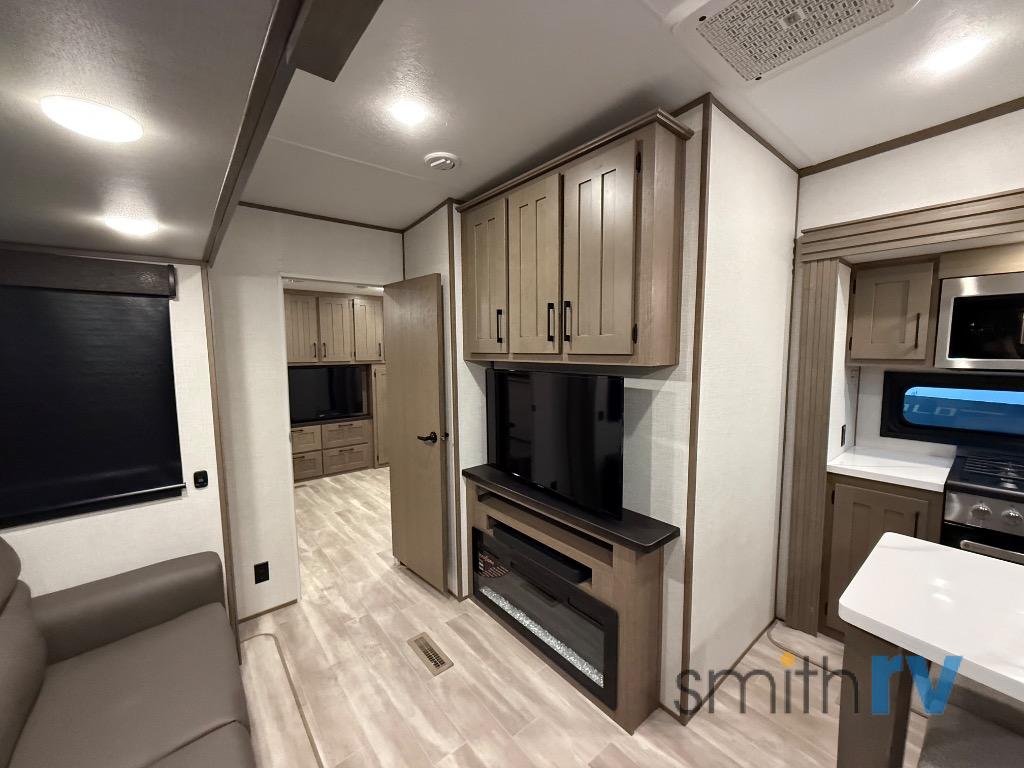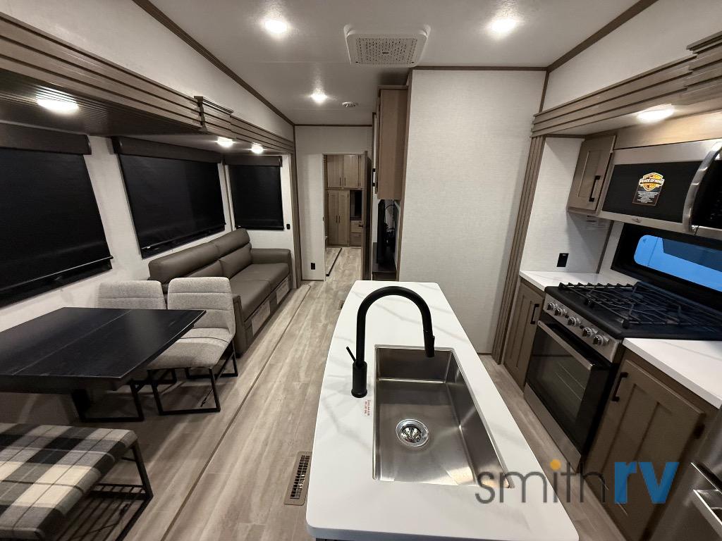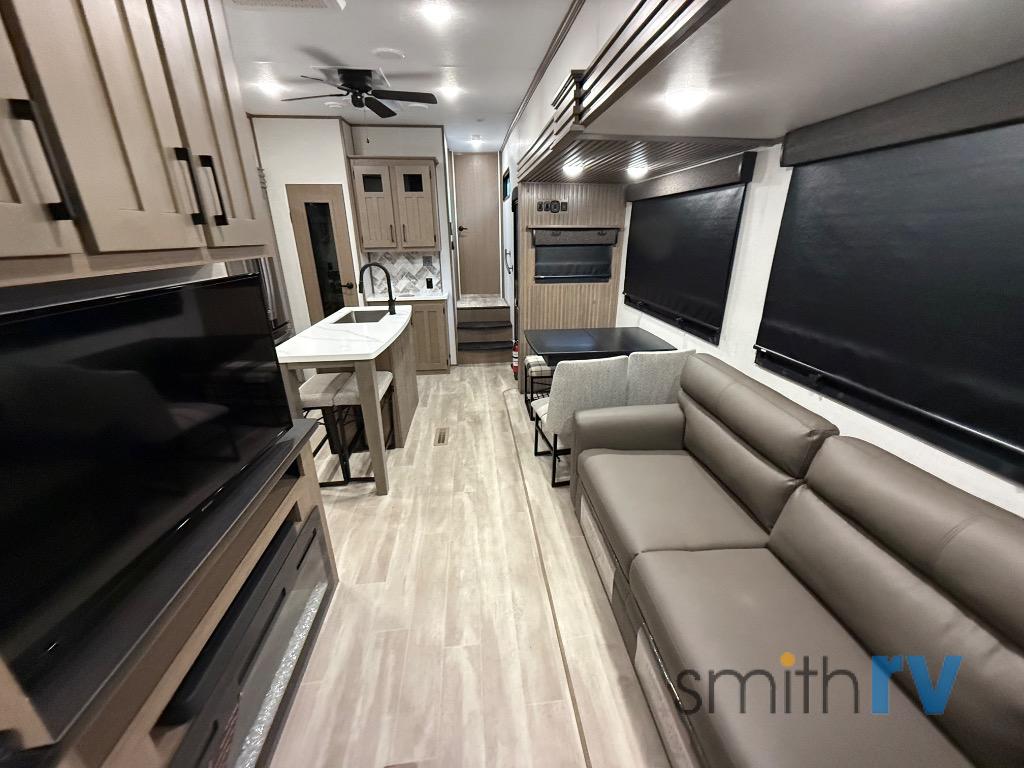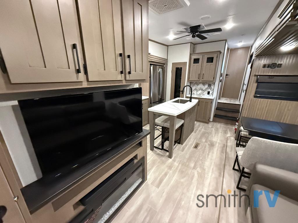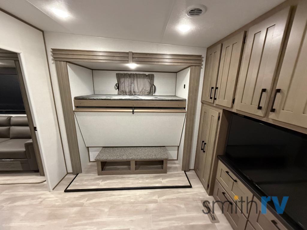 All of your friends and family can camp together in this fifth wheel! It features a rear private bunkhouse with a bunk above a hide-a-bed sofa, a full bathroom with a 30" x 36" shower, and an entertainment center with wardrobes on either side. There is also a folding bunk and a bunk over the outside kitchen. Across from the hide-a-bed sofa is an entertainment center with a 40" fireplace and a 43" smart TV to watch your favorite movies at night. The kitchen island will allow you to cook with ease and you can prepare your best meals with the four burner range with a 24" oven. The second bathroom has a 48" x 30" residential shower with a seat and a linen closet to keep your towel close. Enjoy a good night's rest on the king bed slide in the front private bedroom which also has a dresser and a front wardrobe with washer and dryer prep!