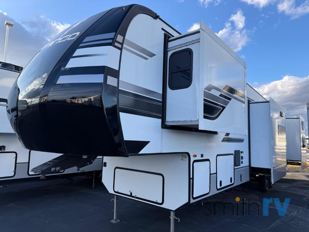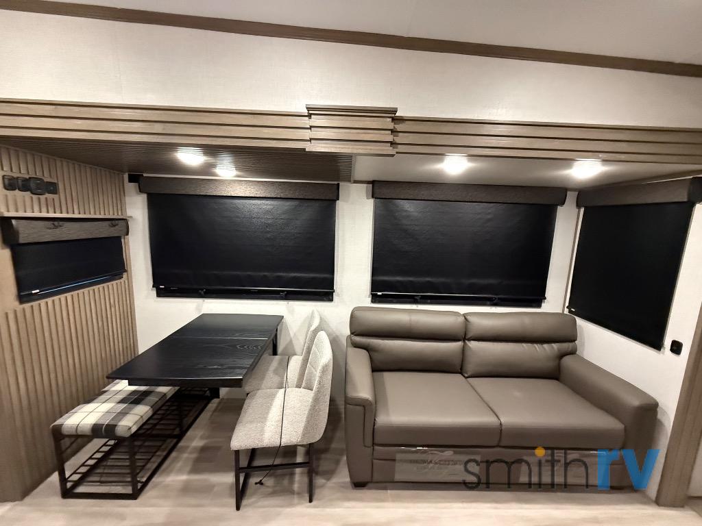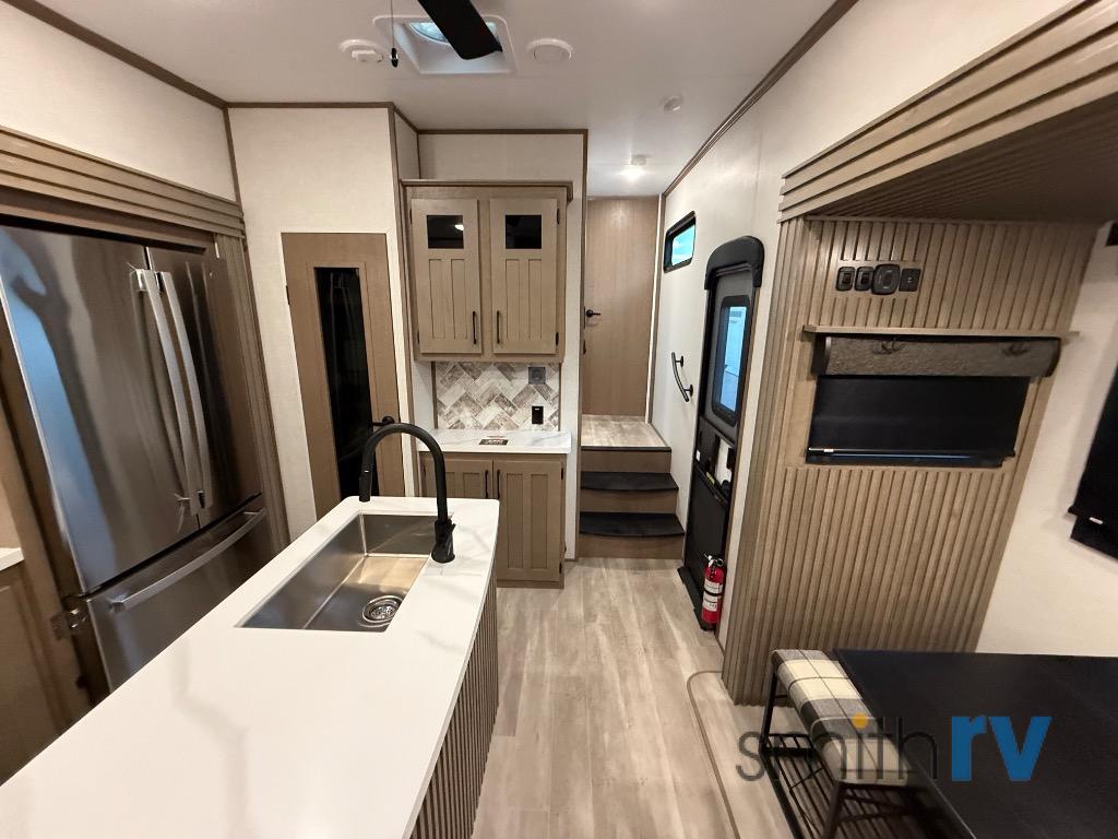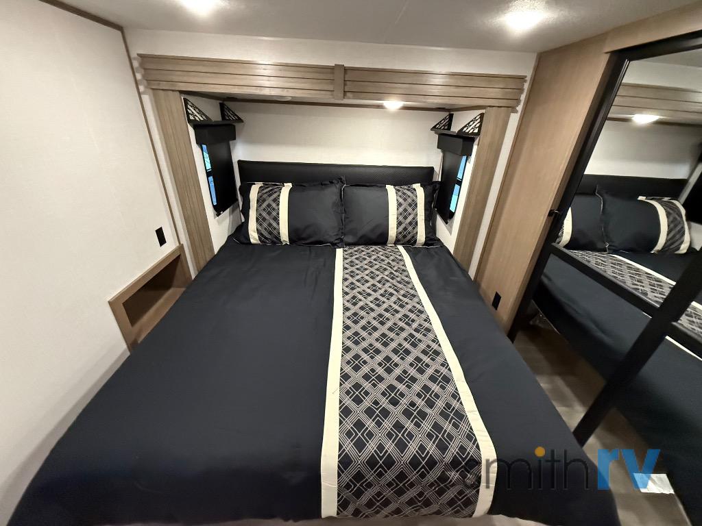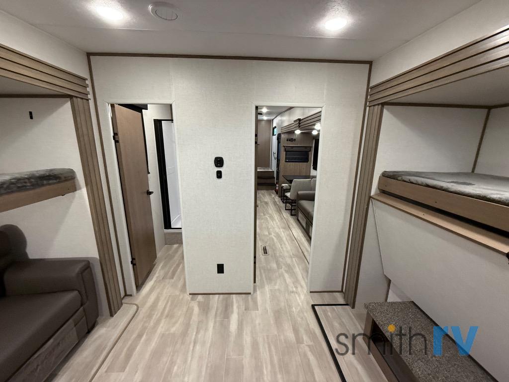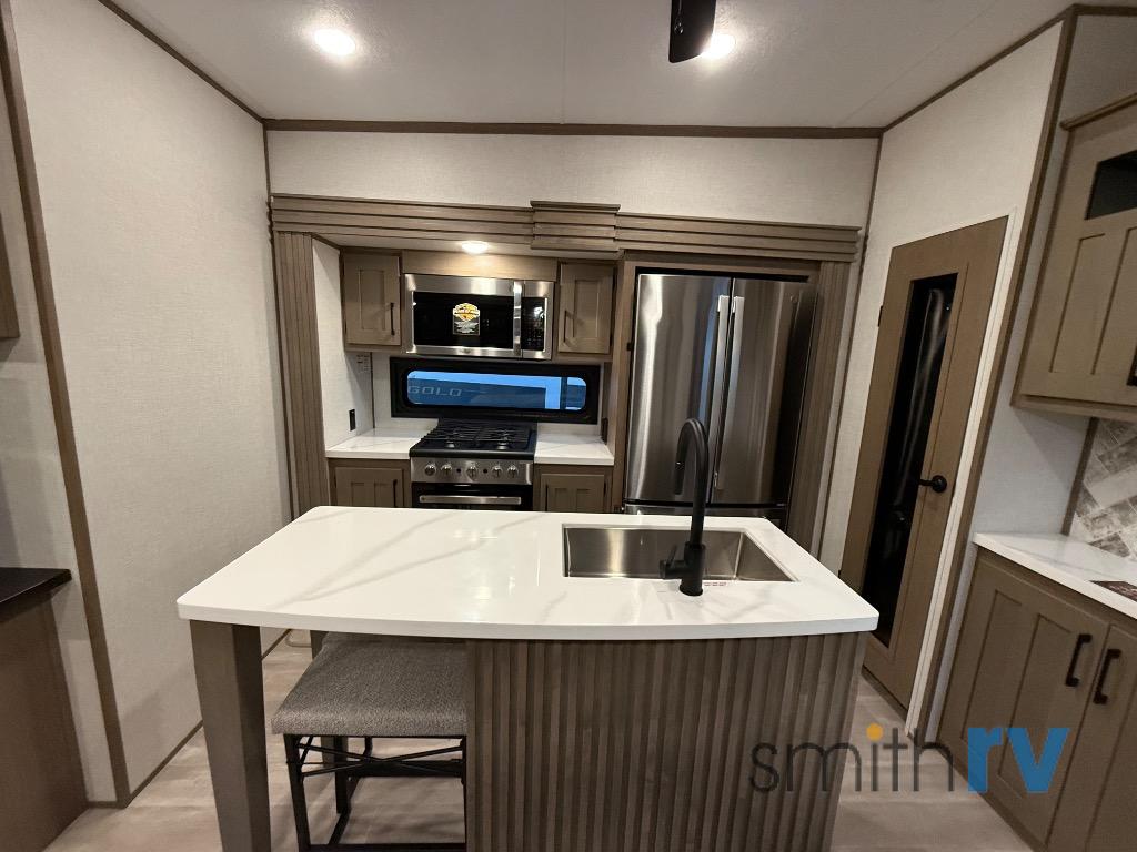 All of your friends and family can camp together in this fifth wheel! It features a rear private bunkhouse with a bunk above a hide-a-bed sofa, a full bathroom with a 30" x 36" shower, and an entertainment center with wardrobes on either side. There is also a folding bunk and a bunk over the outside kitchen. Across from the hide-a-bed sofa is an entertainment center with a 40" fireplace and a 43" smart TV to watch your favorite movies at night. The kitchen island will allow you to cook with ease and you can prepare your best meals with the four burner range with a 24" oven. The second bathroom has a 48" x 30" residential shower with a seat and a linen closet to keep your towel close. Enjoy a good night's rest on the king bed slide in the front private bedroom which also has a dresser and a front wardrobe with washer and dryer prep!