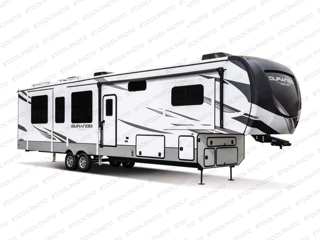 Camp wherever you want and stay as long as you desire with this full-time fifth wheel! You will love the spacious interior which includes a front bedroom with an electric tilt king bed slide with drawers underneath, a front wardrobe with washer and dryer prep, a closet with a built-in hamper, plus a slide out dresser with 32" Smart LED TV above. The full bathroom offers a residential shower with a seat plus linen storage, and the kitchen gives the cook a dream kitchen that includes a farmhouse stainless steel sink and dishwasher in the center island, a 26 cu. ft. house refrigerator with a 2,000W inverter, and more. The 50" Smart LED TV with a fireplace below can be seen from the sliding table / desk and chairs, the comfortable theater seats and the hide-a-bed sofa. Yet you might like to add the 10' 6" awning option, and there are more options to customize your Durango Gold.