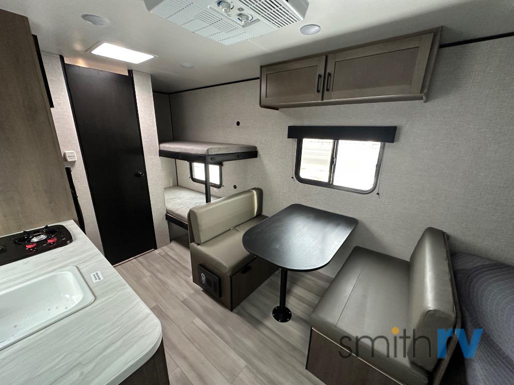 This simple, yet cozy travel trailer is perfect for all your outdoor excursions. You can unload the exterior storage when you get to camp, then head inside to make lunch on the two burner cooktop or microwave oven. A GE 4.4 cu. ft. 12V refrigerator will keep your perishables fresh, and a booth dinette will provide dining space. Everyone can take turns freshening up in the private bath that includes a tub/shower and a toilet, and the little ones are sure to love the bunk beds!