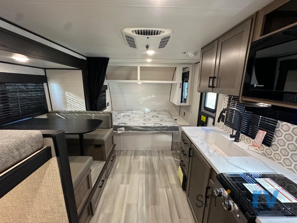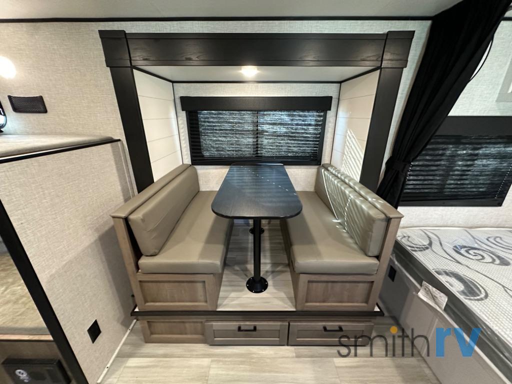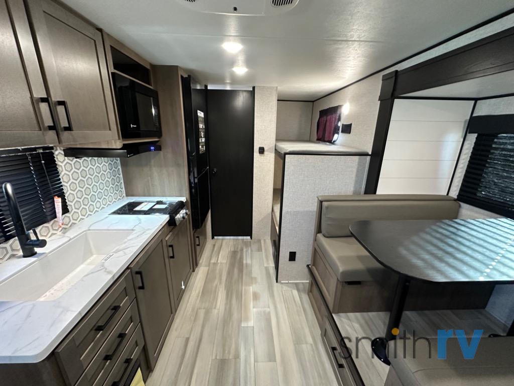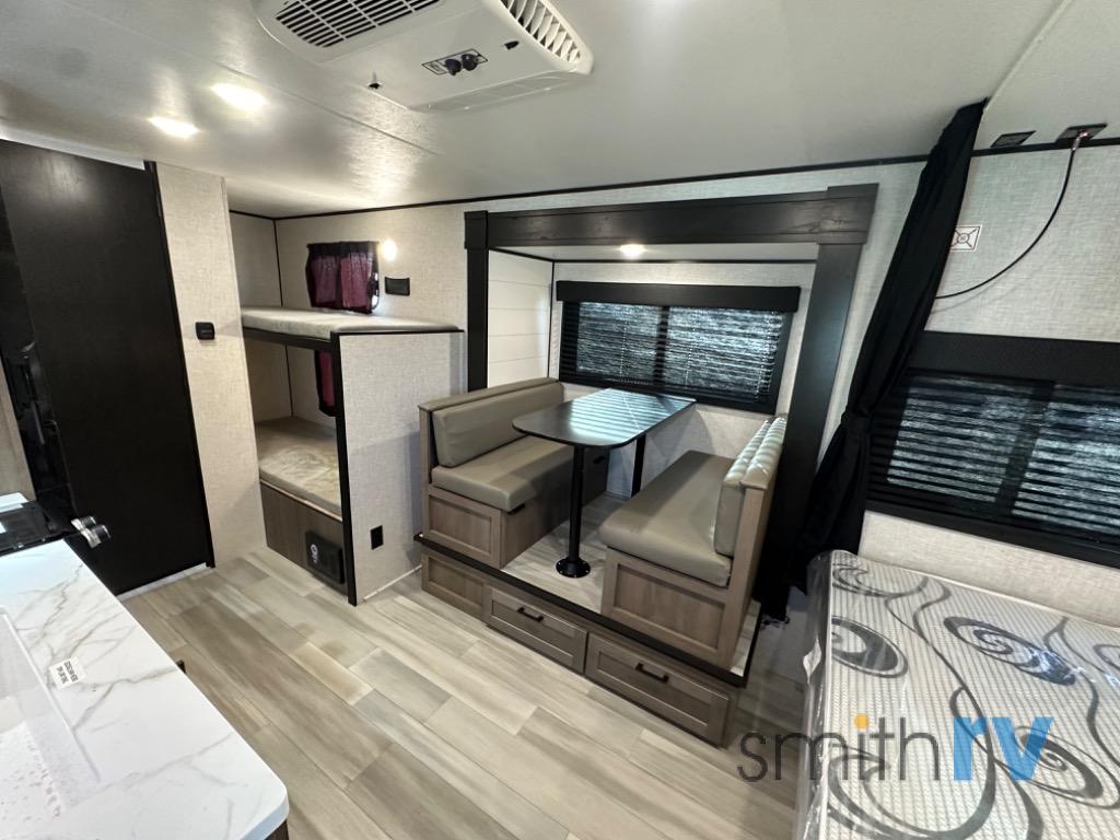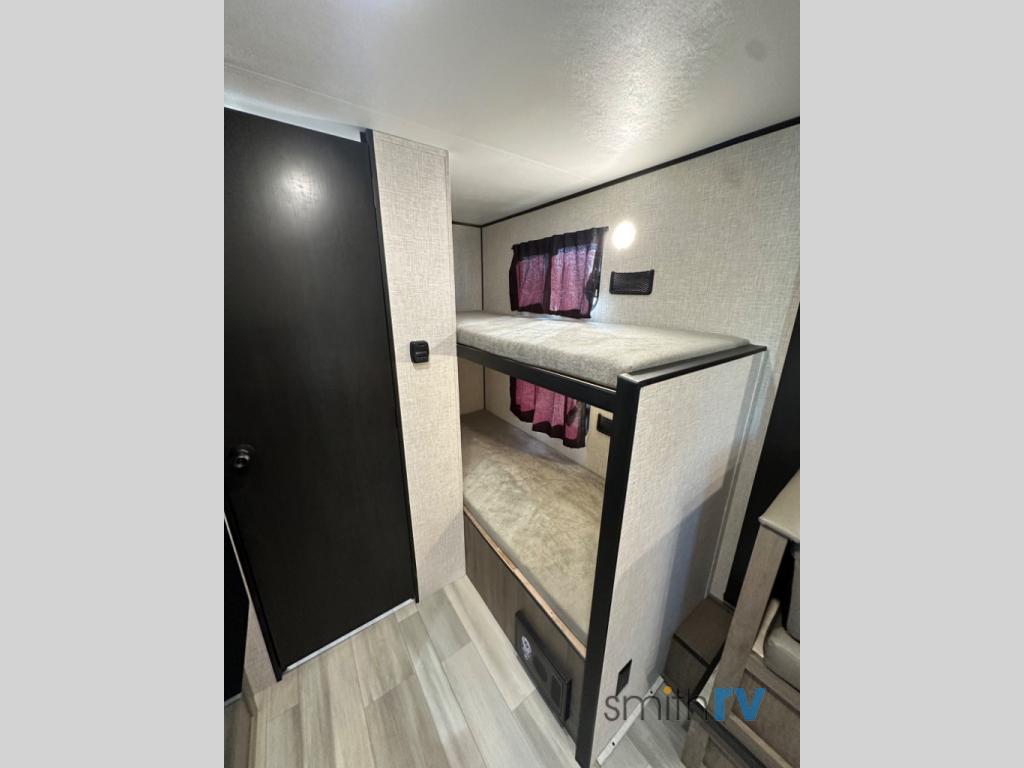 Bunk beds in this single axle travel trailer make each camping trip fun, plus there is a booth dinette slide that provides more space to stretch out and relax. The front bed includes a wardrobe at the end of it to store your clothes, and there is an overhead cabinet here for special belongings. In the morning you can make breakfast on the two burner cooktop, or use the microwave oven if you're on the go. This model also includes outside storage that will be perfect for the tackle boxes or hiking gear!