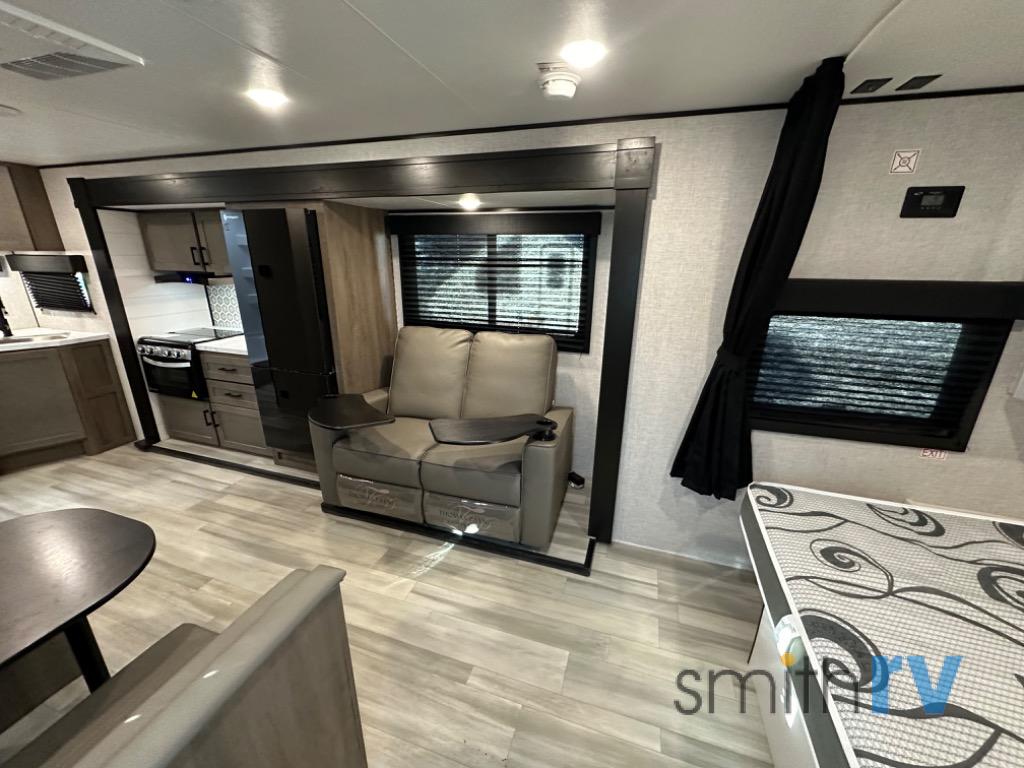 You'll love the amount of space you have in this travel trailer thanks to the large slide out. Here, you'll find theater seating, a three burner range with countertop space, plus an 8 cu. ft. 12V refrigerator. There is additional counter space by the rear corner sink, along with overhead cabinets for kitchen knickknacks. A booth dinette provides a place to dine inside when you don't want to sit outdoors under the 18' power awning. You'll feel right at home in the front bedroom that includes a walk-around bed, dual wardrobes, and a privacy curtain!