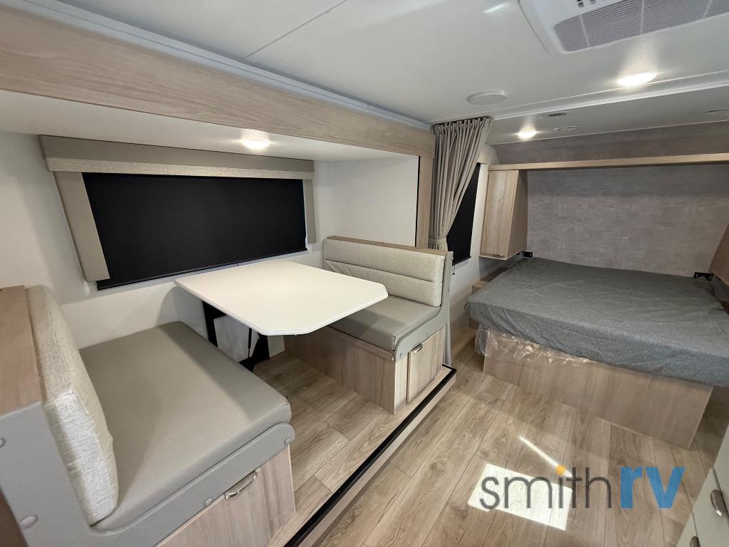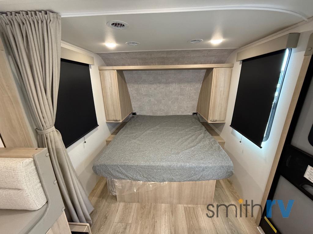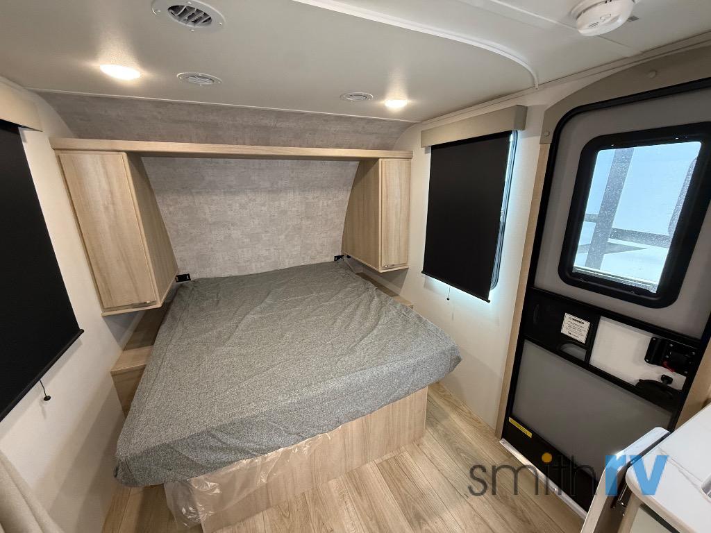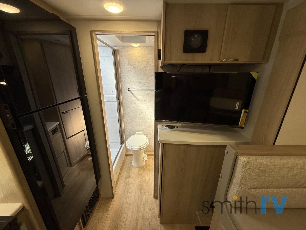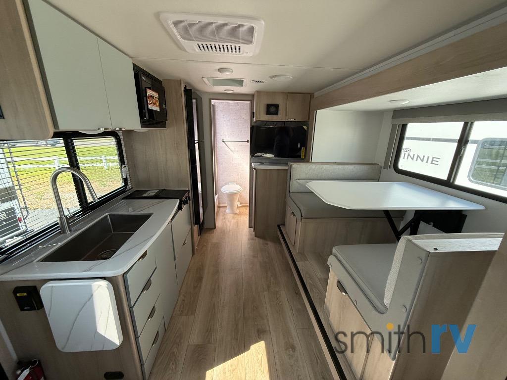Pack your bags and head to the campground with this travel trailer! You will love all that it has to offer from the full rear bathroom to the front 60" x 74" RV queen-size bed with dual wardrobes on either side of the bed. The 44" x 72" booth dinette slide is not only a great place to enjoy your meals at or play card games, but it can also be transformed into an extra sleeping space if you want to bring along a guest. When you don't feel like making dinner, you can easily pop in some leftovers or a bag of popcorn into the convection microwave and relax while you watch a movie on the Smart TV!