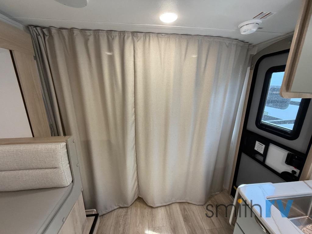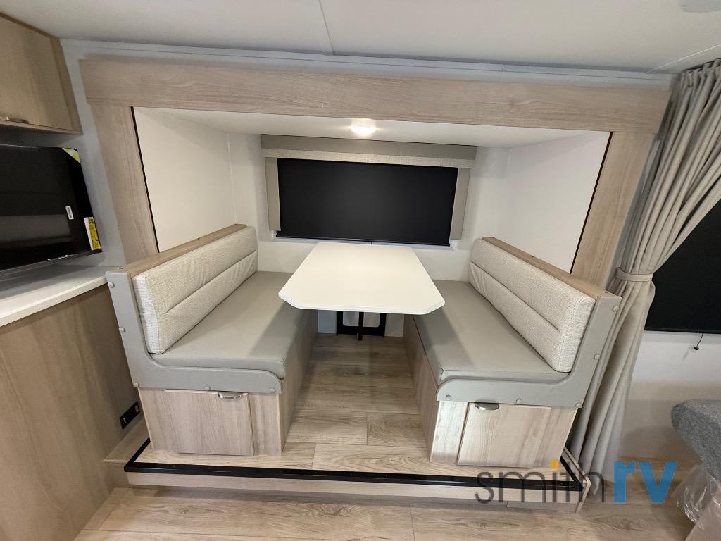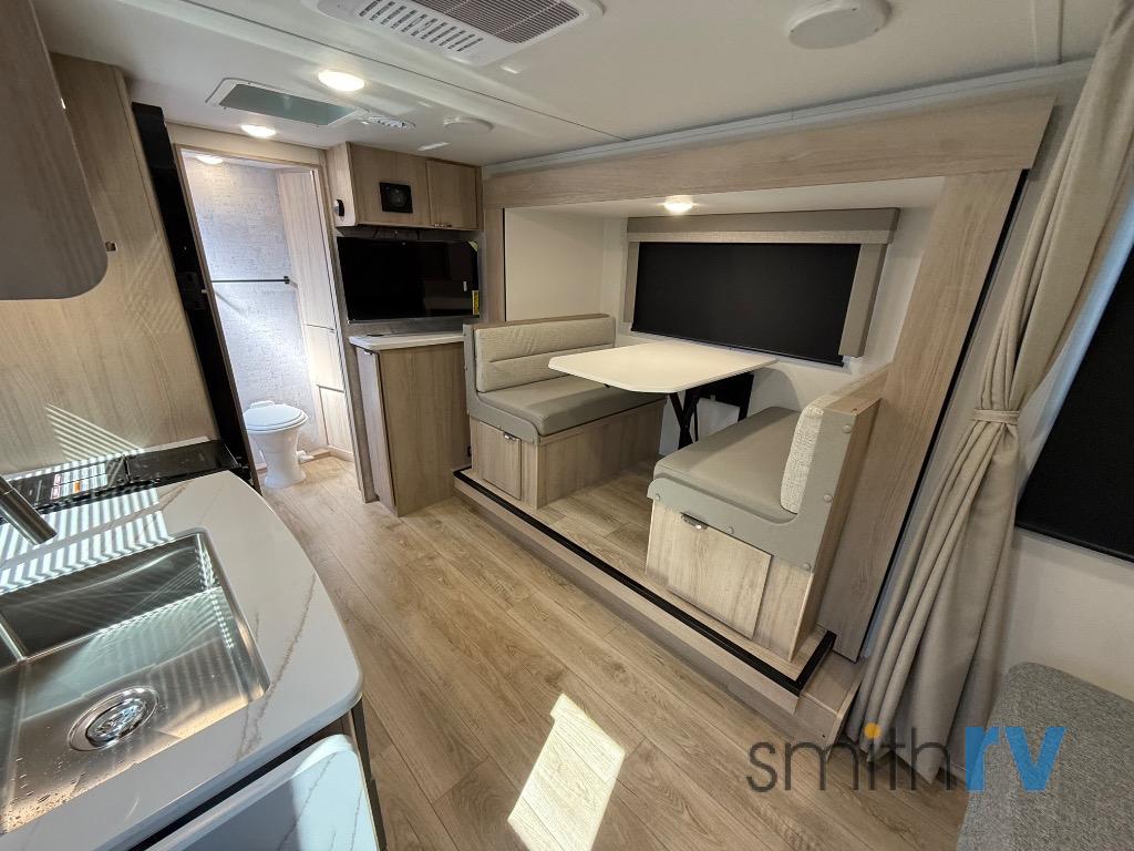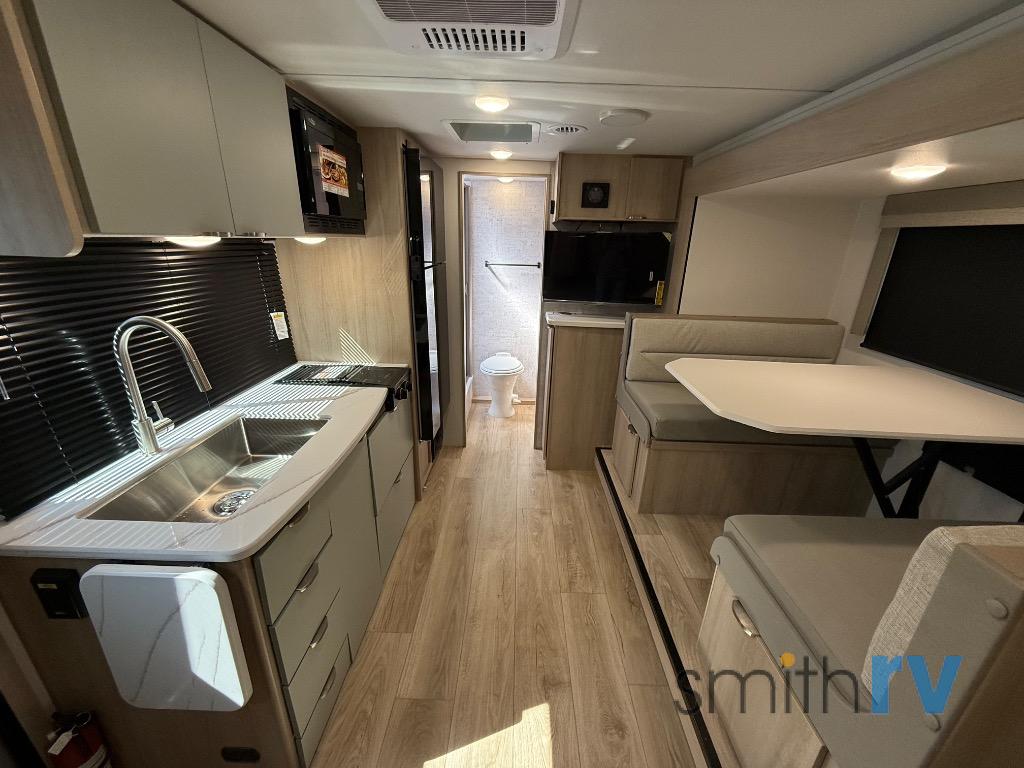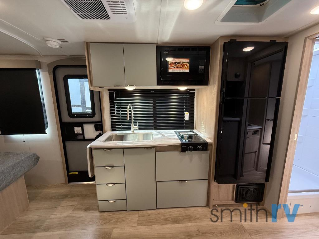 Pack your bags and head to the campground with this travel trailer! You will love all that it has to offer from the full rear bathroom to the front 60" x 74" RV queen-size bed with dual wardrobes on either side of the bed. The 44" x 72" booth dinette slide is not only a great place to enjoy your meals at or play card games, but it can also be transformed into an extra sleeping space if you want to bring along a guest. When you don't feel like making dinner, you can easily pop in some leftovers or a bag of popcorn into the convection microwave and relax while you watch a movie on the Smart TV!