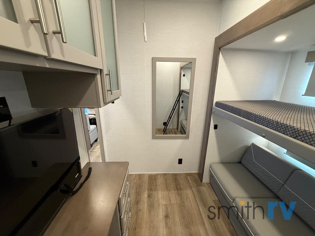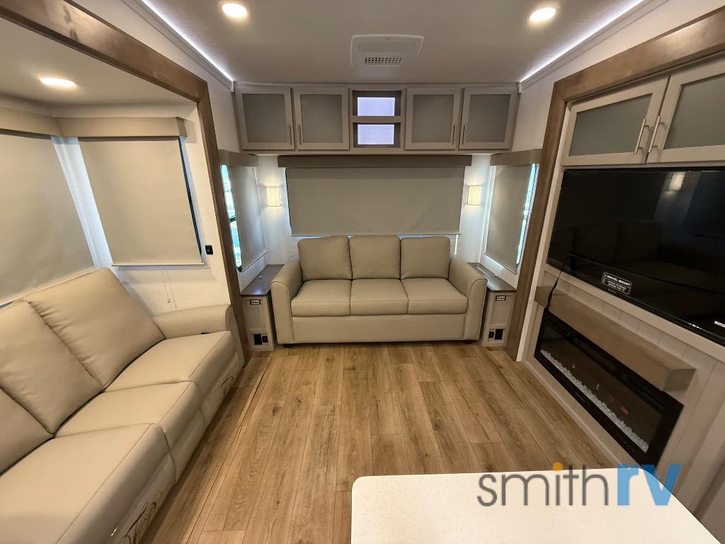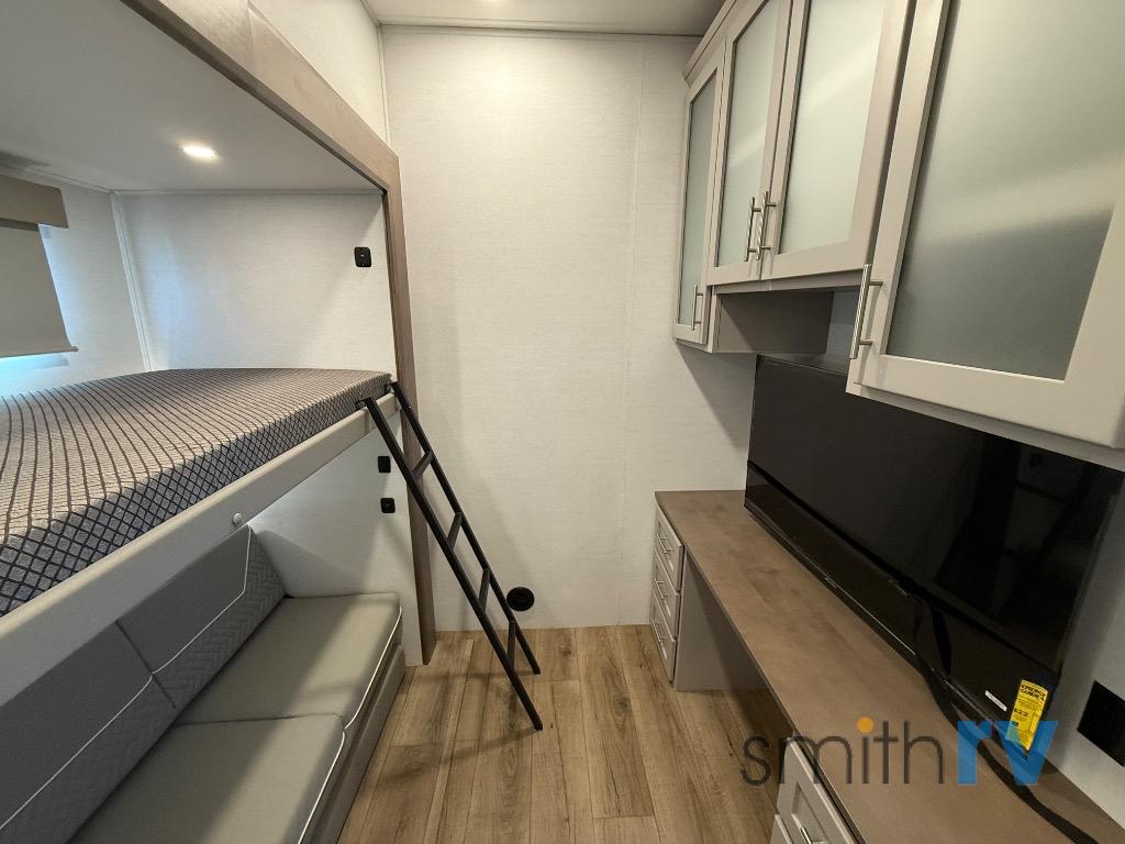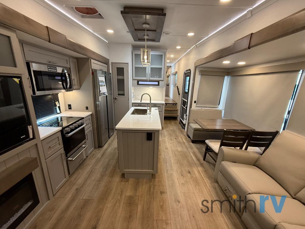 Life will be easy in this fifth wheel! The floating dinette table has two chairs on one side and a movable ottoman with flip up storage on the other side to keep your games or extra table cloths in. The kitchen island makes it easy to prepare a delicious home cooked meal. You can store your dishes and snacks inside the hutch/pantry or in the second pantry. The front private bedroom has a queen bed slide but can be switched out for the optional king bed if you like. There is also a dresser and large wardrobe for storage, and either side of the wardrobe with washer and dryer prep. The rear living area features a dual recliner theater seat across from an entertainment center with a 50" class HDTV with hidden storage behind it, and easy for all to see even at the rear sleeper sofa. Plus, you have a second bedroom with a slide that houses a sleeper sofa bunk and trundle across from a dresser with a 40" TV above it!