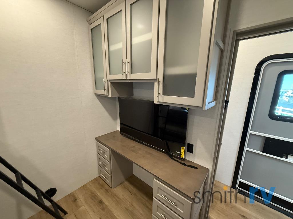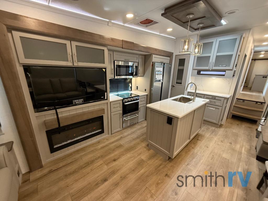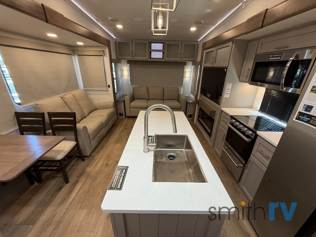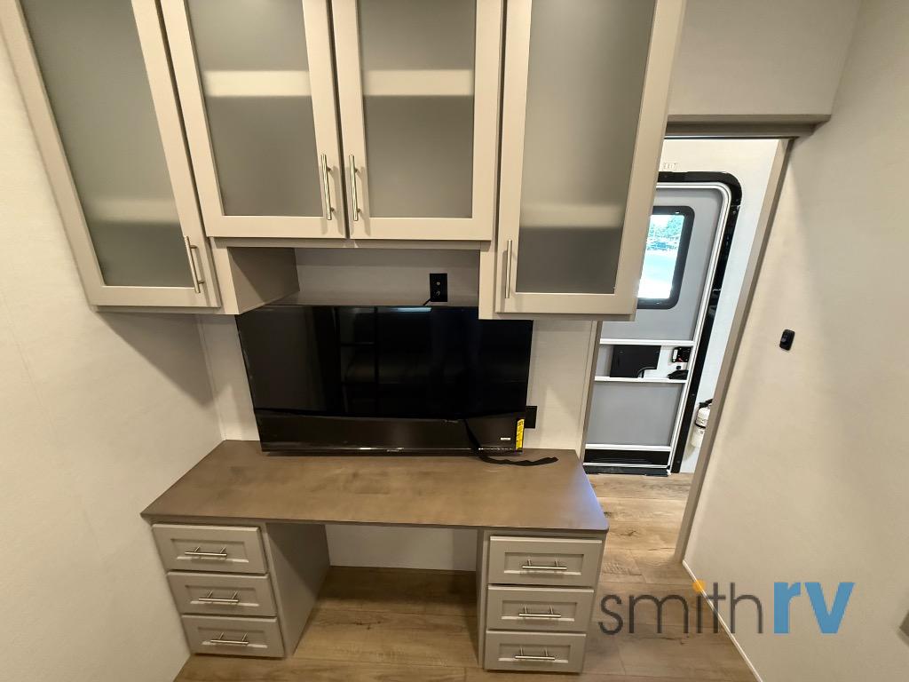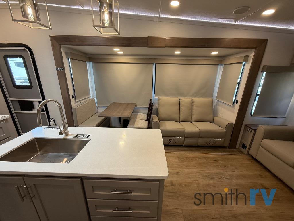 Life will be easy in this fifth wheel! The floating dinette table has two chairs on one side and a movable ottoman with flip up storage on the other side to keep your games or extra table cloths in. The kitchen island makes it easy to prepare a delicious home cooked meal. You can store your dishes and snacks inside the hutch/pantry or in the second pantry. The front private bedroom has a queen bed slide but can be switched out for the optional king bed if you like. There is also a dresser and large wardrobe for storage, and either side of the wardrobe with washer and dryer prep. The rear living area features a dual recliner theater seat across from an entertainment center with a 50" class HDTV with hidden storage behind it, and easy for all to see even at the rear sleeper sofa. Plus, you have a second bedroom with a slide that houses a sleeper sofa bunk and trundle across from a dresser with a 40" TV above it!