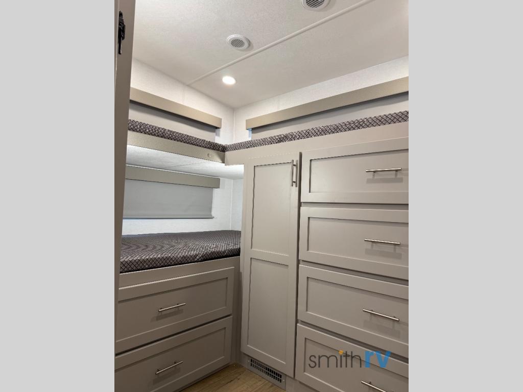 Your kiddos will love this trailer’s rear bunk beds! These bunk beds are perfect for them (or kids at heart!), providing a cozy and comfortable sleeping space. The kitchen is equipped with a refrigerator, microwave, and overhead cabinets, making meal preparation and storage easy. The sink is conveniently located for food prep and cleanup. The L-dinette provide a comfortable spot for meals and socializing. The 68” theater seating is perfect for relaxing and enjoying your favorite shows or movies. The full bathroom provides a private space for personal care, and the front bedroom features a queen bed and nightstands. This serene space is perfect for recharging after a day of adventure!