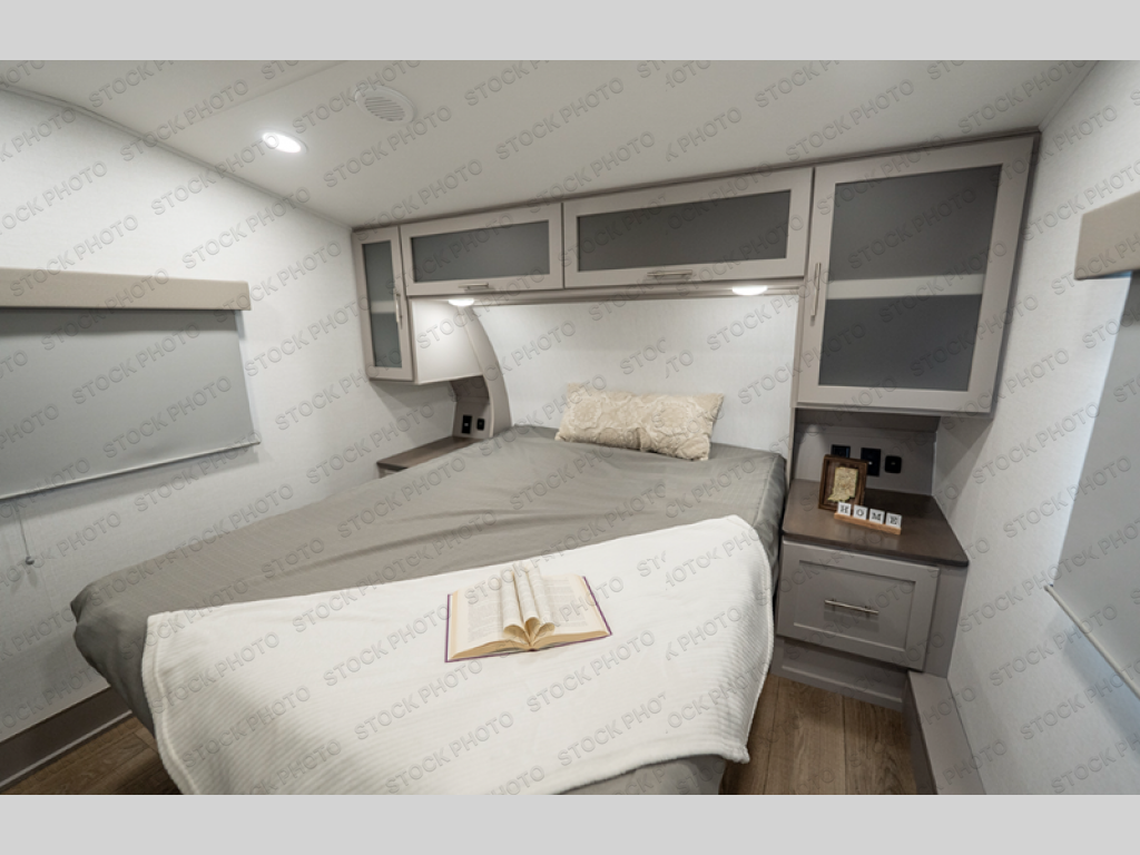 For the couple that enjoys adventures, this rear living coach has everything you need to travel comfortably and take along a couple of friends! The front private bedroom has a queen bed with nightstands on either side for your personal belongings, and a wardrobe to keep your clothes looking nice. Freshen up each morning in the full bathroom with a 30" x 36" shower, and grab a towel stored close by in the linen closet. Now that you're ready for the day, you can head to the kitchen and create a hearty breakfast with the full kitchen amenities. You will appreciate having a 10 cu. ft. 12V refrigerator and three burner cooktop, plus there is a center island with plenty of counter space and a sink to make food prep even easier. Spend your evenings in true relaxation in the dual recliner theater seats across from the swing mount 50" HDTV with hidden storage behind. You will also love the pantry and hutch in the kitchen area for storing all of your dishes and non-perishables. Dine at the floating table with two chairs along with a moveable ottoman featuring storage.