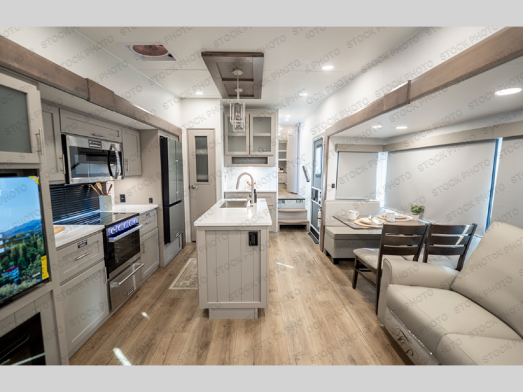A benchmark chassis creates a space saver upper deck with each one of these Avenue All-Access fifth wheels by Alliance RV! The 101 in. wide-body construction gives you more room to walk around and the flush slide out floors throughout prevent any tripping. There are composite sidewalls inside and out, and PVC roof for extreme durability. You are sure to love no carpet throughout making each Avenue All-Access easy to clean and allergen free, not to mention pet friendly. You can maximize your space throughout with innovative storage solutions like the hidden storage behind the TV, inside the end tables, ottoman, and dinette chairs. These units also include the OTG Solar Package with a 200 watt solar panel, 15 amp MPPT charger, multiple outlets, and more to keep you powered up!
