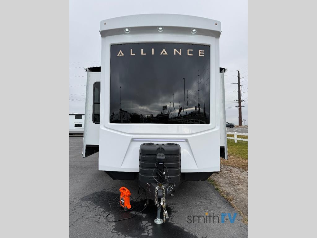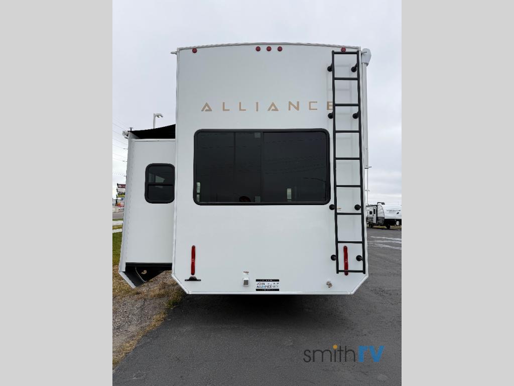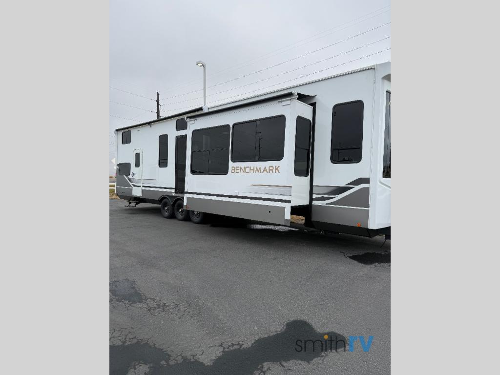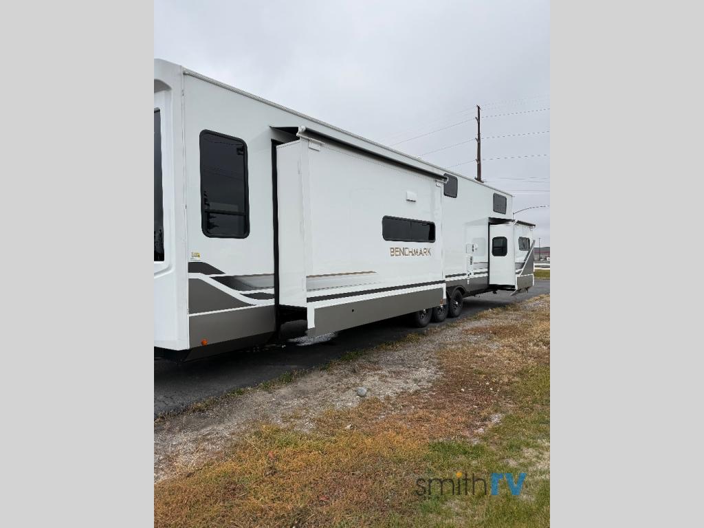 With any Benchmark destination trailer by Alliance RV, you will enjoy luxury features at every turn! The high gloss fiberglass exterior is ultra sleek, and the Azdel composite fiberglass sidewalls add durability so you can camp for years to come. You'll also find a residential exterior garden hose connection outside, along with a powder coated aluminum rear ladder, and an auxiliary LP tank hook up if you want to bring your grill along. Head inside to find hardwood cabinetry, solid surface countertops throughout, oversized windows in all rooms, and MCD roller shades throughout. The 45,000 BTU A/C and 60,000 BTU furnace will keep you comfortable year around, and there is a stackable washer and dryer to make full-time RV living easier than ever!