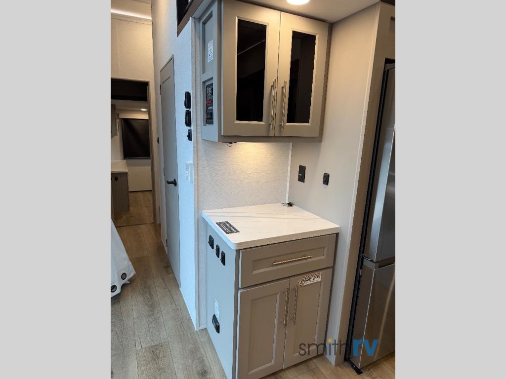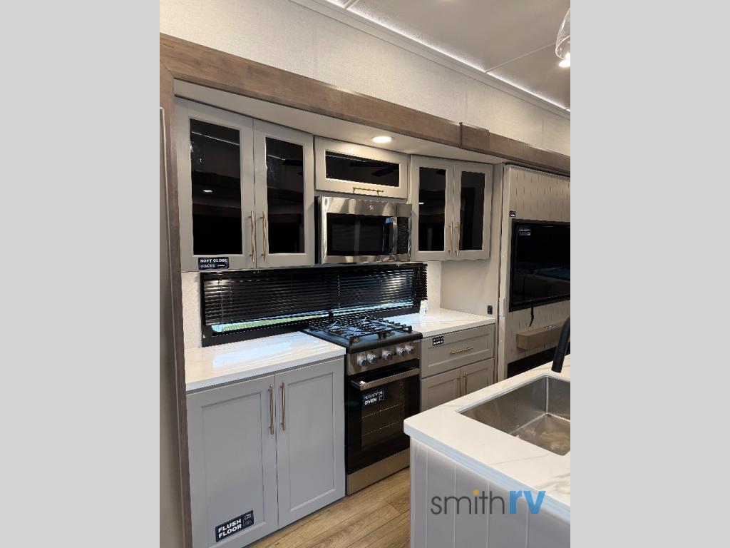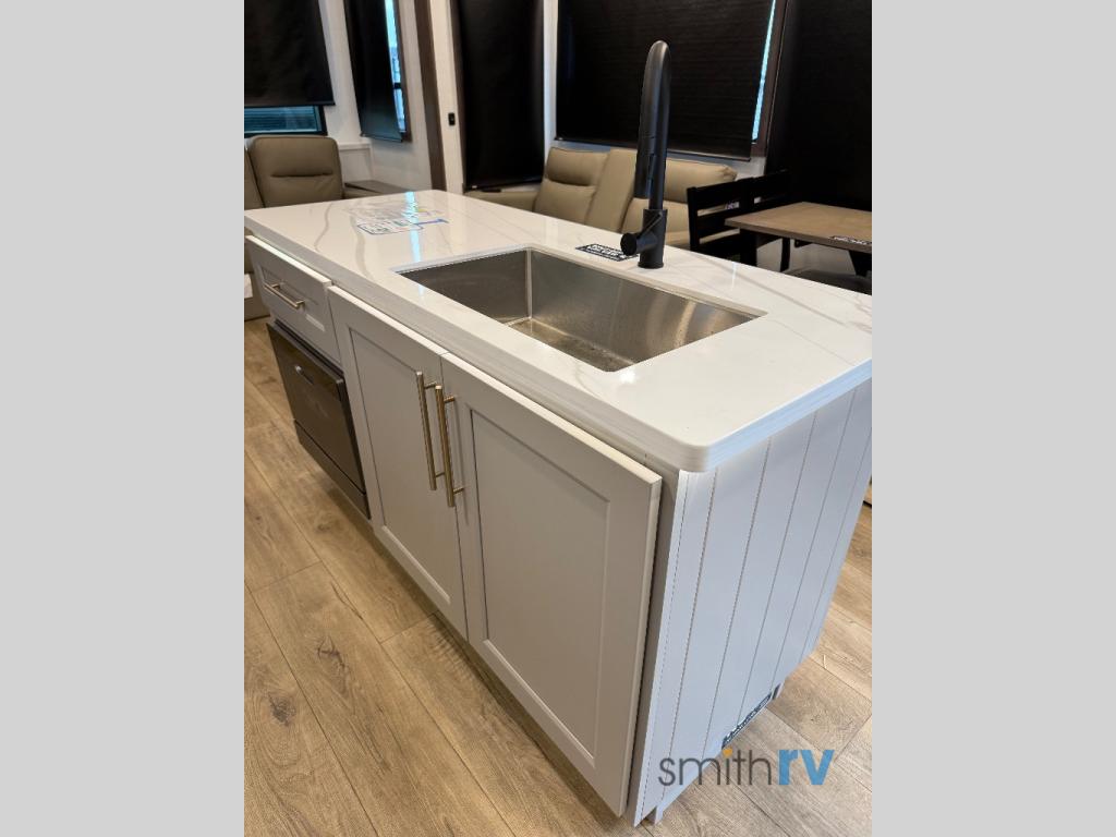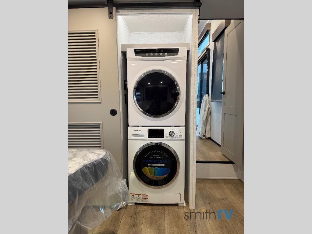 With any Benchmark destination trailer by Alliance RV, you will enjoy luxury features at every turn! The high gloss fiberglass exterior is ultra sleek, and the Azdel composite fiberglass sidewalls add durability so you can camp for years to come. You'll also find a residential exterior garden hose connection outside, along with a powder coated aluminum rear ladder, and an auxiliary LP tank hook up if you want to bring your grill along. Head inside to find hardwood cabinetry, solid surface countertops throughout, oversized windows in all rooms, and MCD roller shades throughout. The 45,000 BTU A/C and 60,000 BTU furnace will keep you comfortable year around, and there is a stackable washer and dryer to make full-time RV living easier than ever!
