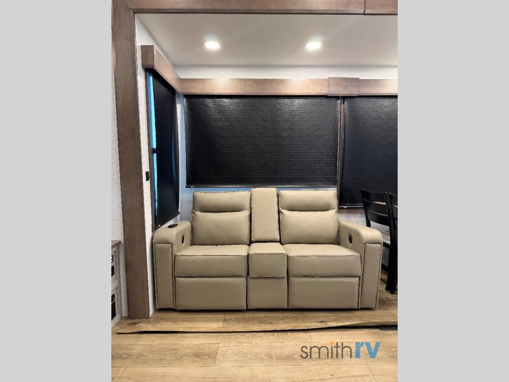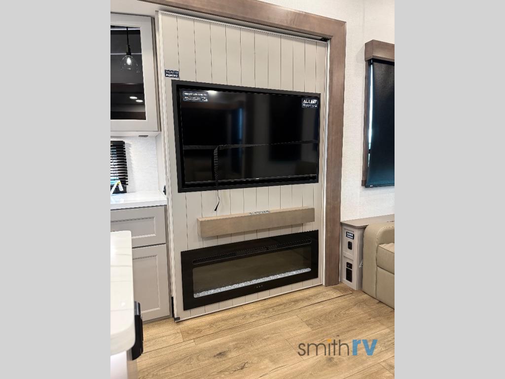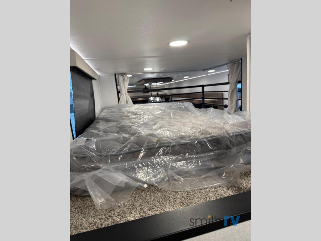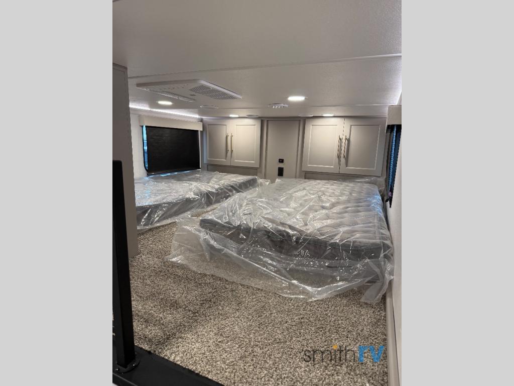 This destination trailer with a loft will be a favorite with the little ones! They will have three bunk mats to choose from plus wardrobes to keep their things picked up. You can take the rear private bedroom that includes a power tilting king bed that will allow you to sit up in bed at night to read. There is also a wardrobe, a dresser with a 32" TV, and a stackable washer and dryer to make laundry day easier than ever. A full bath with a 48" x 30" shower will let you freshen up each day, and there is a linen closet to keep clean towels close by. Everyone will enjoy spending time together in the front living area that includes a two dual recliner theater seats, a 50" TV and fireplace, and hidden storage for games or books. The chef of your group can make meals each day on the residential range and microwave, and there is a 110V Samsung refrigerator to keep your food fresh.