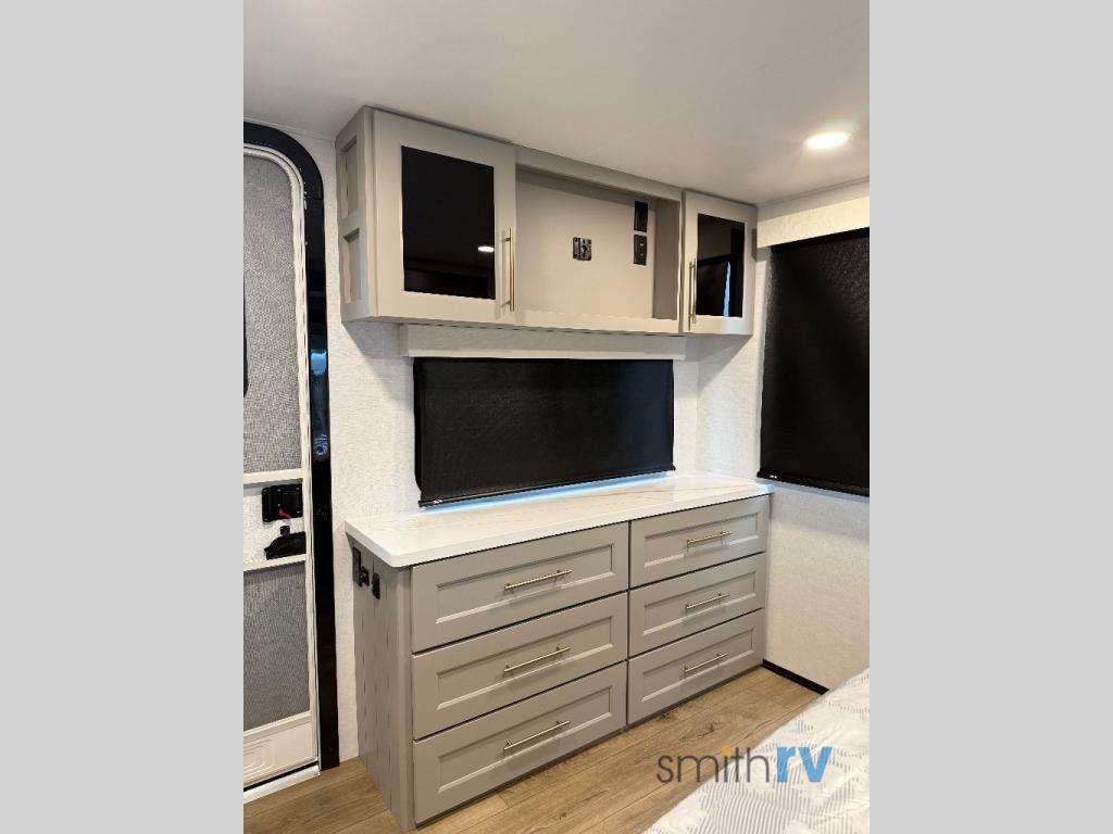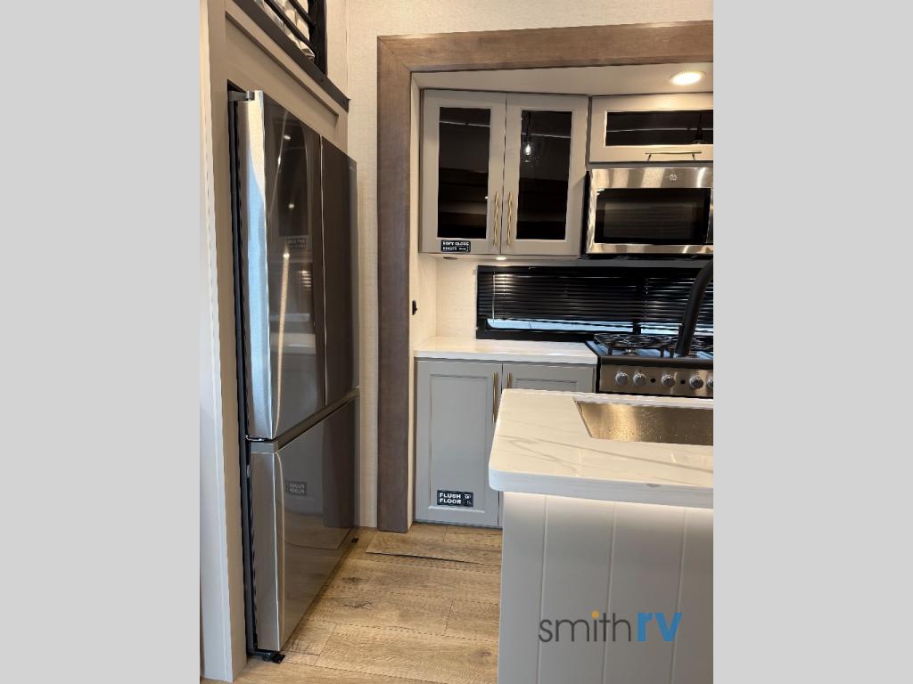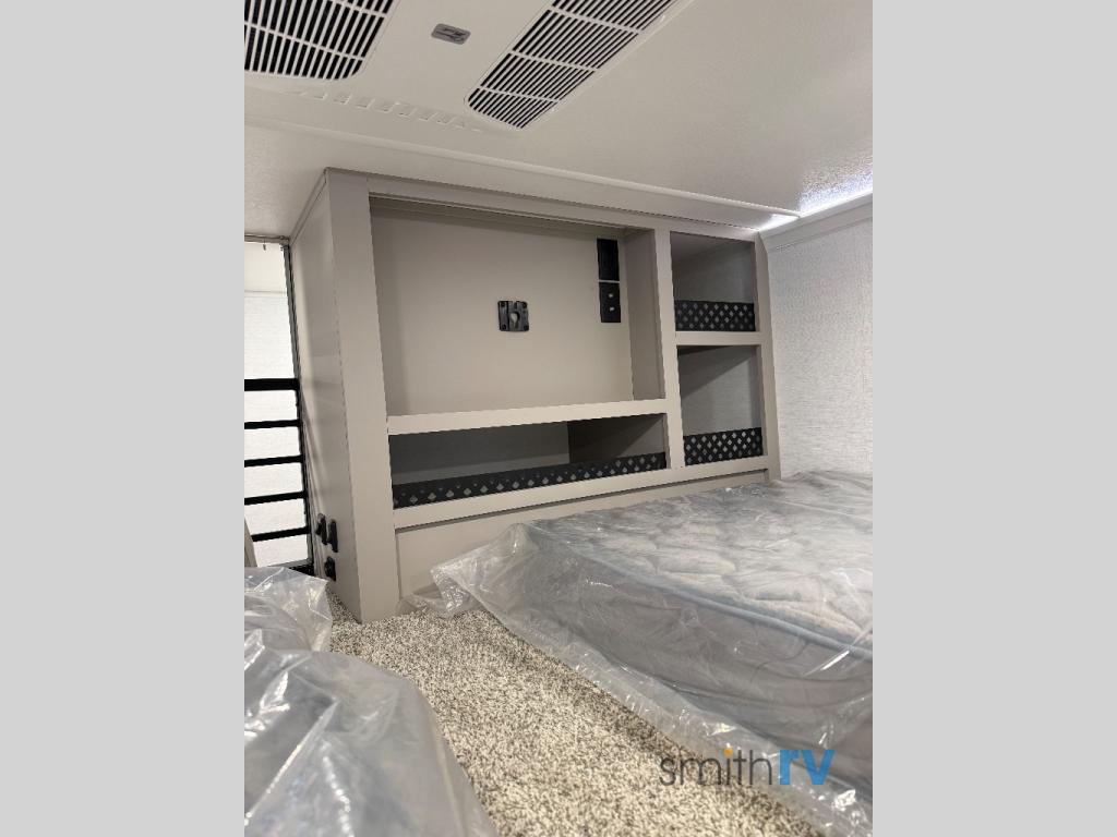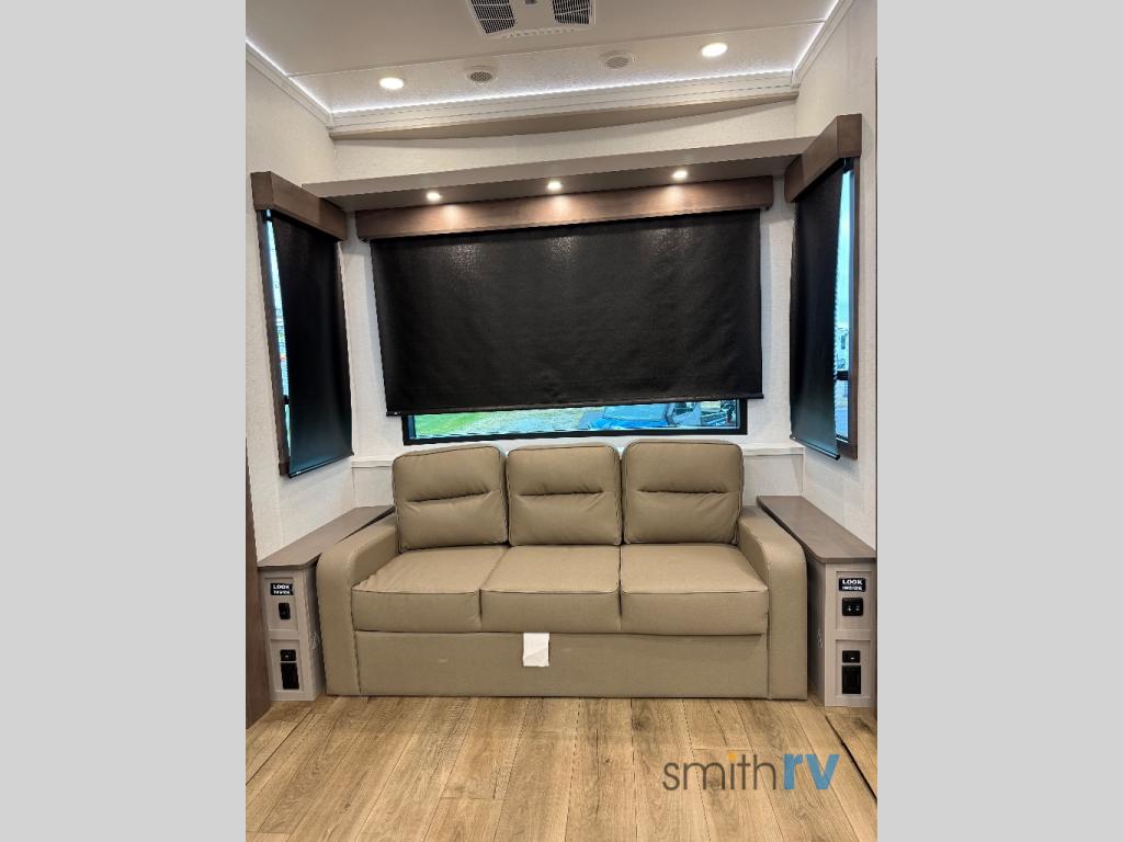 This destination trailer with a loft will be a favorite with the little ones! They will have three bunk mats to choose from plus wardrobes to keep their things picked up. You can take the rear private bedroom that includes a power tilting king bed that will allow you to sit up in bed at night to read. There is also a wardrobe, a dresser with a 32" TV, and a stackable washer and dryer to make laundry day easier than ever. A full bath with a 48" x 30" shower will let you freshen up each day, and there is a linen closet to keep clean towels close by. Everyone will enjoy spending time together in the front living area that includes a two dual recliner theater seats, a 50" TV and fireplace, and hidden storage for games or books. The chef of your group can make meals each day on the residential range and microwave, and there is a 110V Samsung refrigerator to keep your food fresh.