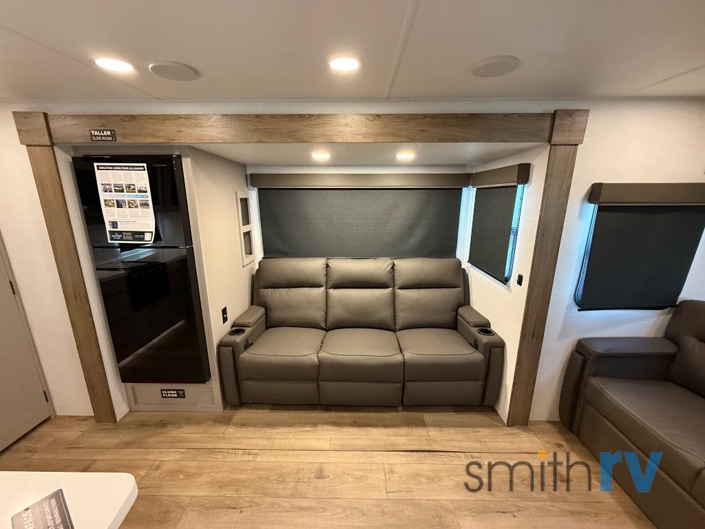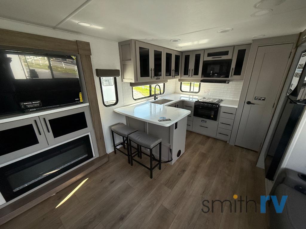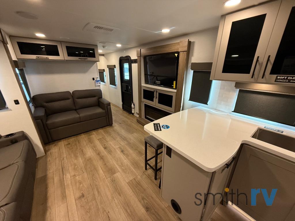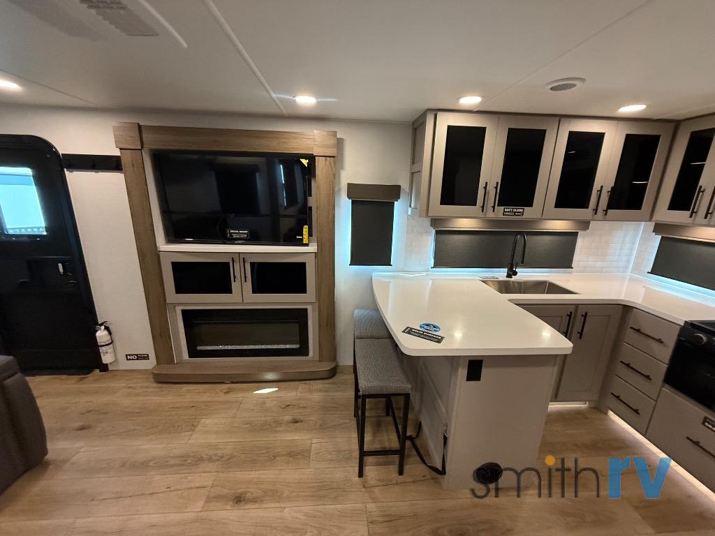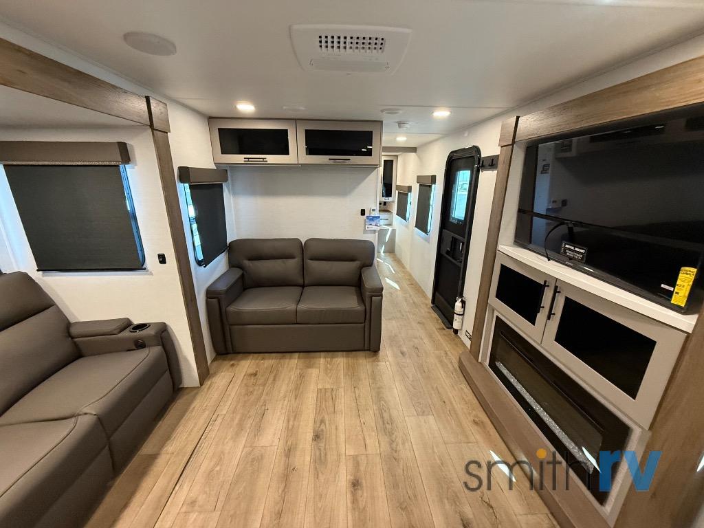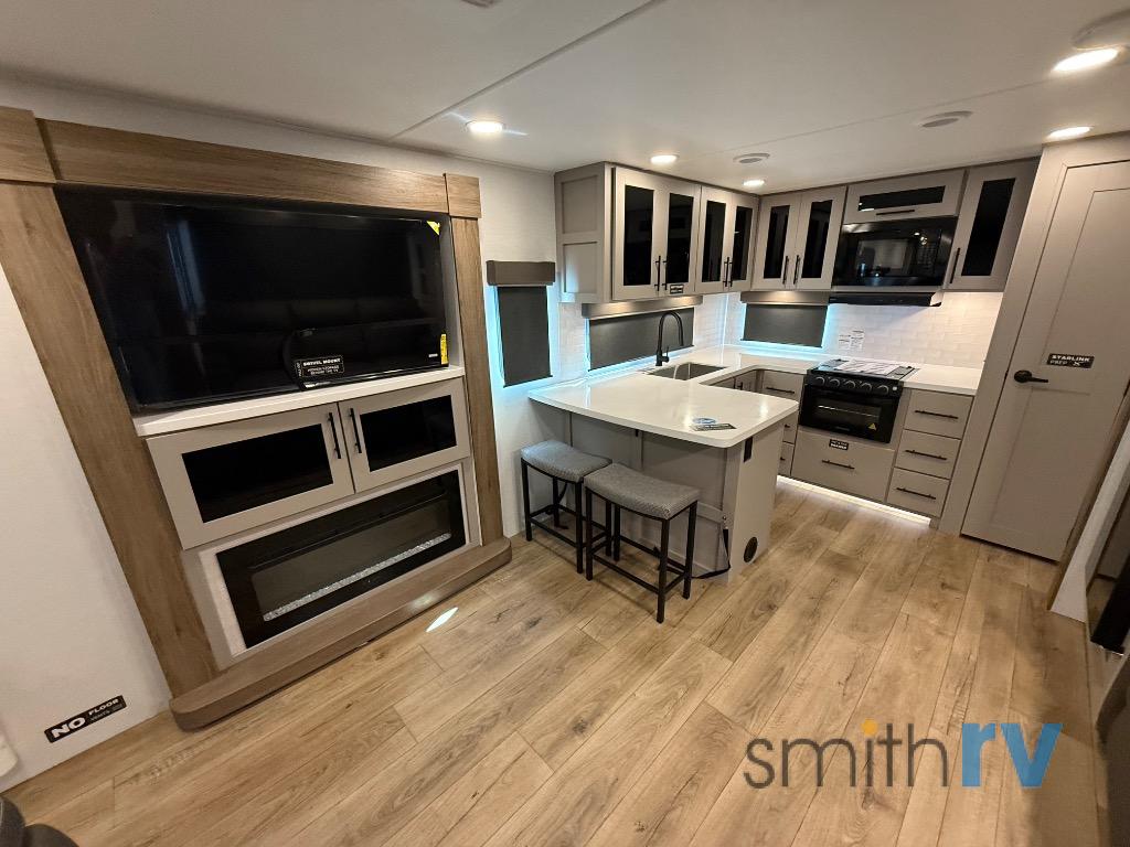 Start camping in luxury with this travel trailer! Prepare your best home cooked meals in the rear kitchen with the three burner cooktop, 10 cu. ft. 12V refrigerator, tip-out trash can, and even two bar stools to enjoy your morning coffee while reading the newspaper. Freshen up in the full bathroom with the 30" x 36" shower or head outside to relax under one of the two awnings. There is even an outdoor griddle/grill underneath one of the awnings to protect you while you grill up some juicy burgers, plus an outside 32" TV. The front private bedroom has a queen bed for you to lay your head on at night and has wardrobe nightstands for your items. Relax in true comfort each night on one of the two furniture spots in front of the entertainment center with a 50" class HDTV with a fireplace below it!