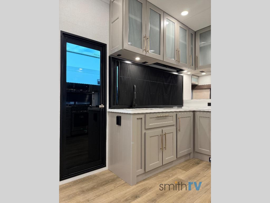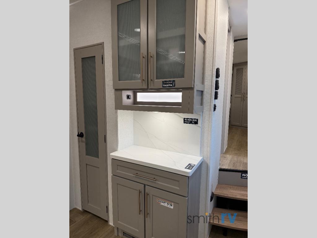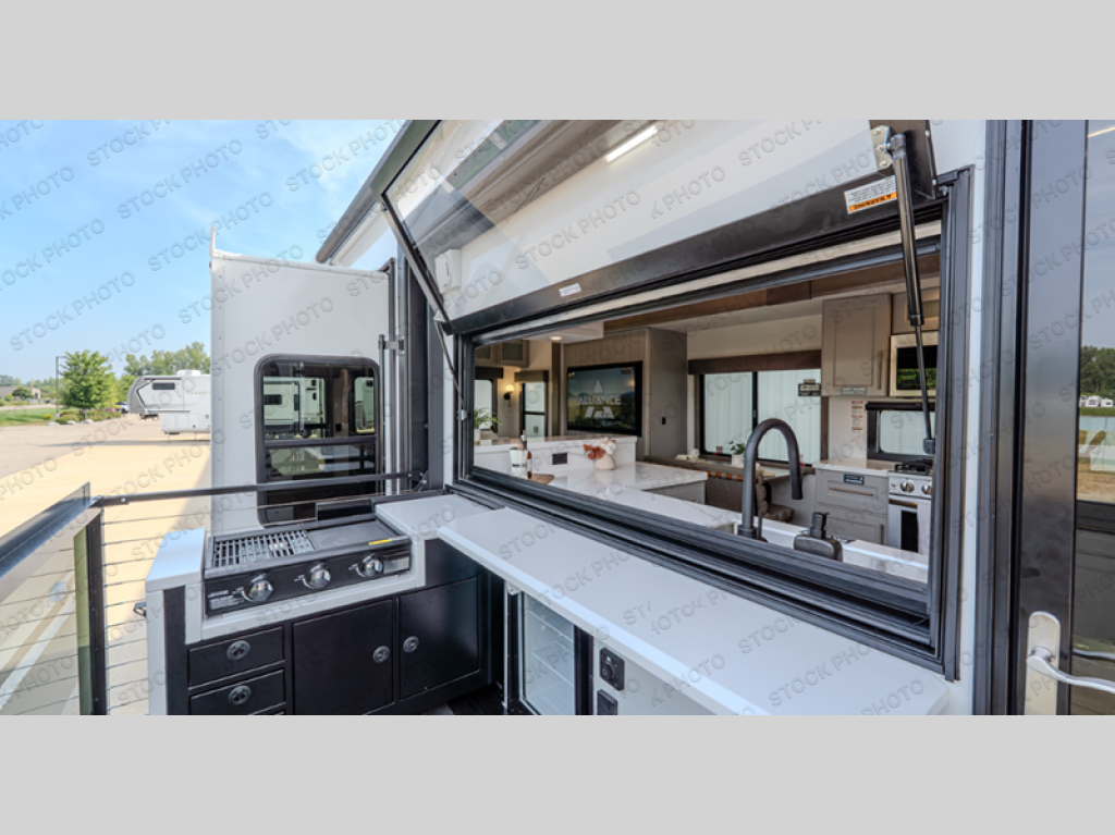 You will fall in love with this unit’s slide patio with picture window, the perfect spot to take in the breathtaking views. Enjoy outdoor cooking with the countertop prep area and pull-out grill, while the drop-down TV provides entertainment for all. Inside, rear living area features two sleeper sofas, perfect for lounging and relaxing. Overhead cabinets provide ample storage, while the 50” class smart TV offers endless entertainment options. Gather around the turn table dinette for meals or socializing. The kitchen is fully equipped with a microwave, sink, refrigerator, pantry, and hutch, making meal preparation and storage a breeze. Also this unit has a full bathroom and a cozy front bedroom which boast a king bed, ample closet, a TV, and so much more!