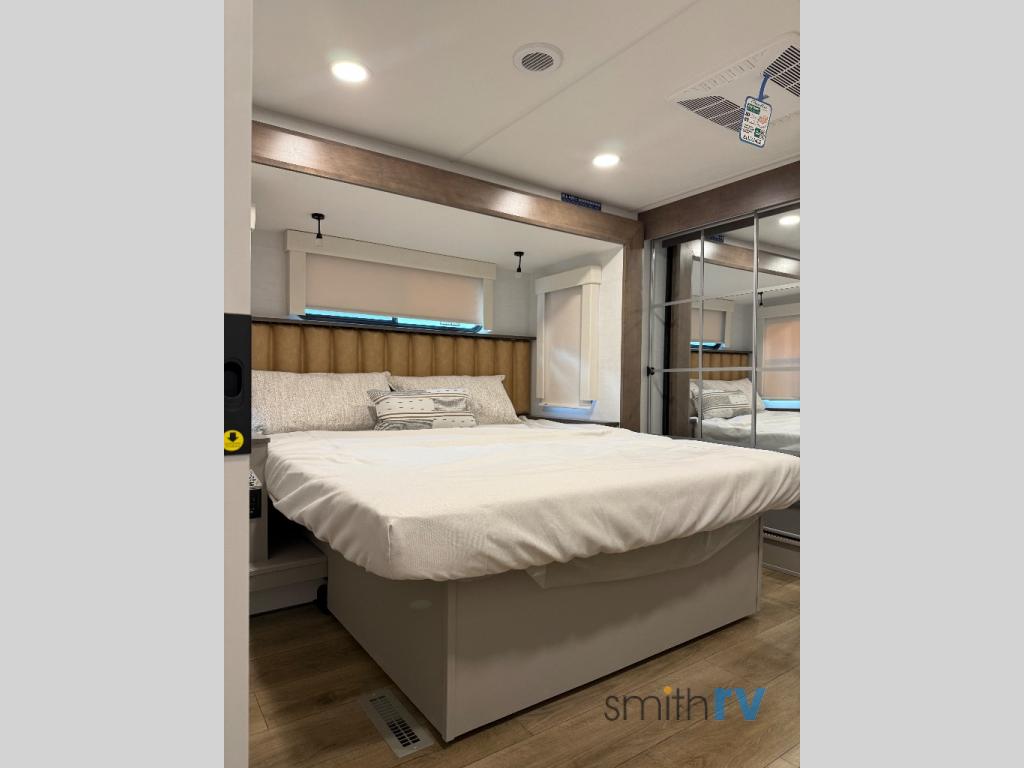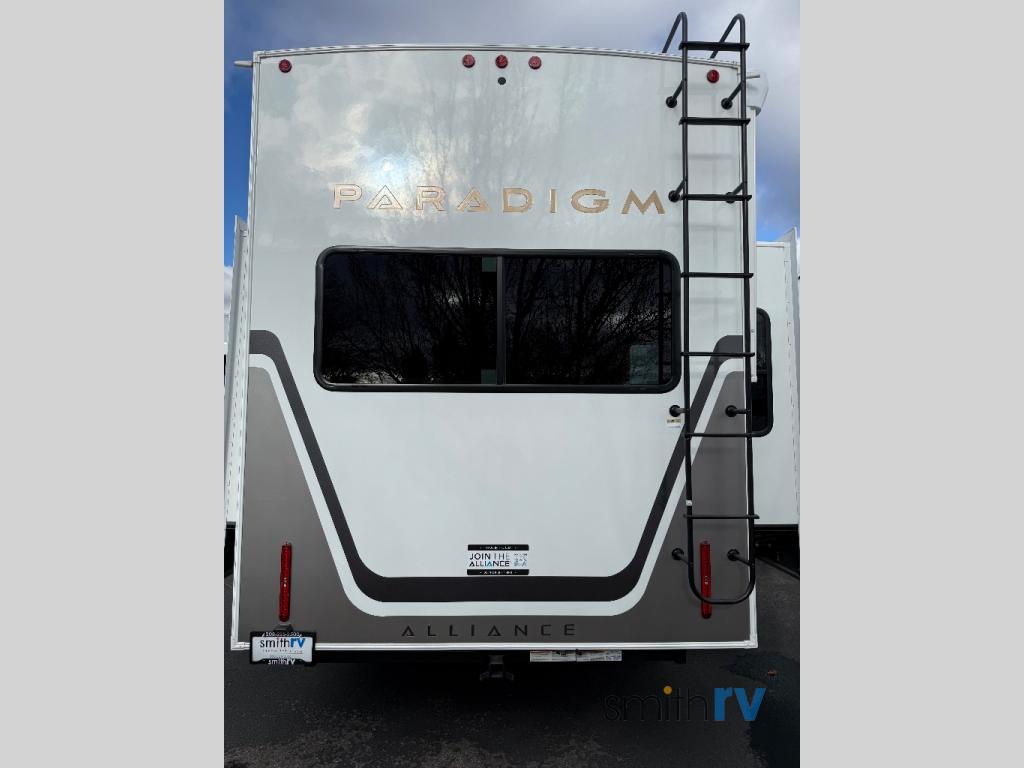 The Paradigm fifth wheels by Alliance RV are functional, high-quality, and luxurious for an unforgettable camping experience. There are three A/C units and a 40K BTU furnace to keep you comfortable year around, and you'll appreciate additional convenient amenities, like the all-in-one enclosed/heated utility center and the color coded and numbered wiring. A Helux Series coil spring pin box comes standard for hassle-free towing, along with Curt 8,000 lb. axles. You'll love the kitchen with its LG solid surface countertops and Lusso range, plus there is LED motion lighting in the pantry and a Maxx fan with a rain sensor to keep everything fresh when making dinner. Each model also includes an HD Smart TV in the living room and bedroom. And of course there are a variety of options you can choose from to further customize your fifth wheel; dual pane windows, Super Solar Plus, slide out awning toppers, and generator prep or a generator to name a few!