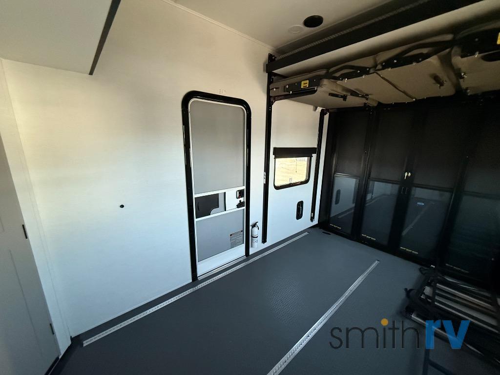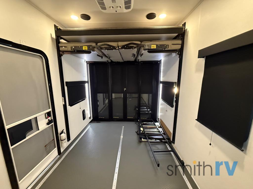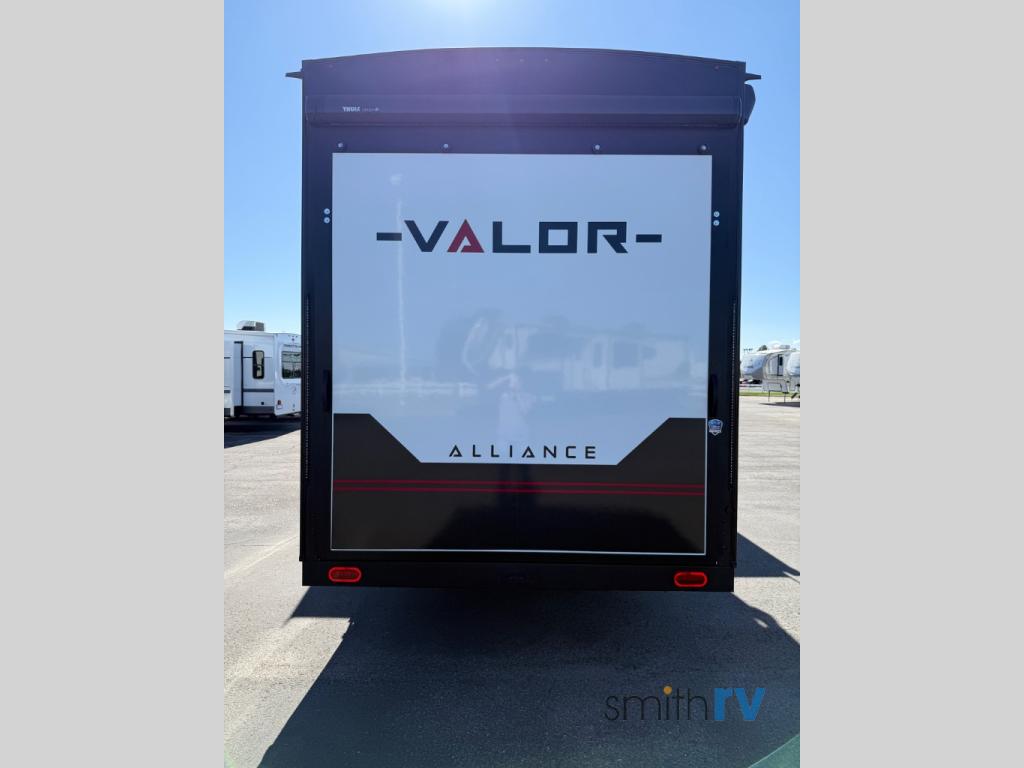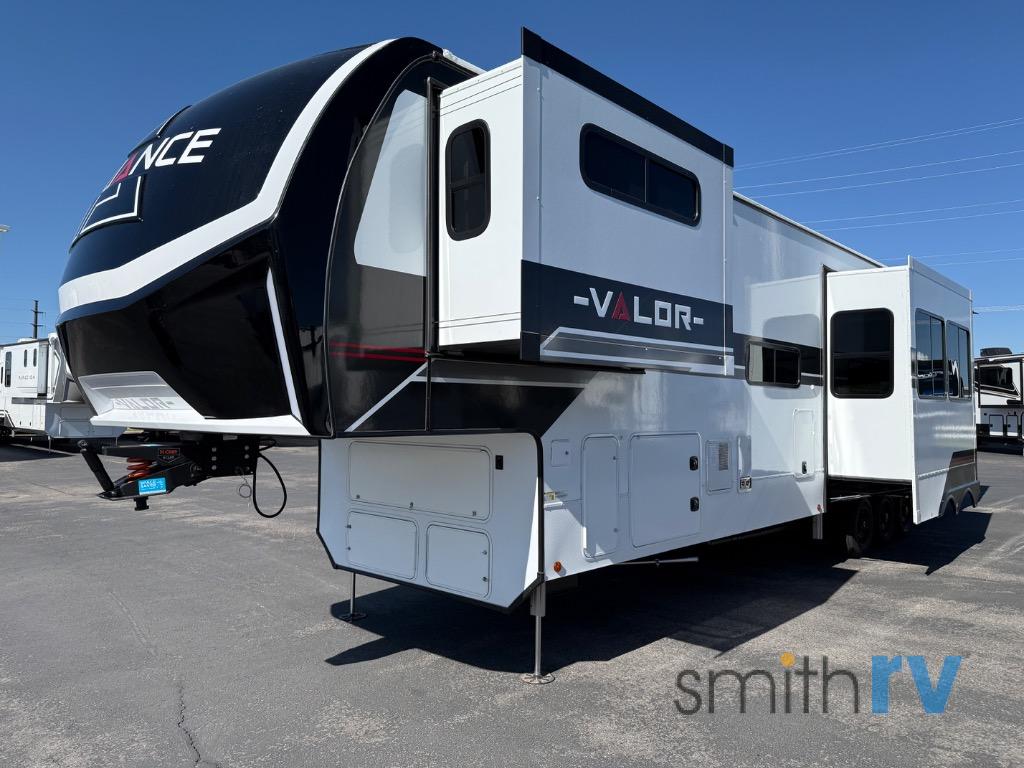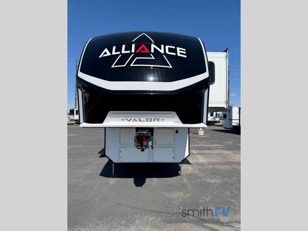 You can bring your toys with you wherever you go with any one of these Alliance RV Valor toy hauler fifth wheels! They are adventure-ready with a quality build from the walk on roof with seamless PVC roof covering to the commercial grade vinyl flooring and MorRyde CRE3000 suspension system. The Performance Running Gear package comes with a 101" wide-body benchmark chassis platform, 7,000 lb. Dexter axles, and a space enhancing drop frame storage compartment to pack in all your riding gear. You can even go off-gridding thanks to the Off the Grid Pack that has two 400 watt solar panels, generator prep, a 40 amp charge controller, and a 100 amp hour lithium iron phosphate battery. Some of the interior comforts you will enjoy are the hardwood cabinet doors and drawers, solid surface kitchen countertops, and commercial grade vinyl flooring with no carpet to make clean up a breeze. The Valor toy haulers are also the Master of 12 Volt with USB charging station throughout, a stainless steel refrigerator, and more 12 volt features to make camping hassle-free!