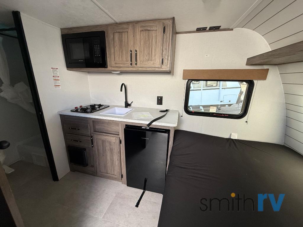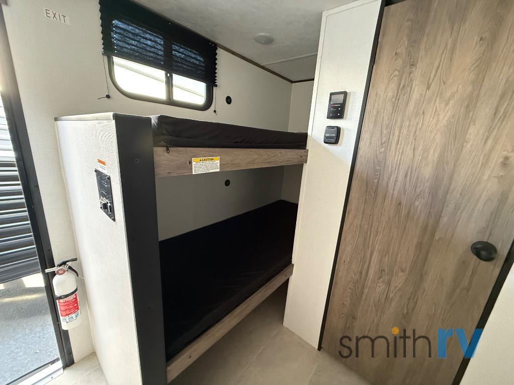 This compact, yet cozy travel trailer is perfect for weekend trips to the lake. There is a queen bed up front with overhead cabinets for your books, board games and more. Your guests or littles ones can claim the bunk beds in the rear corner, and everyone can stay clean with the private shower and toilet. A functional kitchenette will let you make meals for your crew, and the refrigerator will keep cold items fresh!