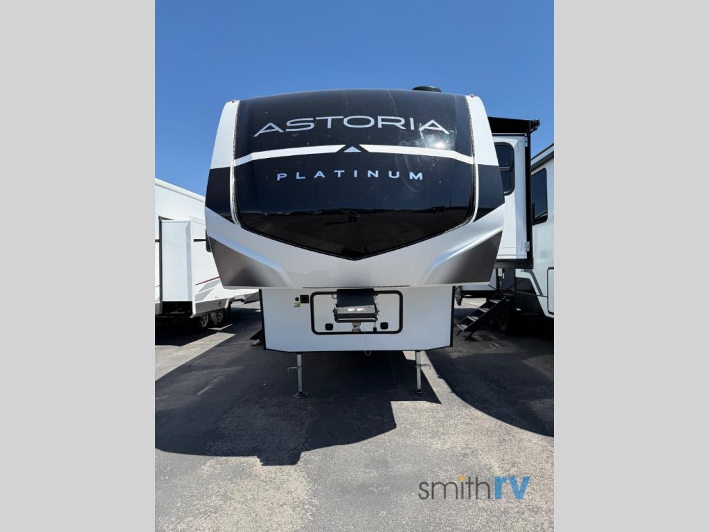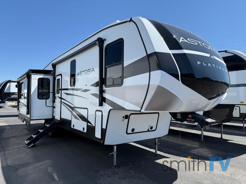 Each one of these Dutchmen RV Astoria Platinum fifth wheels feature a fiberglass exterior for added durability and an All Weather Thermal Package so you can camp all year long! There are also MorRyde Solid entry steps, slam latch baggage doors, and many more exterior conveniences. You'll enjoy a 200W solar panel for off-grid capabilities, slam latch baggage doors, and a power awning with LED lights for an inviting outdoor space. The interior is designed with bathroom backsplash, night shades throughout the living area, and Thomas Payne furniture collection. The on-demand tankless water heater will provide endless hot showers, and the dual ducted A/C will keep you cool all summer long.