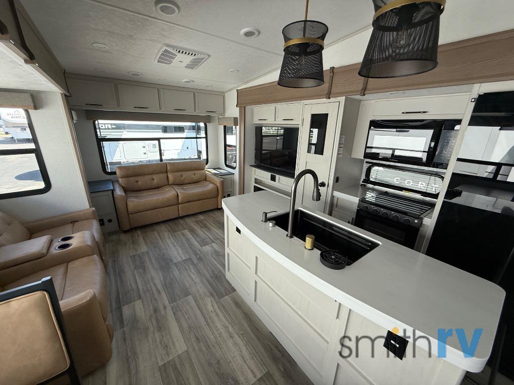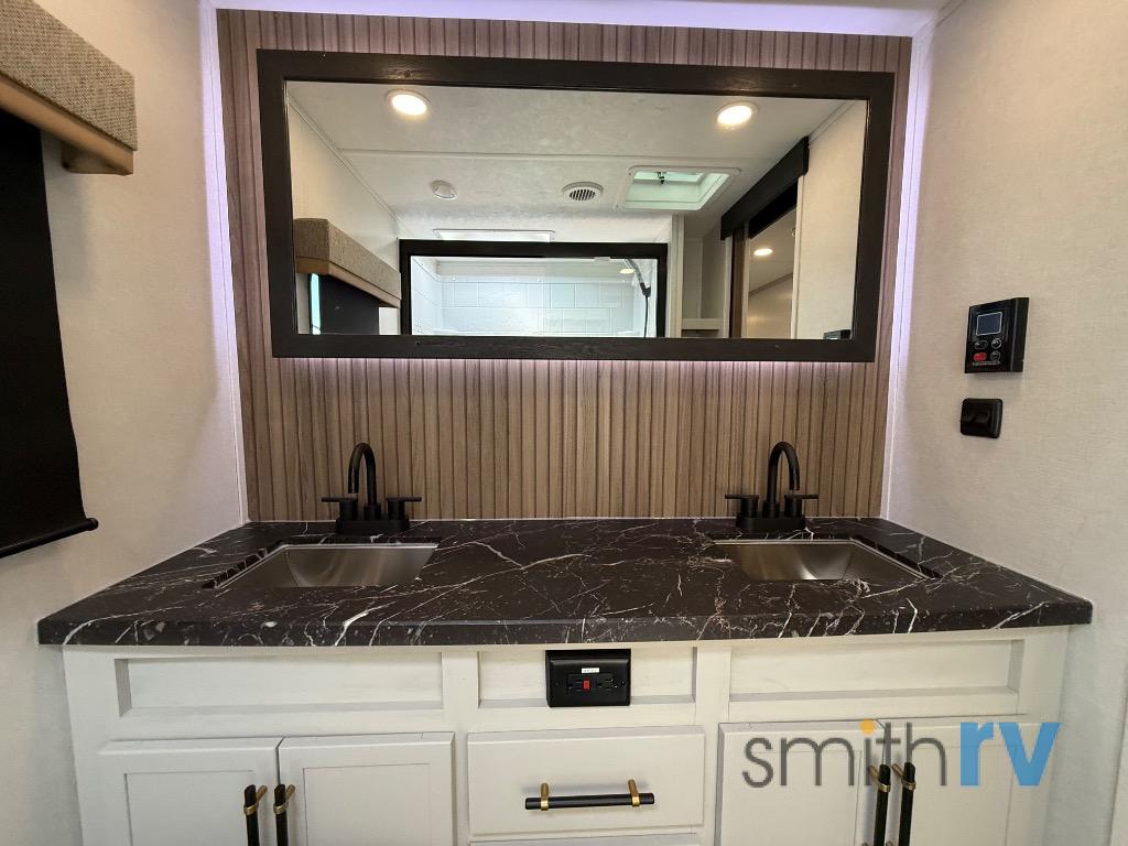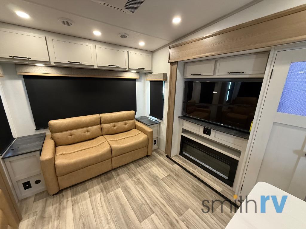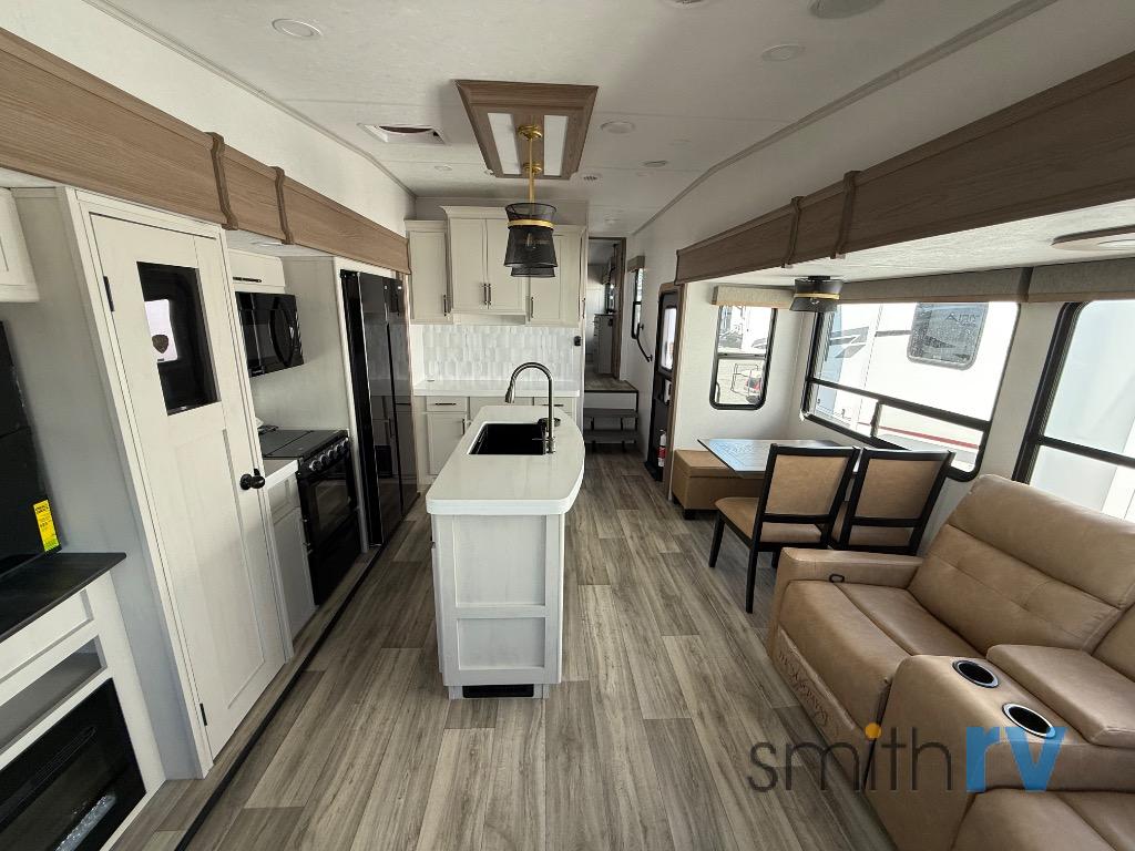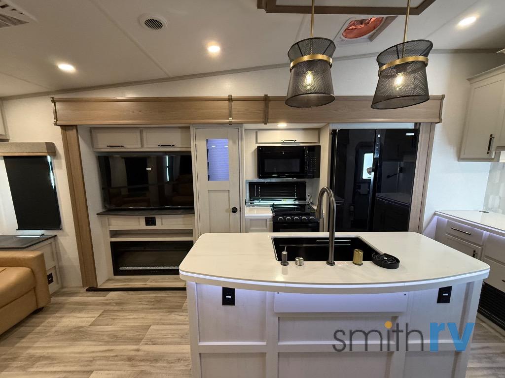 Two can get ready at once with a dual sink vanity in the full bathroom of this fifth wheel! Enjoy a good night's rest and interior space with the king bed slide in the front private bedroom which also has a front wardrobe to keep your clothes looking their best, and a closet with washer/dryer prep. The chef will have an easy time preparing meals in the kitchen with the island, the extra countertop space below the hutch, and the glass top three burner cooktop with the oven. The rear living area has a tri-fold sofa and theater seating across from an entertainment center with a fireplace and an HD LED TV!