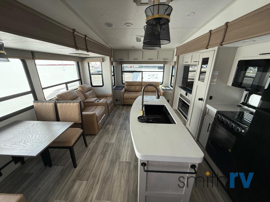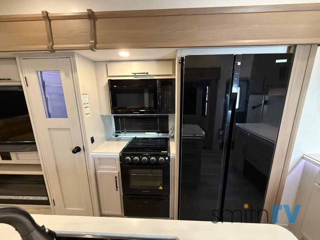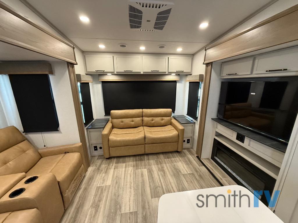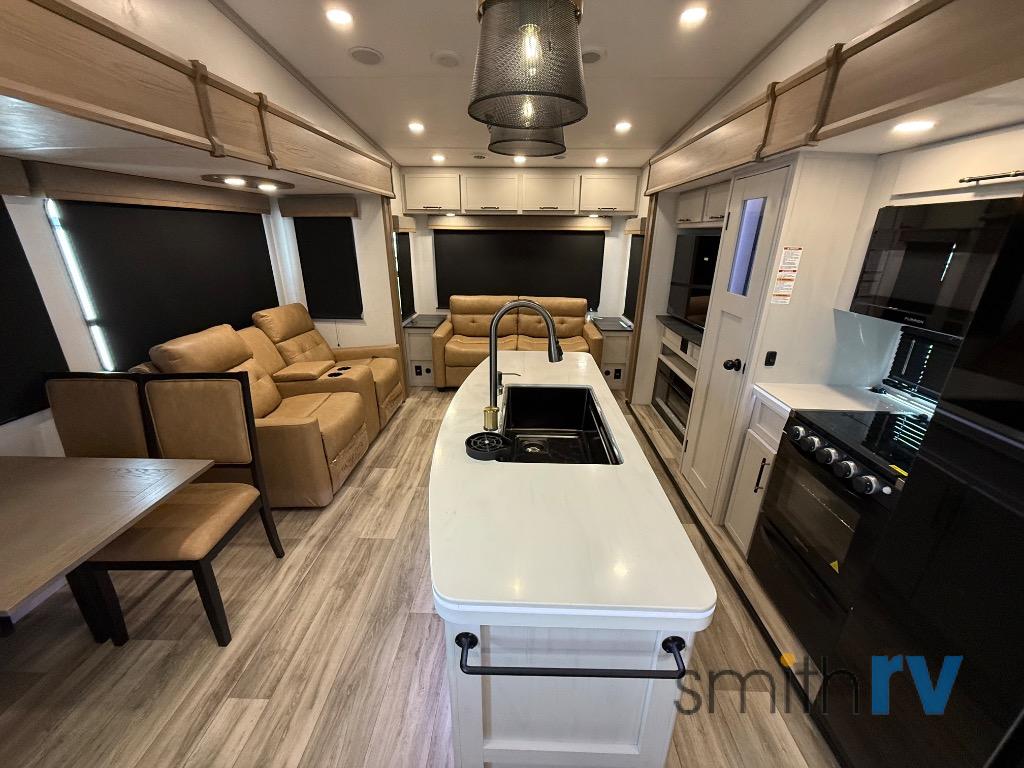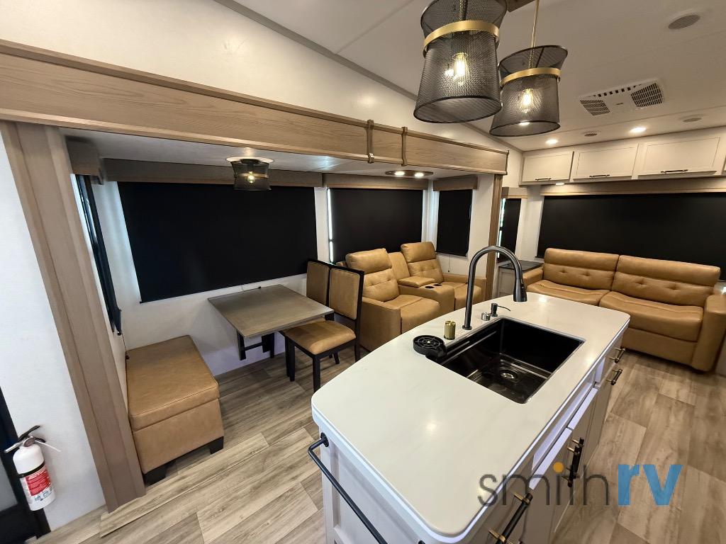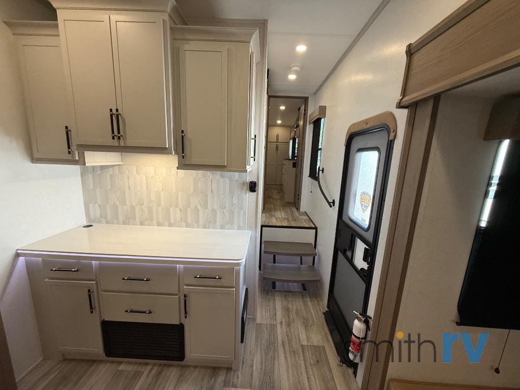 Two can get ready at once with a dual sink vanity in the full bathroom of this fifth wheel! Enjoy a good night's rest and interior space with the king bed slide in the front private bedroom which also has a front wardrobe to keep your clothes looking their best, and a closet with washer/dryer prep. The chef will have an easy time preparing meals in the kitchen with the island, the extra countertop space below the hutch, and the glass top three burner cooktop with the oven. The rear living area has a tri-fold sofa and theater seating across from an entertainment center with a fireplace and an HD LED TV!