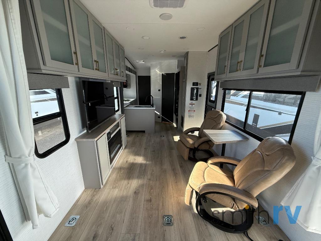 This dual entry travel trailer is sure to meet all your needs. Once you arrive at the campground, unload your toys from the 15' 7" total garage space, then grab a cold drink from the refrigerator. You can then relax on the dual lounge chairs, play a game at the electric pass-thru dinette, or let your guests rest on the electric bed. If you need a rest yourself, you'll find the king bed in the front master bedroom ultra comfortable. This model also includes an entertainment center with a fireplace and a kitchen slide out with the sink, counter space, cooktop, and pantry!