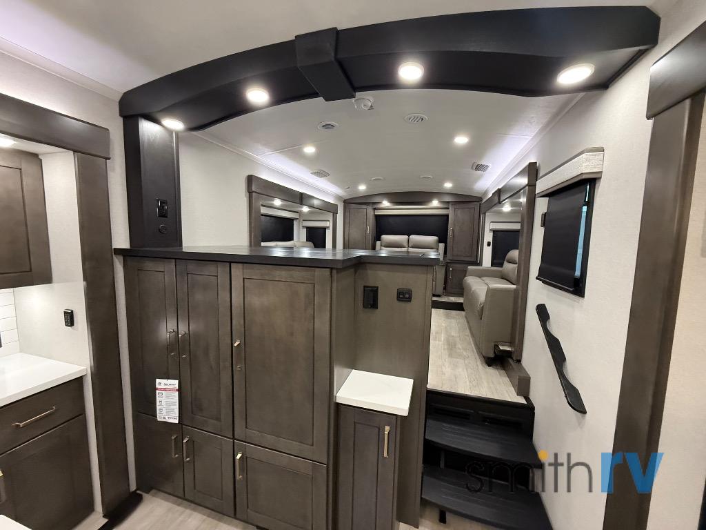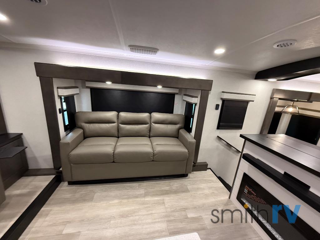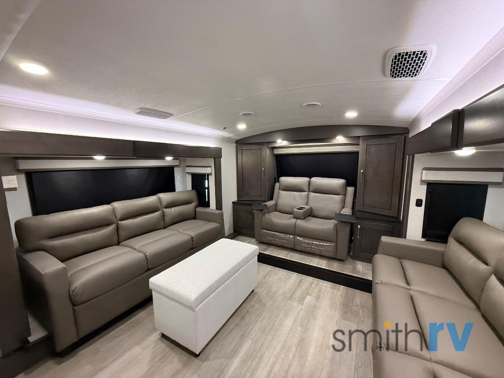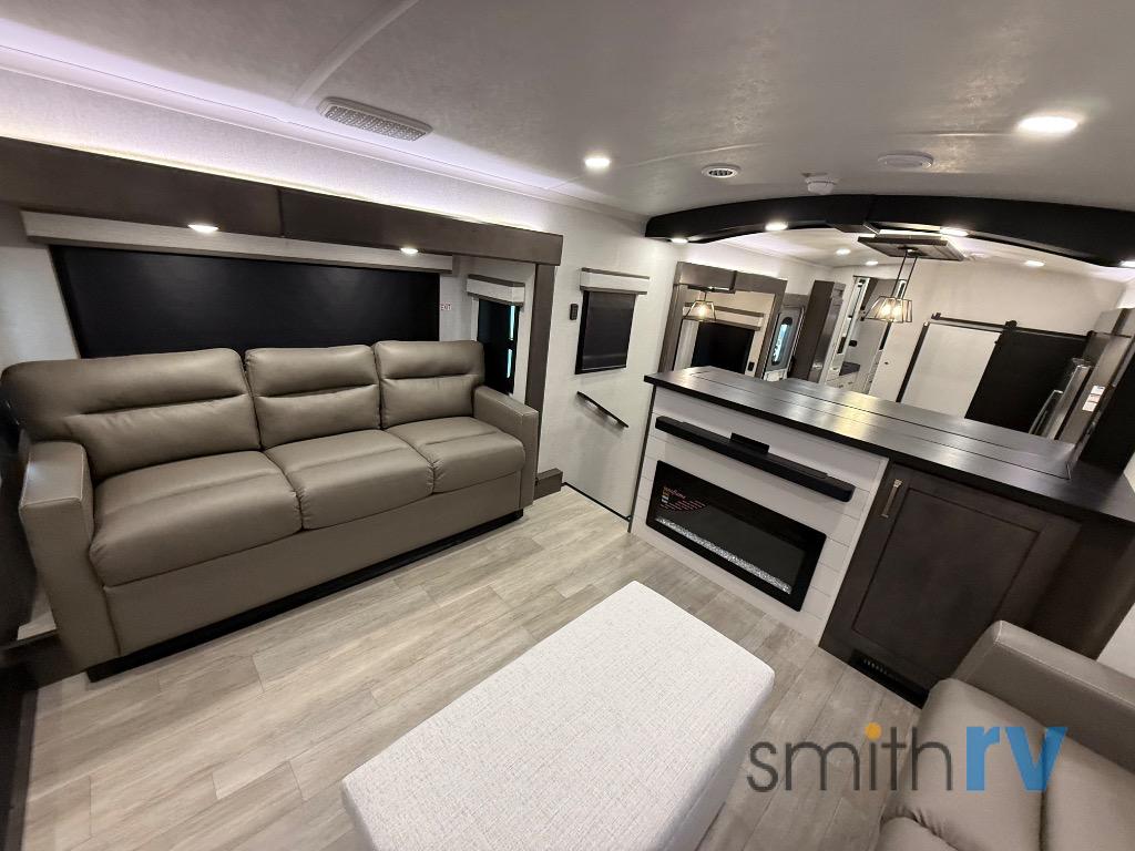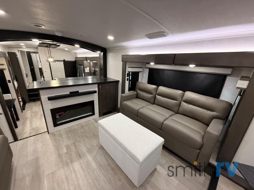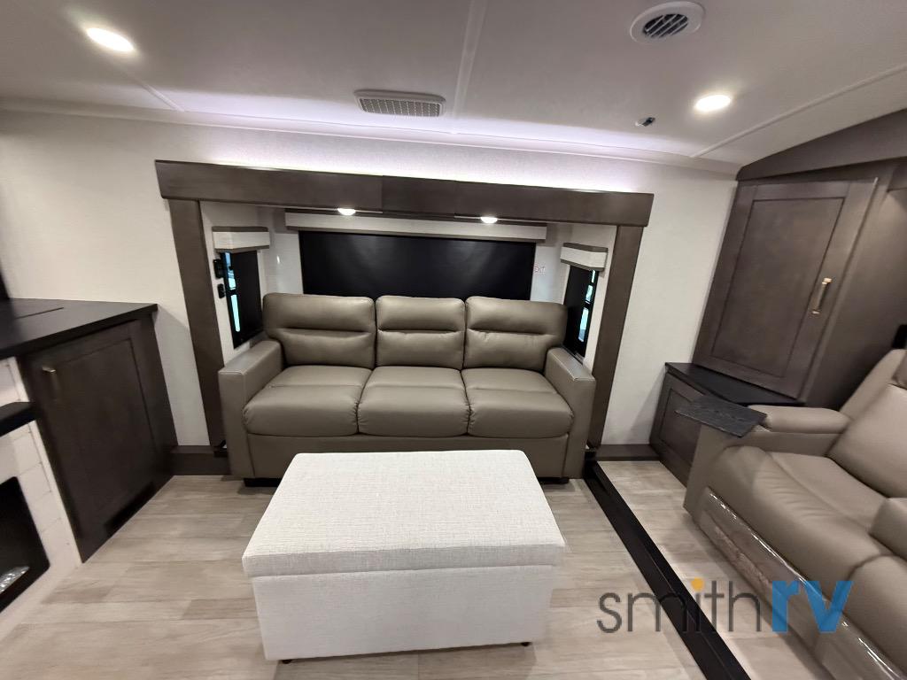 At the front of this 39FL fifth wheel, you’ll find a spacious front living area perfect for movie nights and relaxation. The dual opposing slides each feature an 82" sofa, providing both ample floor space and generous seating, while a theater seat at the very front offers even more comfort. Across the room, the entertainment center includes a cozy fireplace and convenient storage for board games. Moving to the center, the kitchen continues the open layout with its own dual opposing slides. One slide houses a 21-cu. ft. refrigerator, plenty of overhead cabinets, a 24" range, and a 30" convection microwave with a built-in air fryer, everything the on-the-road chef could need. The central kitchen island includes a sink and pull-out cutting board, while the opposite slide provides a dining table and chairs for enjoying meals together. A half bath and a pantry are also conveniently located here for added comfort. At the rear, the bedroom features a king-size 72" x 80" bed on the fifth slide, ensuring a restful night’s sleep. Across from the bed, a bench sits between two wardrobes, offering ample storage for clothing and essentials. Completing the layout, the full rear bathroom includes dual sinks set in an L-shaped counter, a spacious 36" x 48" shower with a seat for accessibility, and all the touches needed for comfort and ease on the road.