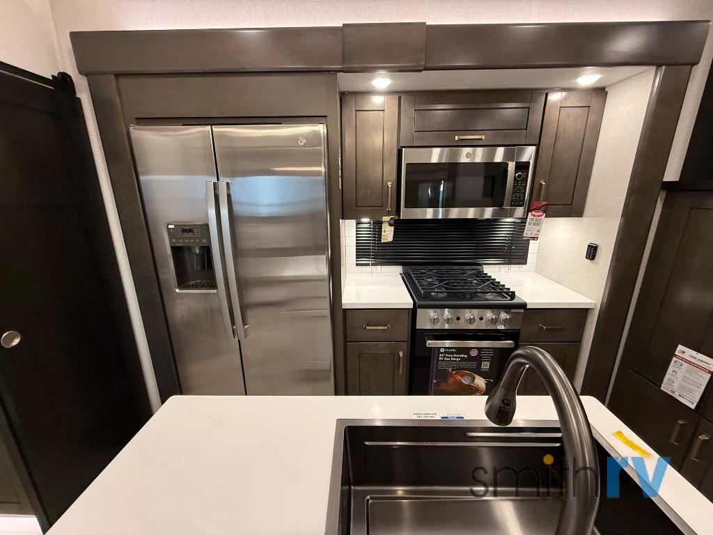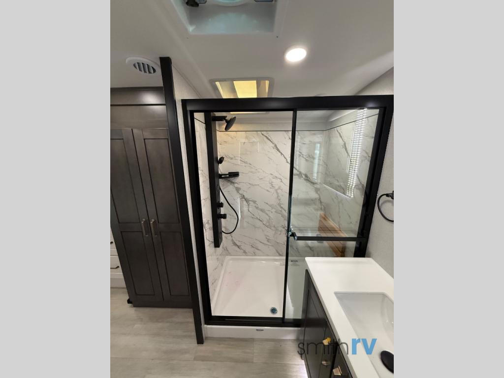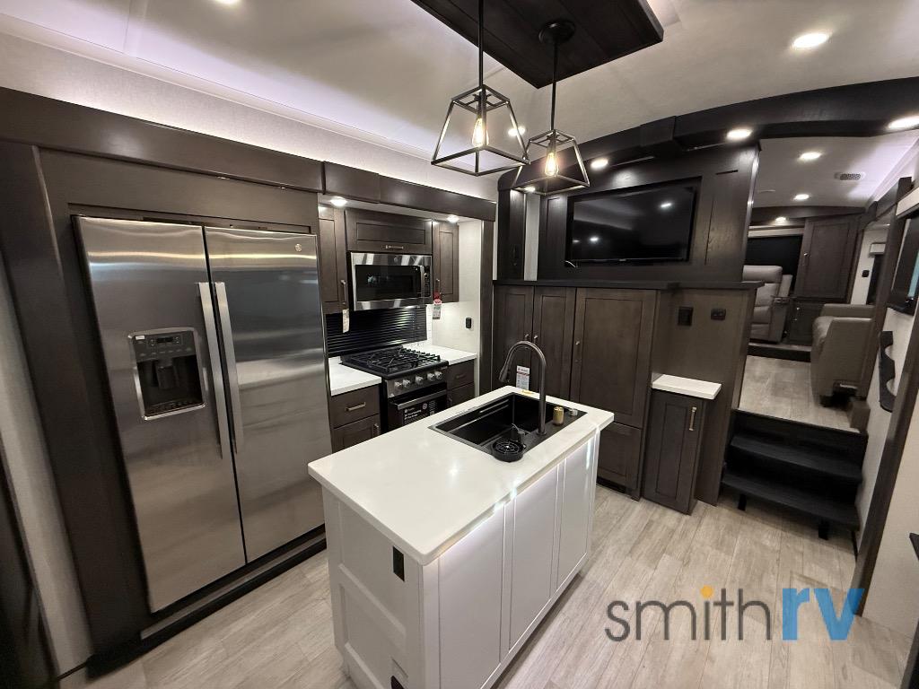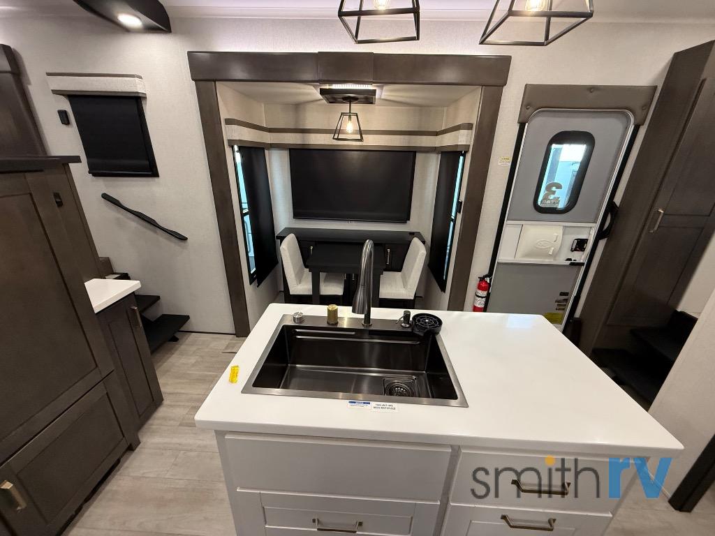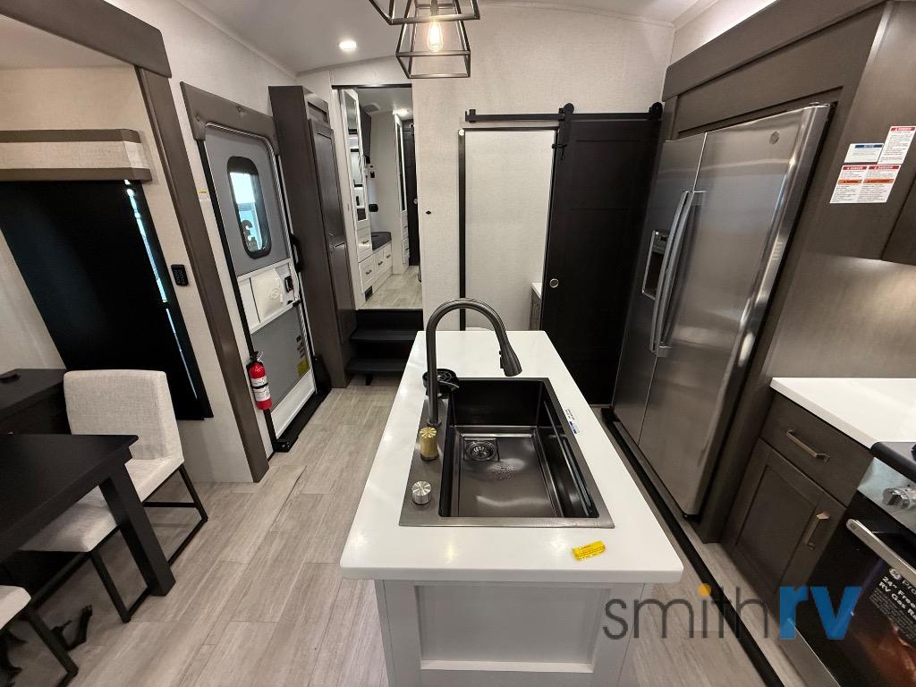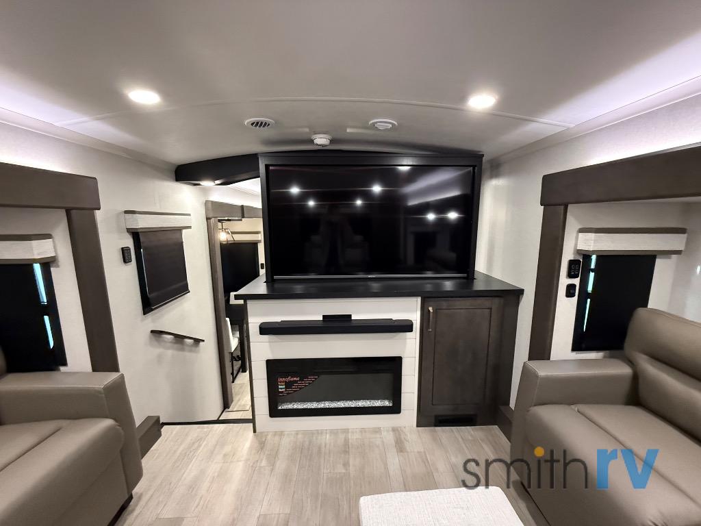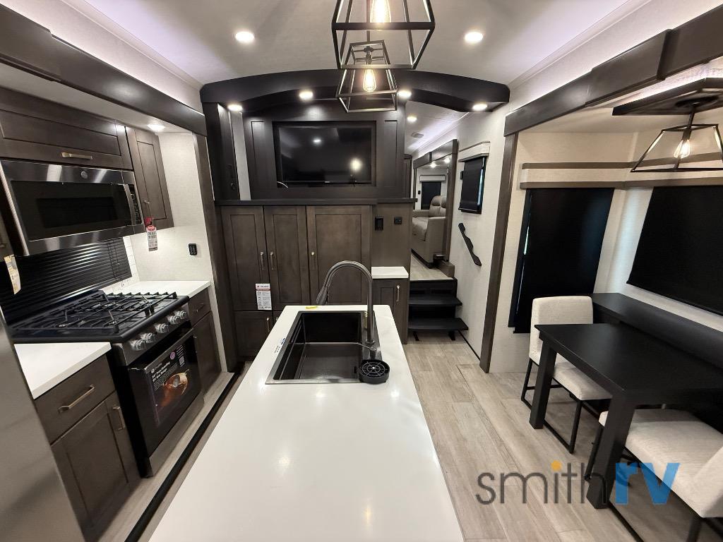 At the front of this 39FL fifth wheel, you’ll find a spacious front living area perfect for movie nights and relaxation. The dual opposing slides each feature an 82" sofa, providing both ample floor space and generous seating, while a theater seat at the very front offers even more comfort. Across the room, the entertainment center includes a cozy fireplace and convenient storage for board games. Moving to the center, the kitchen continues the open layout with its own dual opposing slides. One slide houses a 21-cu. ft. refrigerator, plenty of overhead cabinets, a 24" range, and a 30" convection microwave with a built-in air fryer, everything the on-the-road chef could need. The central kitchen island includes a sink and pull-out cutting board, while the opposite slide provides a dining table and chairs for enjoying meals together. A half bath and a pantry are also conveniently located here for added comfort. At the rear, the bedroom features a king-size 72" x 80" bed on the fifth slide, ensuring a restful night’s sleep. Across from the bed, a bench sits between two wardrobes, offering ample storage for clothing and essentials. Completing the layout, the full rear bathroom includes dual sinks set in an L-shaped counter, a spacious 36" x 48" shower with a seat for accessibility, and all the touches needed for comfort and ease on the road.