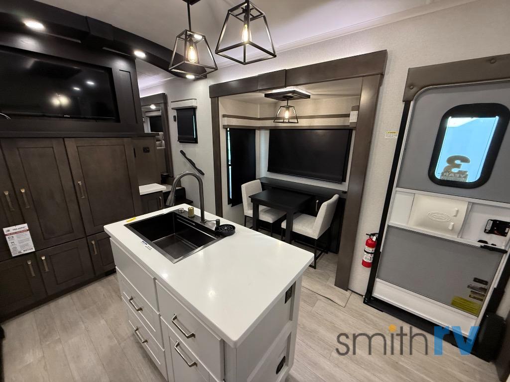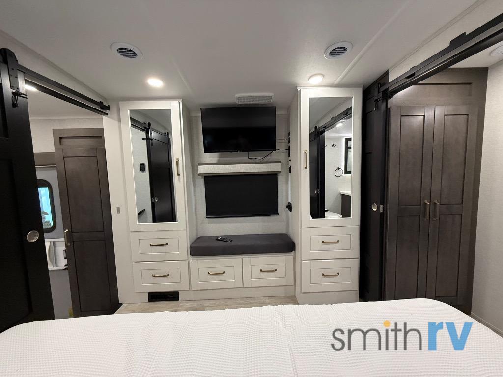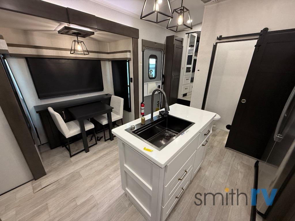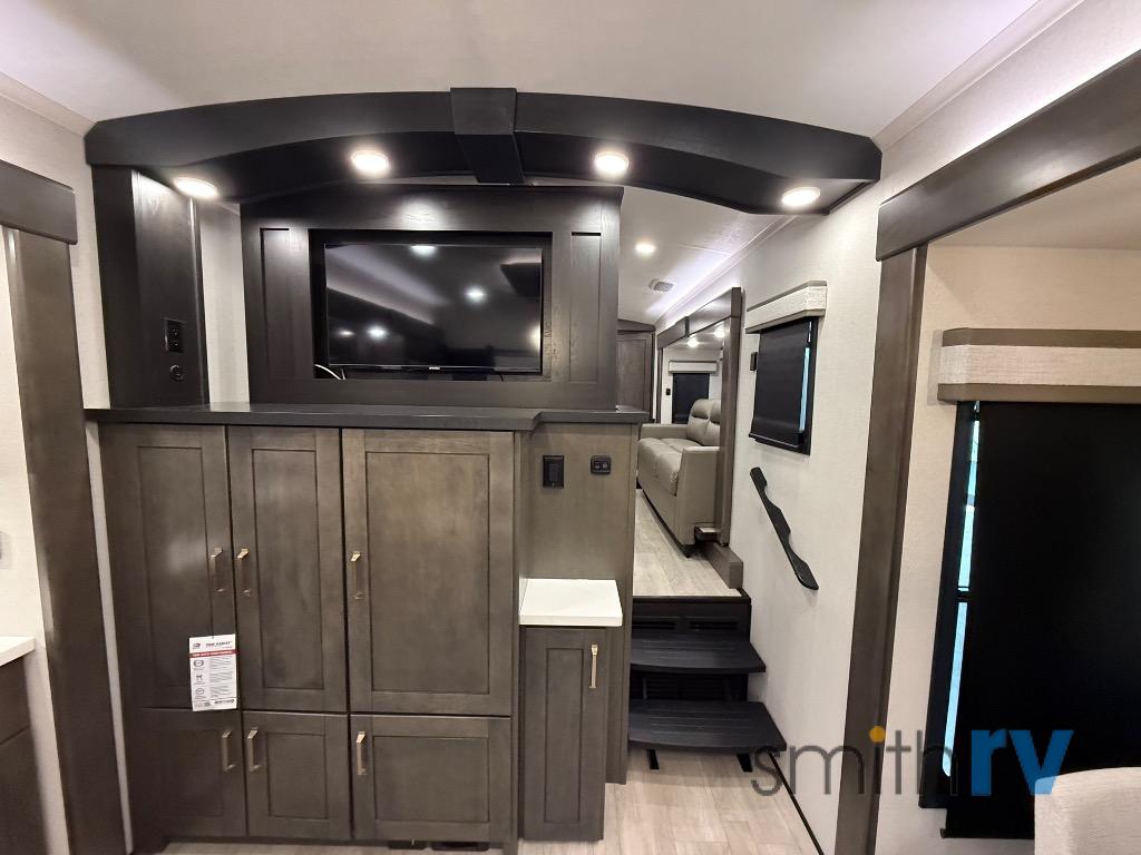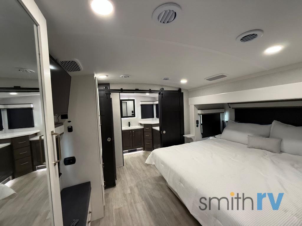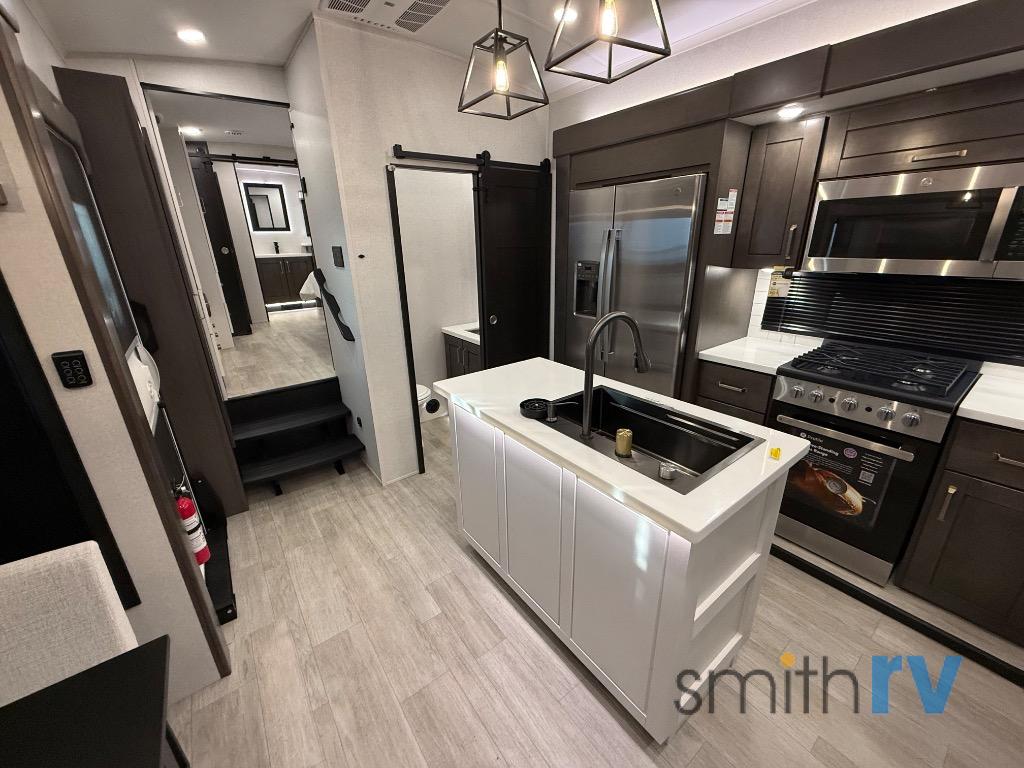 At the front of this 39FL fifth wheel, you’ll find a spacious front living area perfect for movie nights and relaxation. The dual opposing slides each feature an 82" sofa, providing both ample floor space and generous seating, while a theater seat at the very front offers even more comfort. Across the room, the entertainment center includes a cozy fireplace and convenient storage for board games. Moving to the center, the kitchen continues the open layout with its own dual opposing slides. One slide houses a 21-cu. ft. refrigerator, plenty of overhead cabinets, a 24" range, and a 30" convection microwave with a built-in air fryer, everything the on-the-road chef could need. The central kitchen island includes a sink and pull-out cutting board, while the opposite slide provides a dining table and chairs for enjoying meals together. A half bath and a pantry are also conveniently located here for added comfort. At the rear, the bedroom features a king-size 72" x 80" bed on the fifth slide, ensuring a restful night’s sleep. Across from the bed, a bench sits between two wardrobes, offering ample storage for clothing and essentials. Completing the layout, the full rear bathroom includes dual sinks set in an L-shaped counter, a spacious 36" x 48" shower with a seat for accessibility, and all the touches needed for comfort and ease on the road.