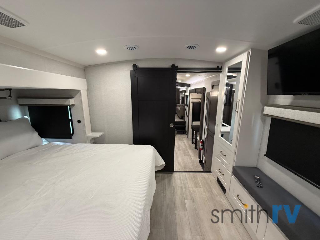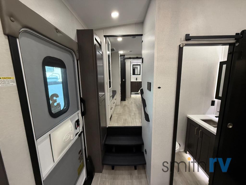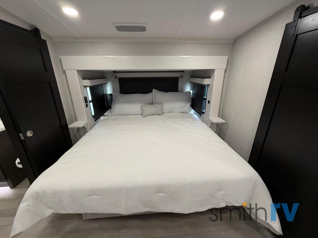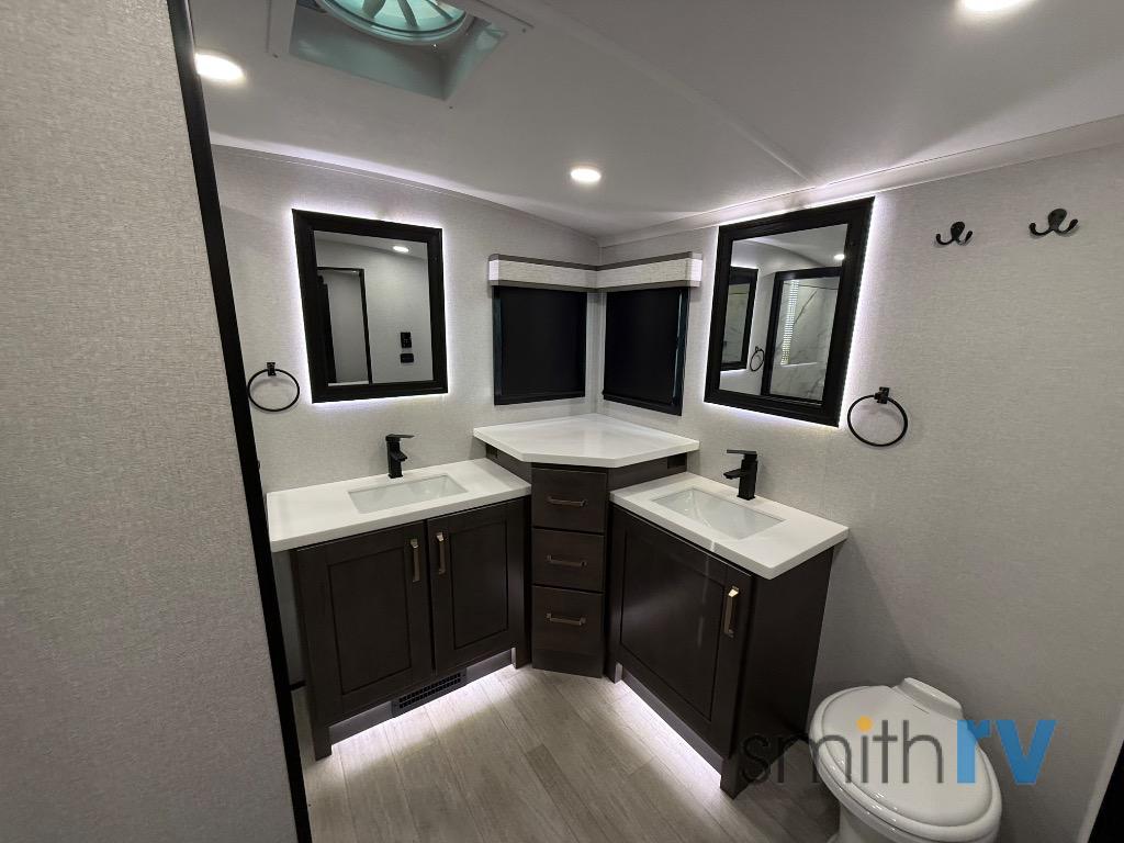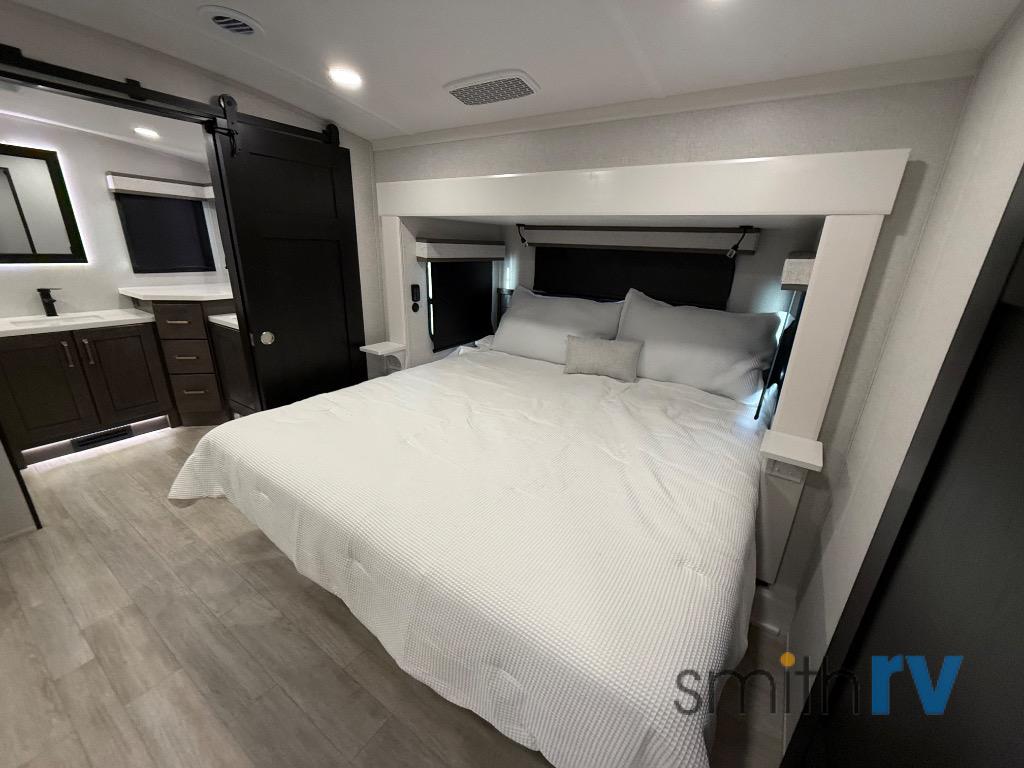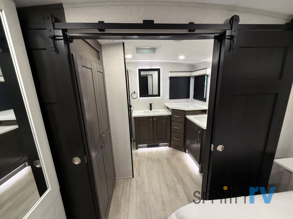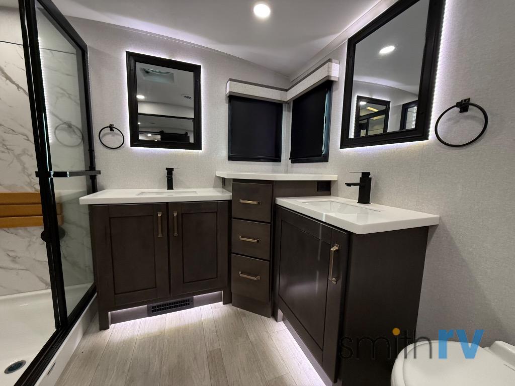 At the front of this 39FL fifth wheel, you’ll find a spacious front living area perfect for movie nights and relaxation. The dual opposing slides each feature an 82" sofa, providing both ample floor space and generous seating, while a theater seat at the very front offers even more comfort. Across the room, the entertainment center includes a cozy fireplace and convenient storage for board games. Moving to the center, the kitchen continues the open layout with its own dual opposing slides. One slide houses a 21-cu. ft. refrigerator, plenty of overhead cabinets, a 24" range, and a 30" convection microwave with a built-in air fryer, everything the on-the-road chef could need. The central kitchen island includes a sink and pull-out cutting board, while the opposite slide provides a dining table and chairs for enjoying meals together. A half bath and a pantry are also conveniently located here for added comfort. At the rear, the bedroom features a king-size 72" x 80" bed on the fifth slide, ensuring a restful night’s sleep. Across from the bed, a bench sits between two wardrobes, offering ample storage for clothing and essentials. Completing the layout, the full rear bathroom includes dual sinks set in an L-shaped counter, a spacious 36" x 48" shower with a seat for accessibility, and all the touches needed for comfort and ease on the road.