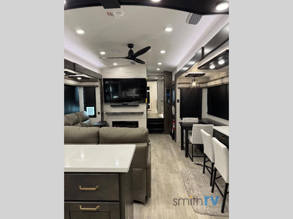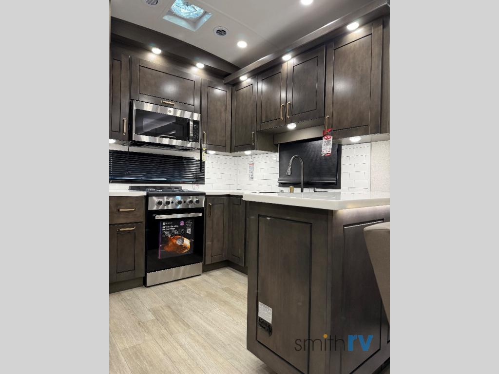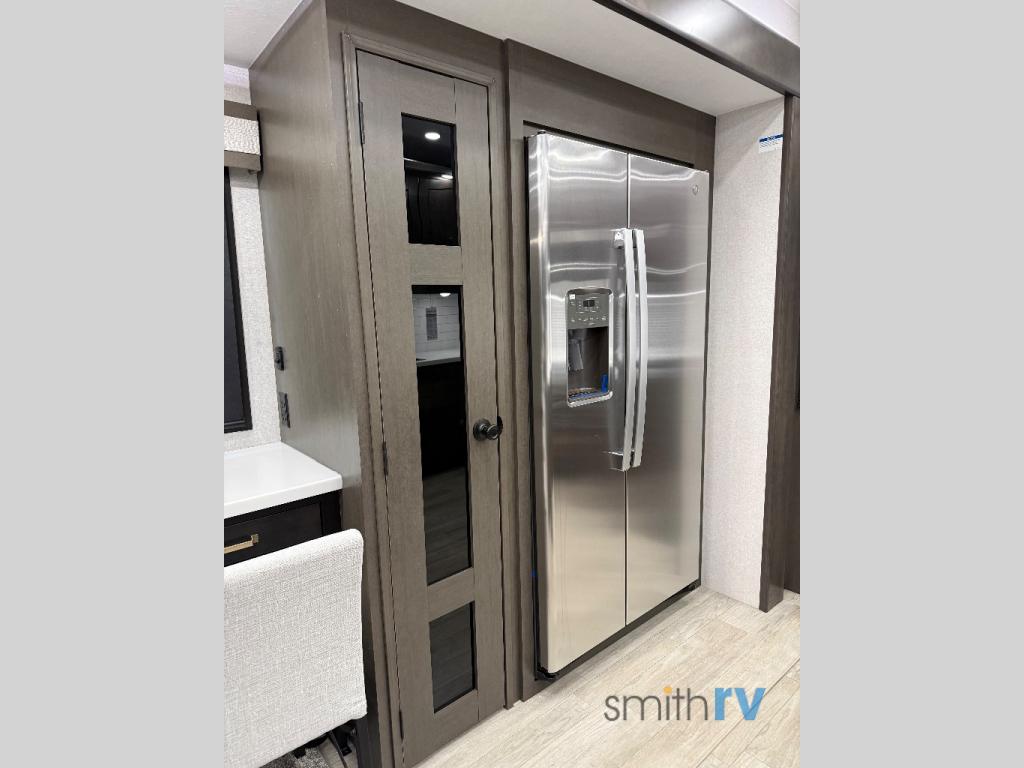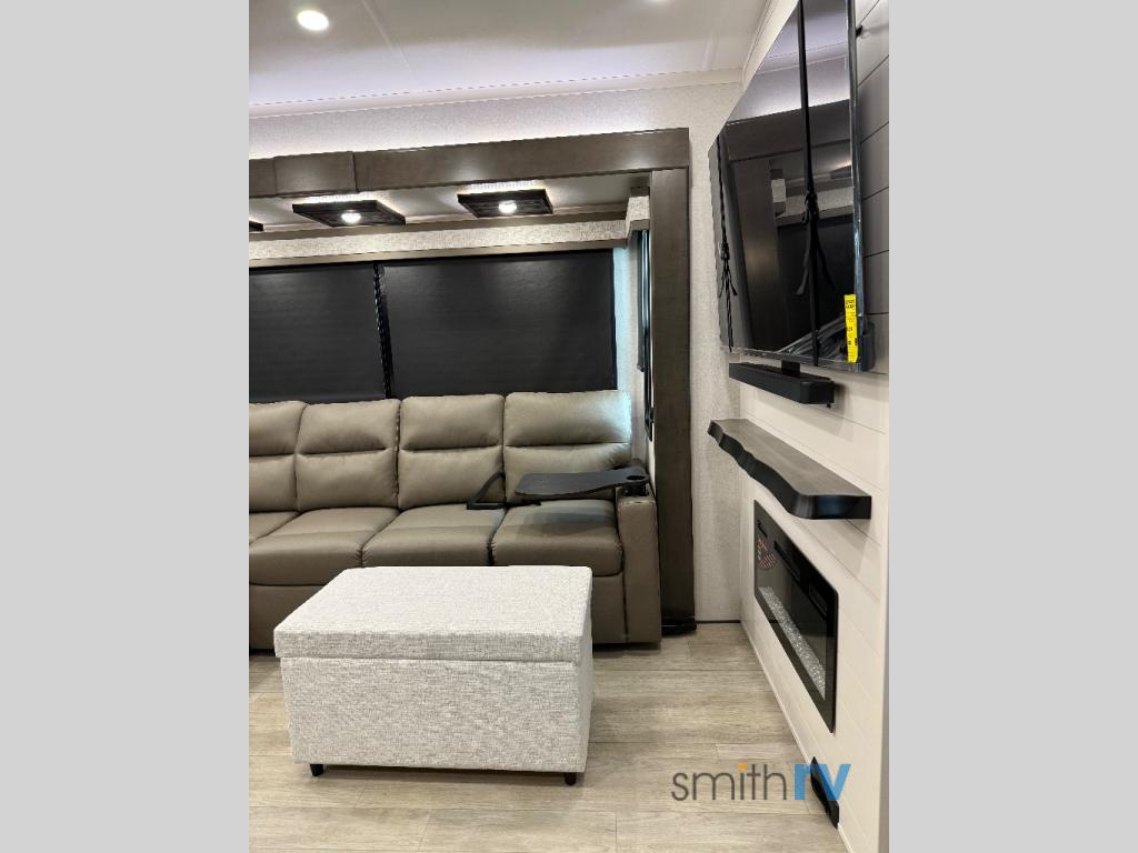 Starting from the back, this impressive 39RK features a rear kitchen designed in a convenient U-shape for easy accessibility and efficient meal prep. The kitchen is fully equipped with plenty of overhead cabinets, a convection microwave with an air fryer, a 24" range, and a pull-out pantry, perfect for the chef on the trip to cook in comfort. Across the kitchen, the large slide-out houses a 21-cu. ft. refrigerator and a second pantry with shelves, providing even more space to store groceries, snacks, and coffee essentials. The nearby desk/coffee bar and roll-out table create an inviting area to enjoy meals or unwind with a cup of coffee. The living area offers a spacious 100" L-shaped sofa and a theater seat facing the TV and fireplace, making it an ideal spot for relaxing or hosting movie nights. Moving forward, you’ll find a convenient half bathroom with linen shelves for added storage and accessibility. At the front, the private bedroom features a 72" x 80" king bed in a slide-out with a dresser across for ample storage. Finally, the full bathroom at the very front includes a 30" x 61" shower with a seat for comfort, a large sink, and a walk-in closet that provides generous space for all your clothing and gear.
