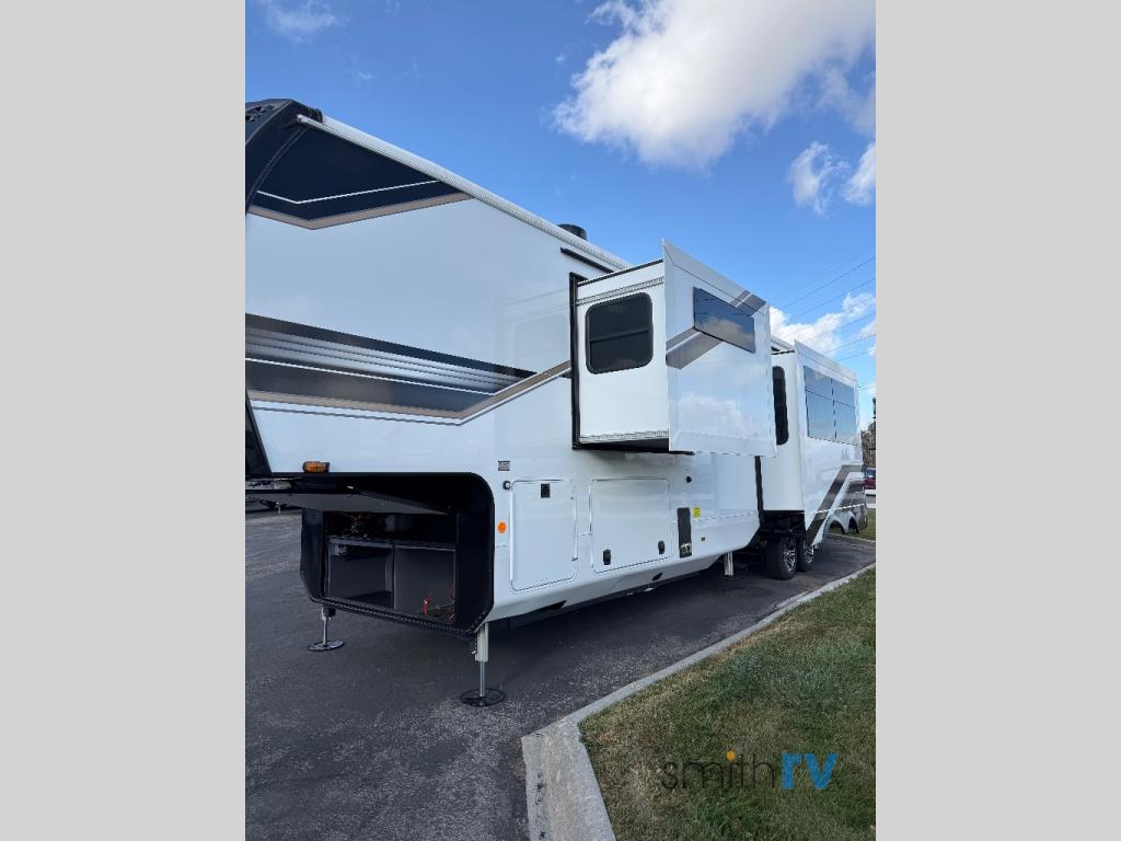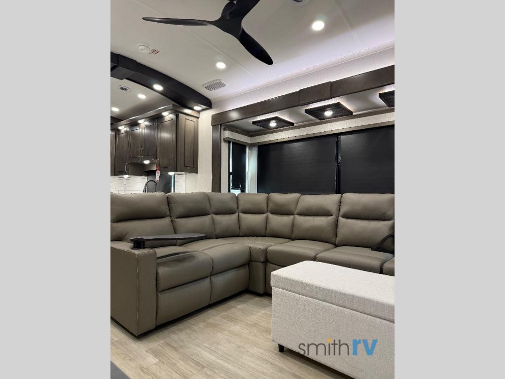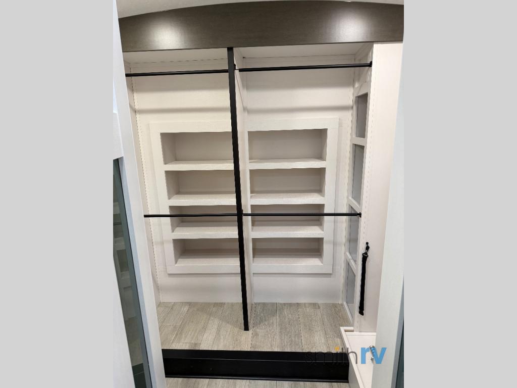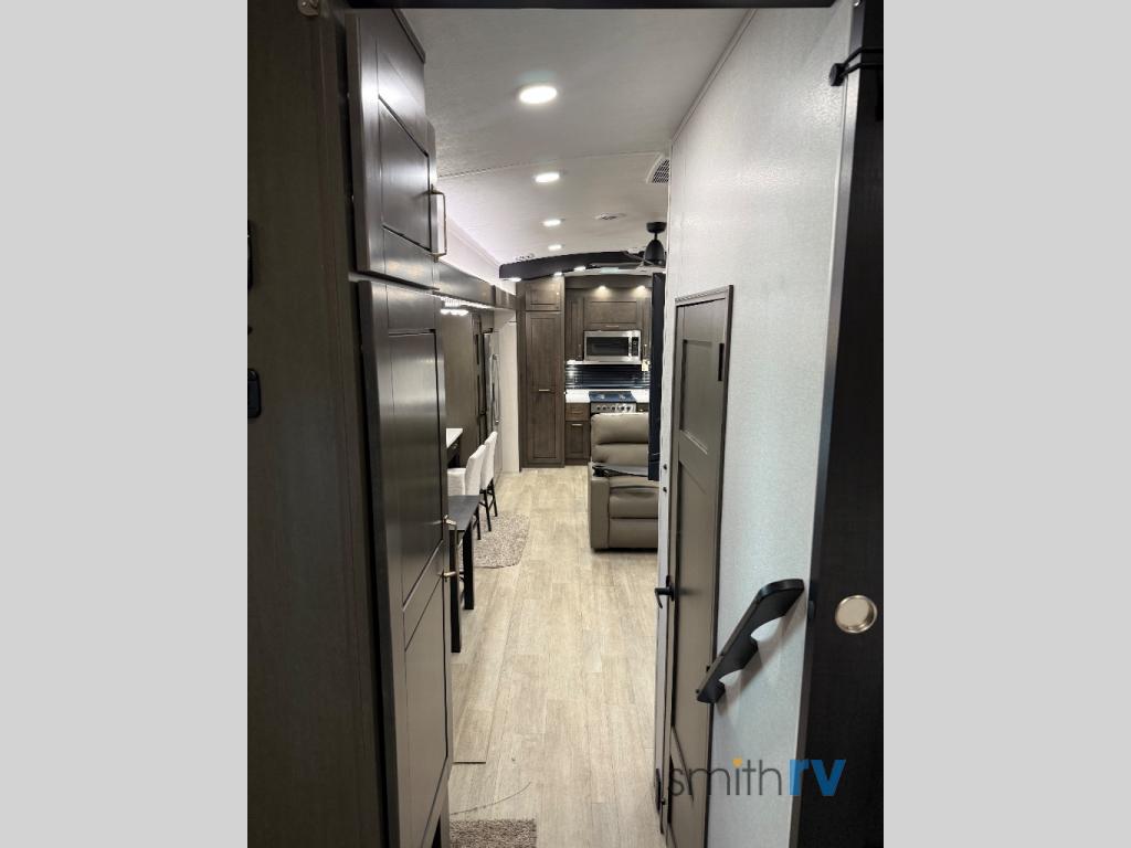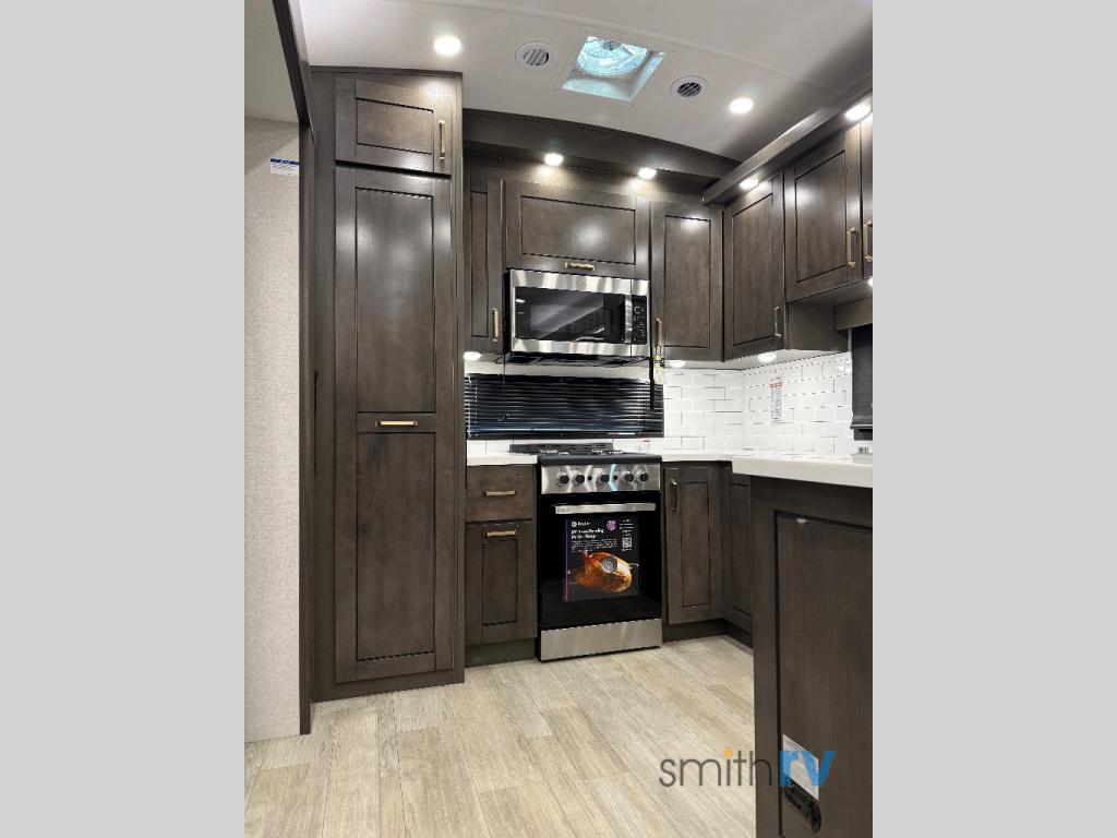 Starting from the back, this impressive 39RK features a rear kitchen designed in a convenient U-shape for easy accessibility and efficient meal prep. The kitchen is fully equipped with plenty of overhead cabinets, a convection microwave with an air fryer, a 24" range, and a pull-out pantry, perfect for the chef on the trip to cook in comfort. Across the kitchen, the large slide-out houses a 21-cu. ft. refrigerator and a second pantry with shelves, providing even more space to store groceries, snacks, and coffee essentials. The nearby desk/coffee bar and roll-out table create an inviting area to enjoy meals or unwind with a cup of coffee. The living area offers a spacious 100" L-shaped sofa and a theater seat facing the TV and fireplace, making it an ideal spot for relaxing or hosting movie nights. Moving forward, you’ll find a convenient half bathroom with linen shelves for added storage and accessibility. At the front, the private bedroom features a 72" x 80" king bed in a slide-out with a dresser across for ample storage. Finally, the full bathroom at the very front includes a 30" x 61" shower with a seat for comfort, a large sink, and a walk-in closet that provides generous space for all your clothing and gear.