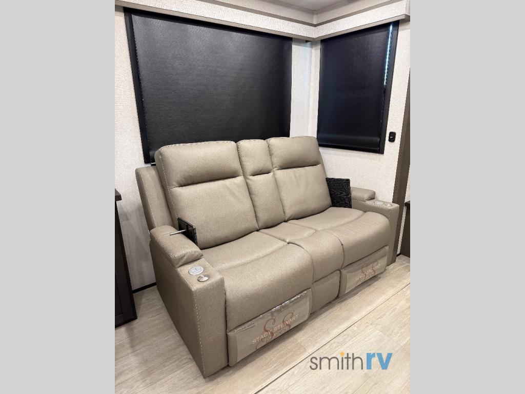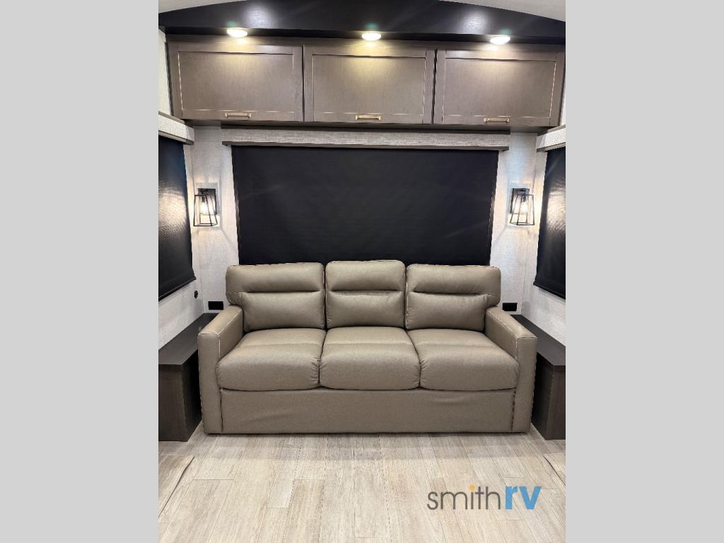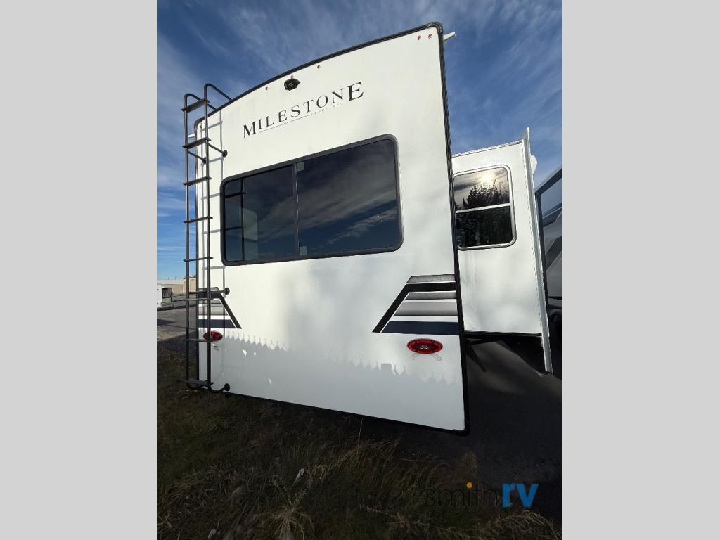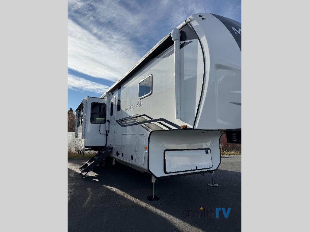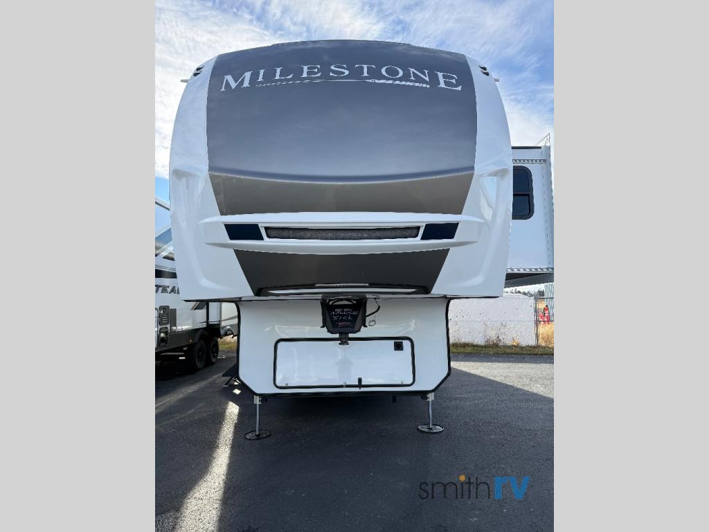 You'll be able to see the country in full luxury with this Milestone fifth wheel! There is a private bedroom in the front with a king-size bed where you can sleep comfortably each evening.The kitchen has all the appliances you will need to make the most out of your trips featuring a convection microwave, 21” oven, and a 16 cu. ft. 12V refrigerator. The living room will make for a great entertaining area, you can relax on the 78" hide-a-bed sofa that will serve as a bed so you can sit back and even have a nap! There is a full bathroom that has a 30" by 48" shower to freshen up each day. This RV has a wonderful design featuring dual opposing slides that will make for the real residential experience and make the most out of your travel.