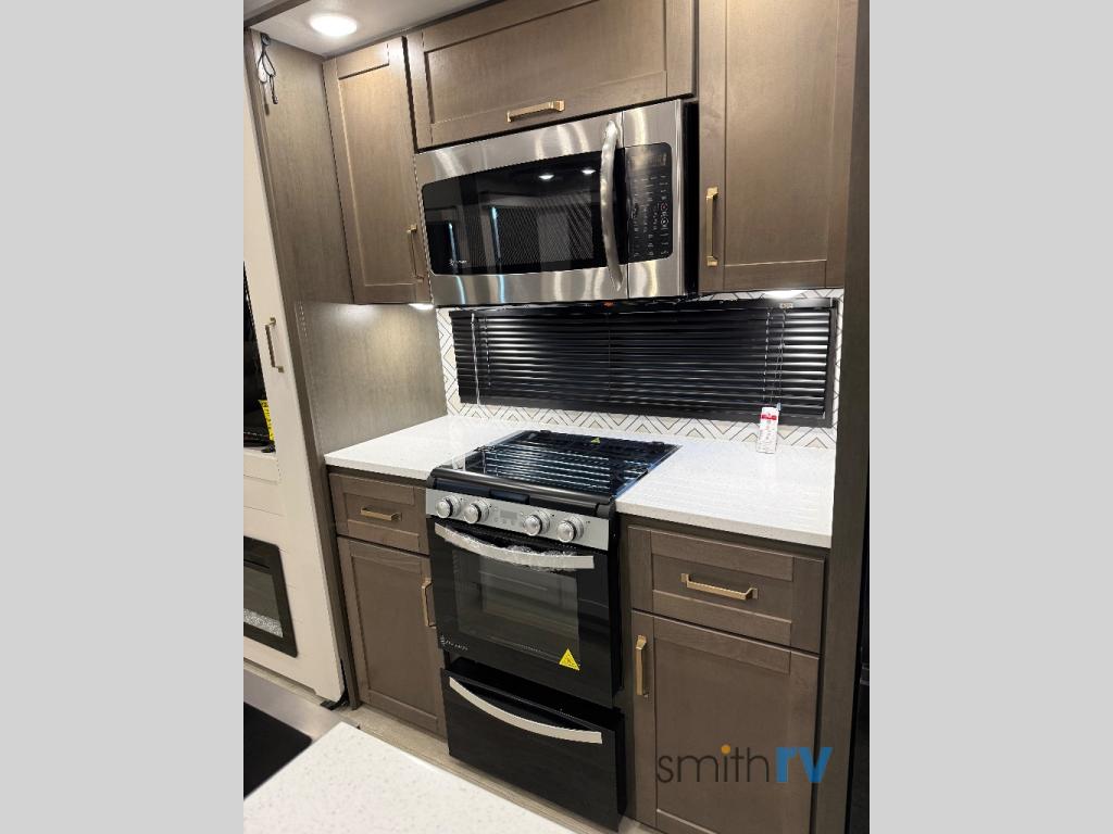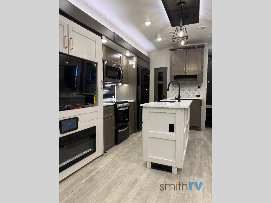 The Heartland Milestone is a full-profile luxury fifth wheel that is ready to help you make the most of your adventures! You will find a TrussTXL Roof System with Alpha roof membrane system offering quality exterior protection, and the Power Up Solar that includes a 200 watt solar panel will let you go off-grid when the adventure calls for it. The upgraded MORryde Step Above entrance steps will help you enter your unit with ease, and the 6-point hydraulic auto-leveling system comes standard to help you keep your unit secure while camping. The interior kitchen has some great features, like residential solid surface countertops and a large farmhouse sink. There are roller night shades throughout each unit to have privacy and comfort.