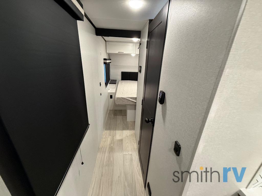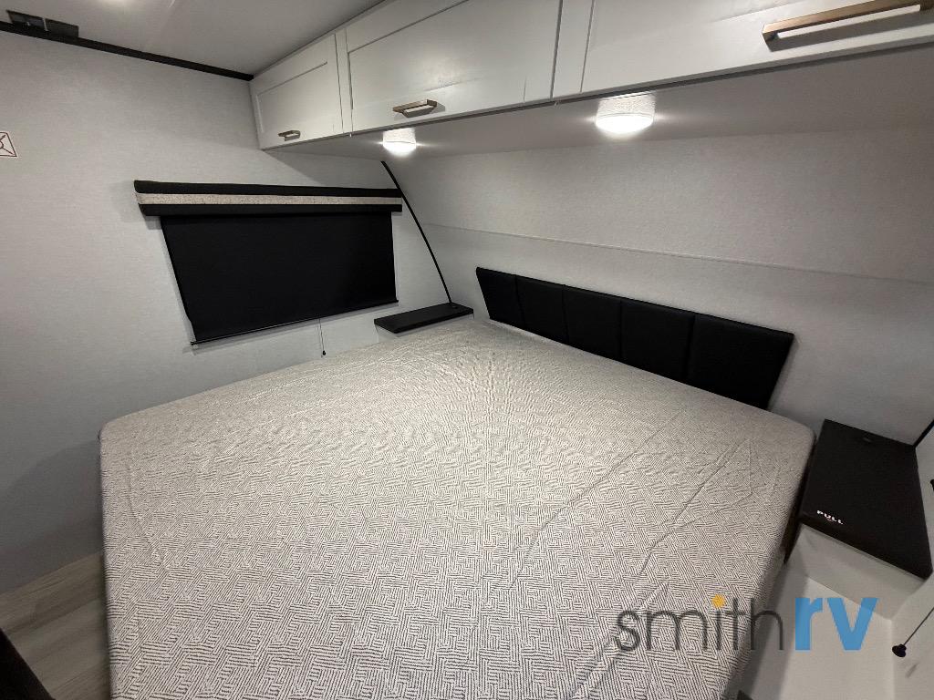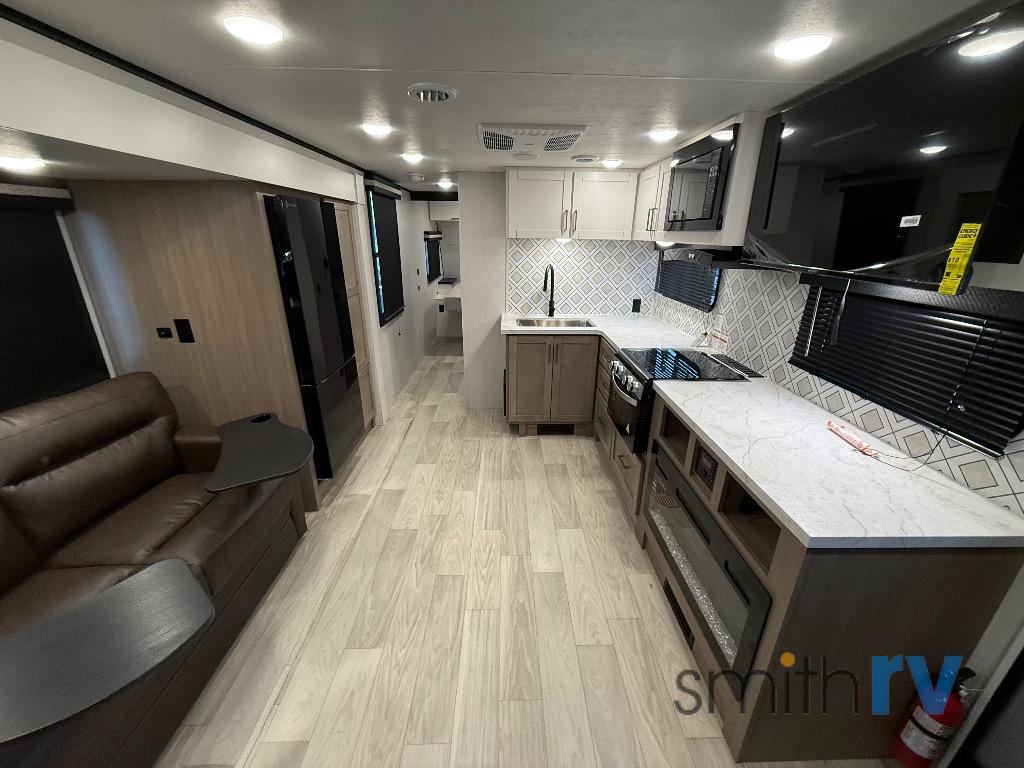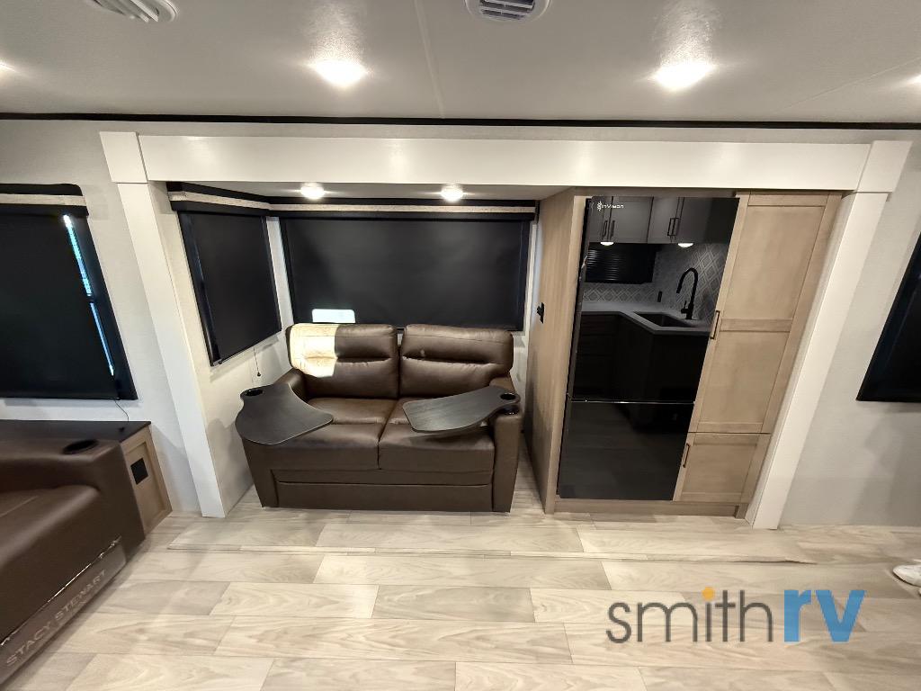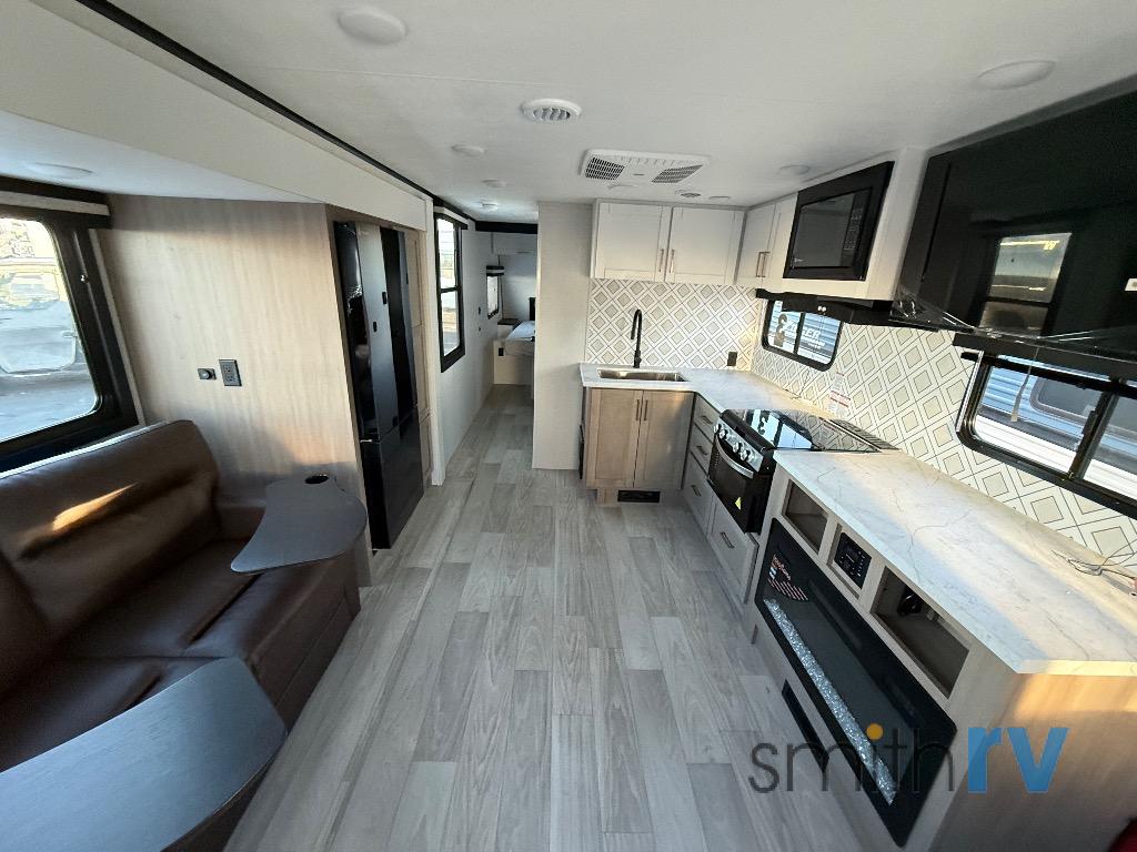 At the front of this trailer, the private bedroom features a 60" x 80" queen bed with nightstands on each side, perfect for storing your essentials, and includes one of the two convenient entry doors. Just down the hall, the full bathroom offers a 30" x 36" shower, a foot-flush toilet, and a linen closet to keep towels and toiletries organized. In the center, a large slide-out provides spacious seating with a 40" x 70" dinette ideal for meals, game nights, or gathering with family alongside an 11 cu. ft. refrigerator and pantry for storing all your food and snacks. At the rear, you'll find a roomy 75" theater seat with end tables on both sides, offering a perfect place to relax. Across from the dinette, the fully equipped kitchen includes a stainless-steel sink, microwave, and overhead cabinets for added storage. The second entry door is also located here, offering easy access to the living area and kitchen.