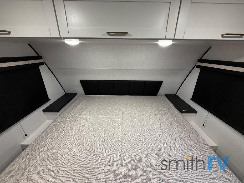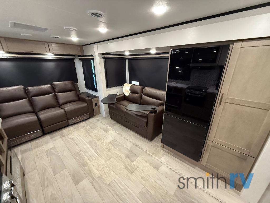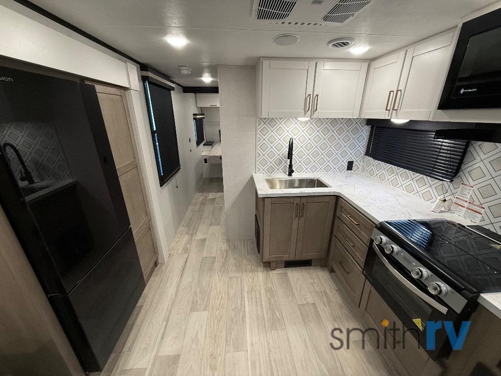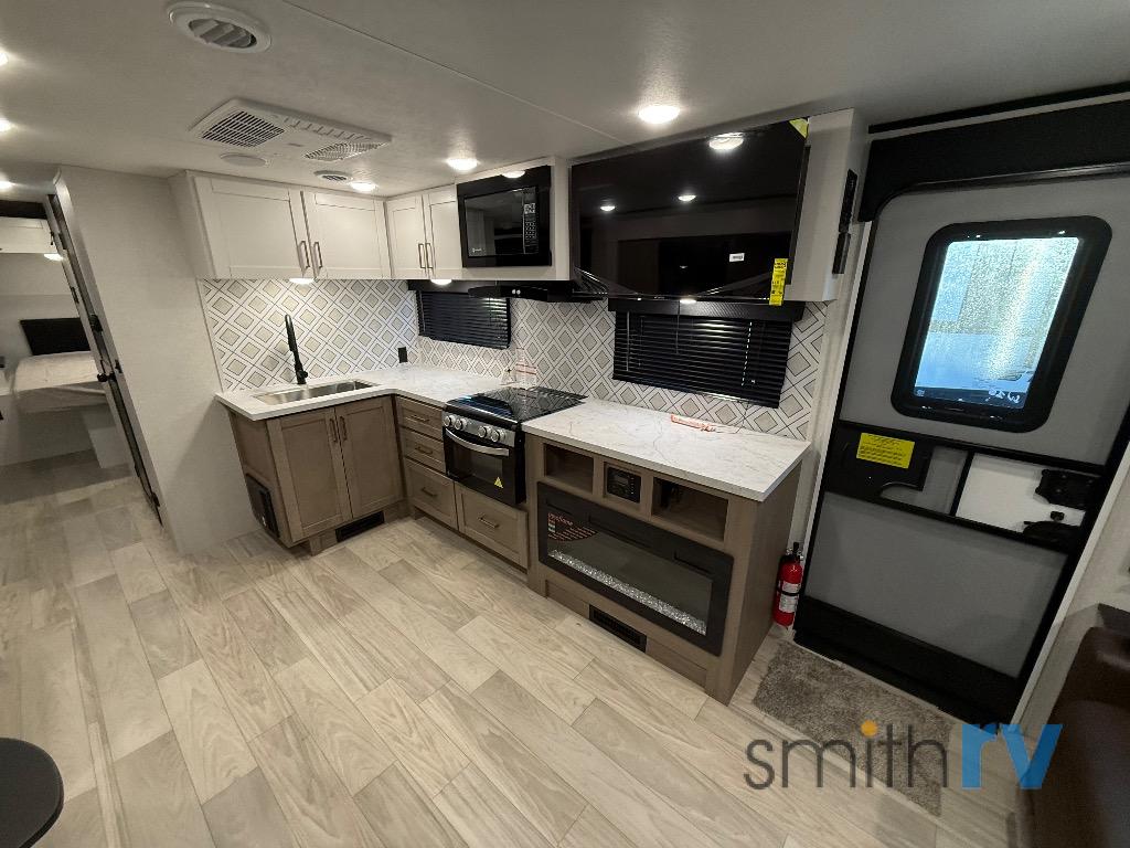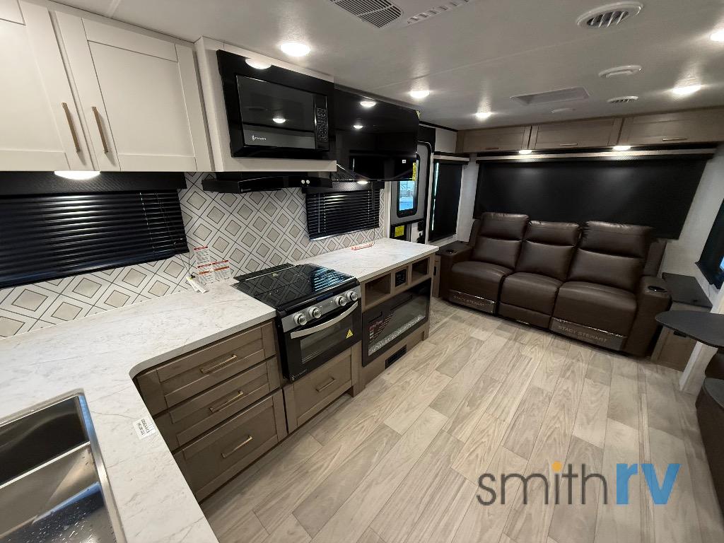At the front of this trailer, the private bedroom features a 60" x 80" queen bed with nightstands on each side, perfect for storing your essentials, and includes one of the two convenient entry doors. Just down the hall, the full bathroom offers a 30" x 36" shower, a foot-flush toilet, and a linen closet to keep towels and toiletries organized. In the center, a large slide-out provides spacious seating with a 40" x 70" dinette ideal for meals, game nights, or gathering with family alongside an 11 cu. ft. refrigerator and pantry for storing all your food and snacks. At the rear, you'll find a roomy 75" theater seat with end tables on both sides, offering a perfect place to relax. Across from the dinette, the fully equipped kitchen includes a stainless-steel sink, microwave, and overhead cabinets for added storage. The second entry door is also located here, offering easy access to the living area and kitchen.