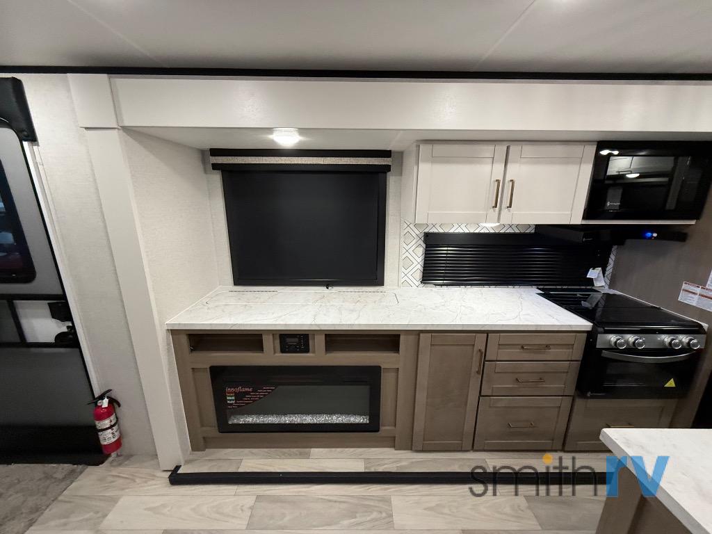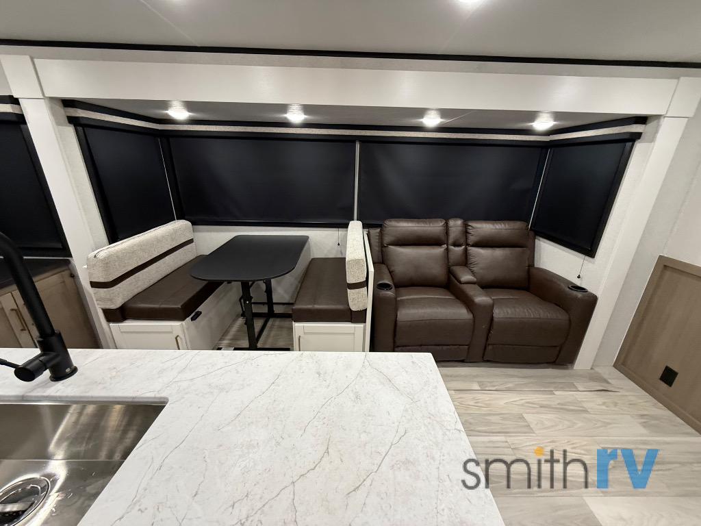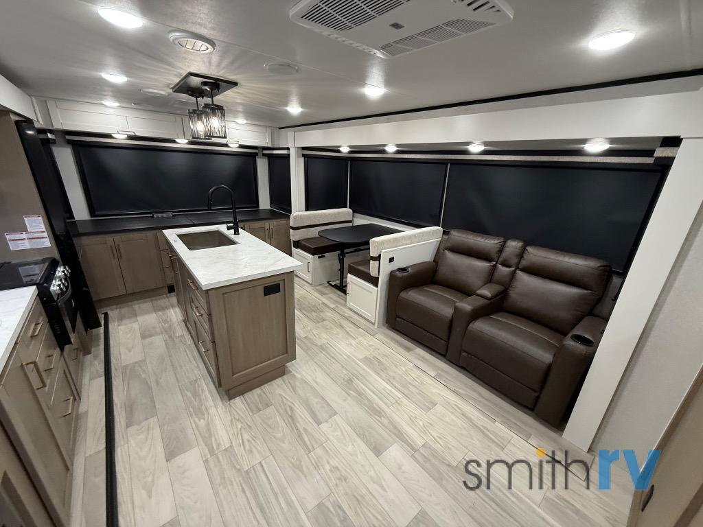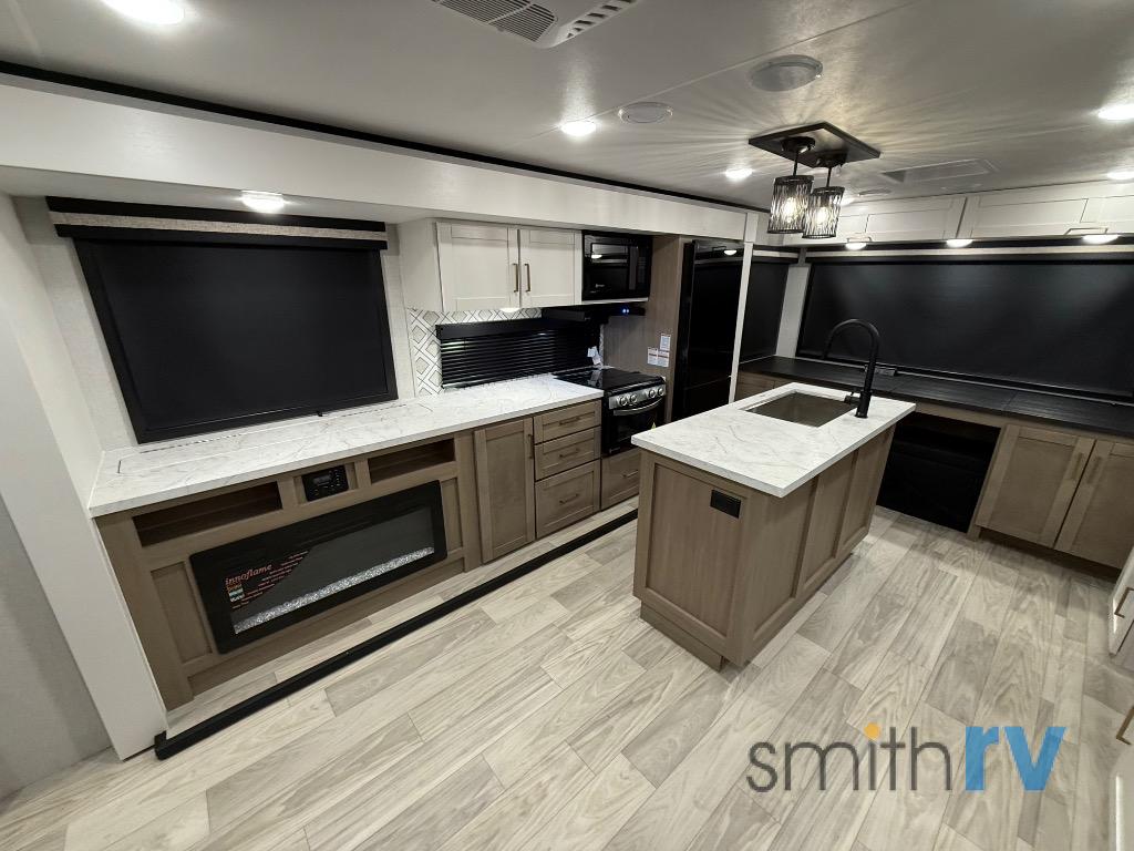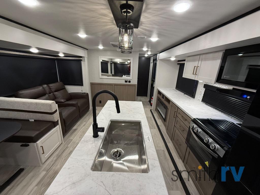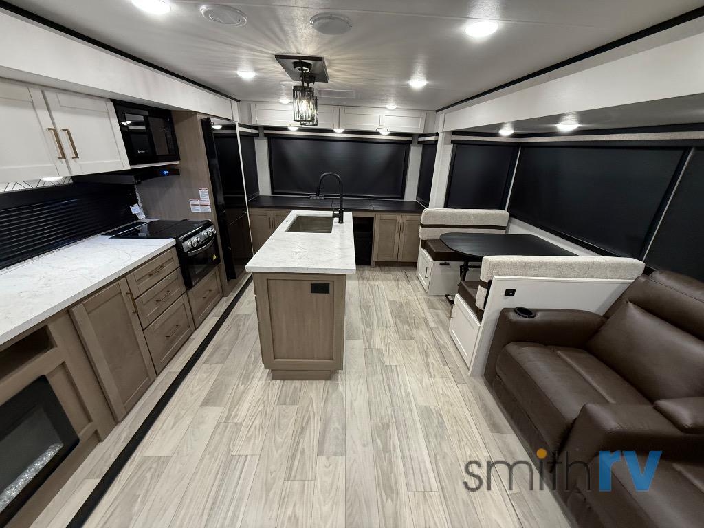 At the front, you'll find a private bedroom featuring a spacious 60" x 80" queen bed, in between nightstands on each side and overhead cabinets for convenient storage of your essentials. Moving down the hall, the full bathroom offers a 30" x 36" shower, a linen closet, and a medicine cabinet, perfect for keeping towels and skincare neatly organized. In the center of the space lies the kitchen and living area, enhanced by dual opposing slides that significantly open up the room for added comfort and functionality. One slide houses a 40" x 70" dinette ideal for meals or game nights, while a 60" tri-fold sofa provides a cozy lounging area, with both converting into additional sleeping space when needed. Centrally located, the kitchen island includes a sleek stainless-steel sink, while the opposing slide features a fully equipped kitchen with a three-burner cooktop, microwave, seamless countertops, and overhead cabinets for ample storage. For entertainment, a pop-up TV in the entertainment center ensures you can enjoy movie nights from the comfort of the sofa. At the rear, a dedicated desk with an ottoman creates a perfect nook for studying or working from home.