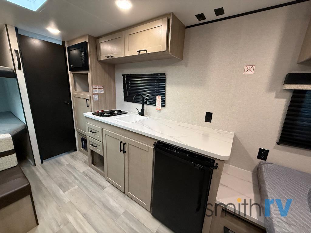 Camping trips are made easy in this Lynx Edition travel trailer with double-size bunk beds for guests or little ones. You'll find the front queen bed for a great night's rest, along with a nightstand and a wardrobe to keep your things tidy. The rear corner private bath includes a foot-flush toilet and a 40" shower, so you won't have to leave the camper in the middle of the night. A two-burner cooktop and microwave oven will let you make meals each day, and you can dine at the L-shaped dinette or play games in the evening!