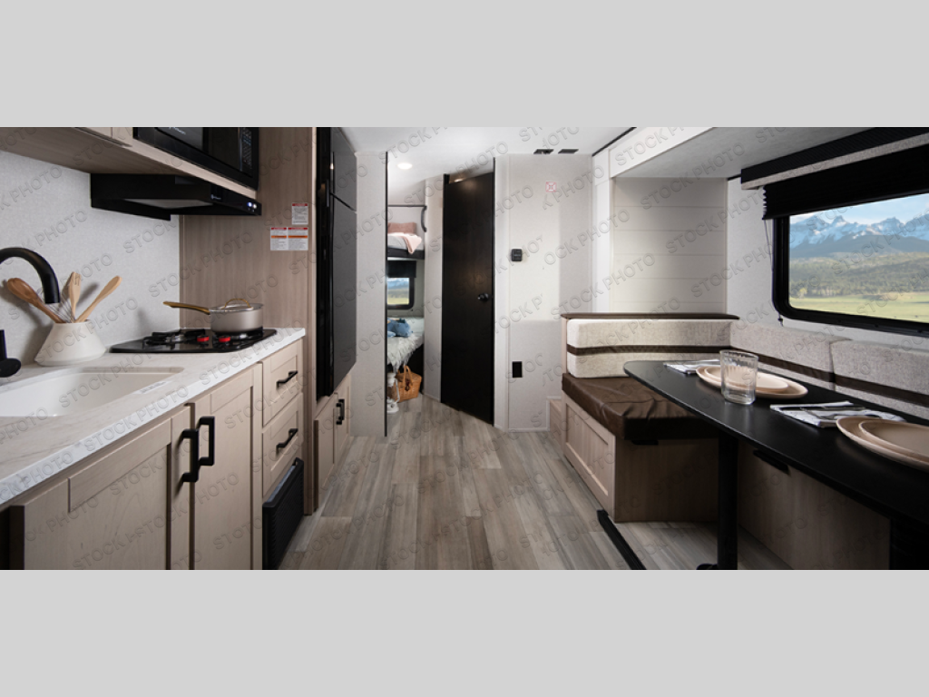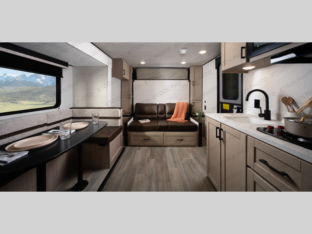 Camping trips are made easy in this travel trailer with double-size bunk beds for guests or little ones. There is a front Murphy bed that will provide you with more space during the day when you put it away to reveal the jack knife sofa. The rear corner full bath includes a foot-flush toilet, a 30" x 36" shower and a sink, so you won't have to leave the camper in the middle of the night. A two-burner cooktop and microwave oven will let you make meals each day, and you can dine around the U-shaped dinette, which is also within a slide out for more space!